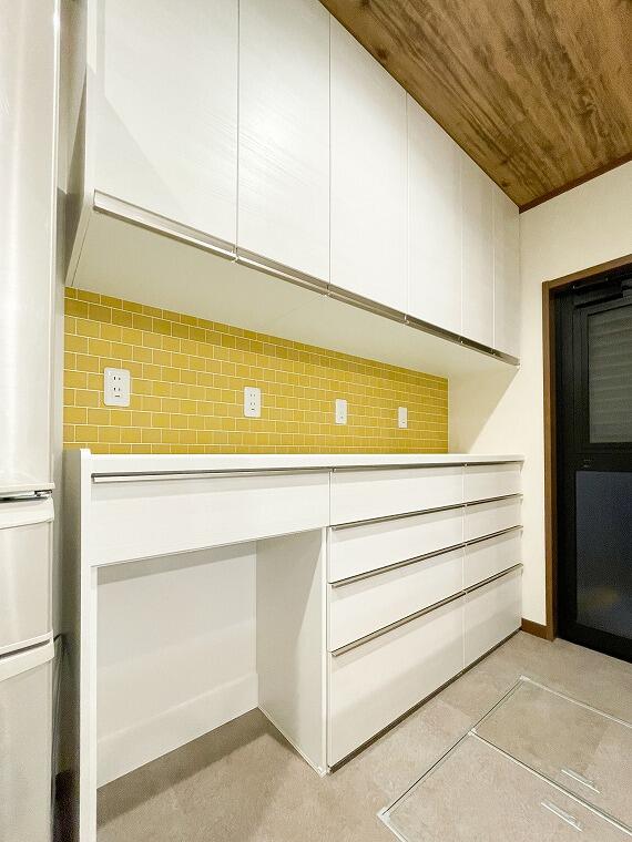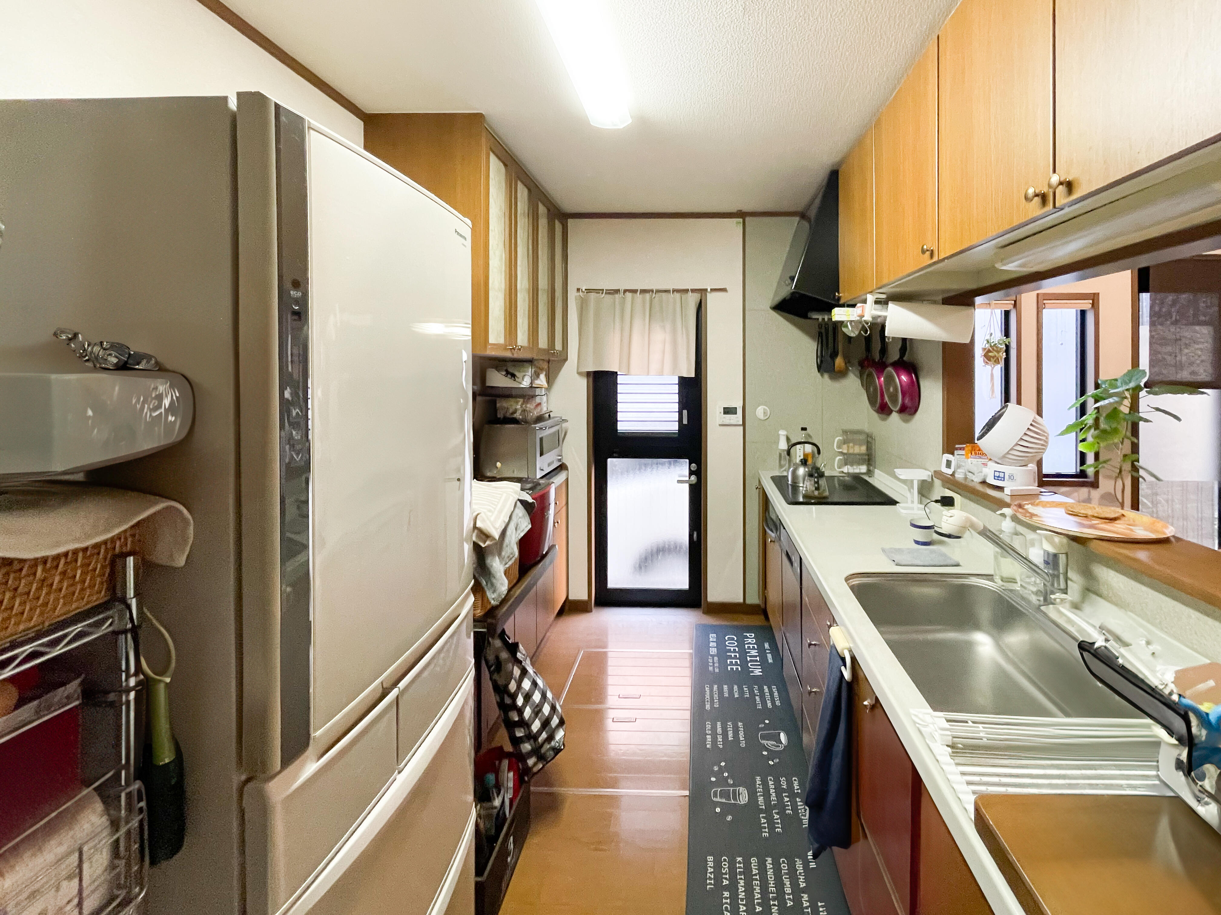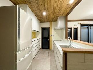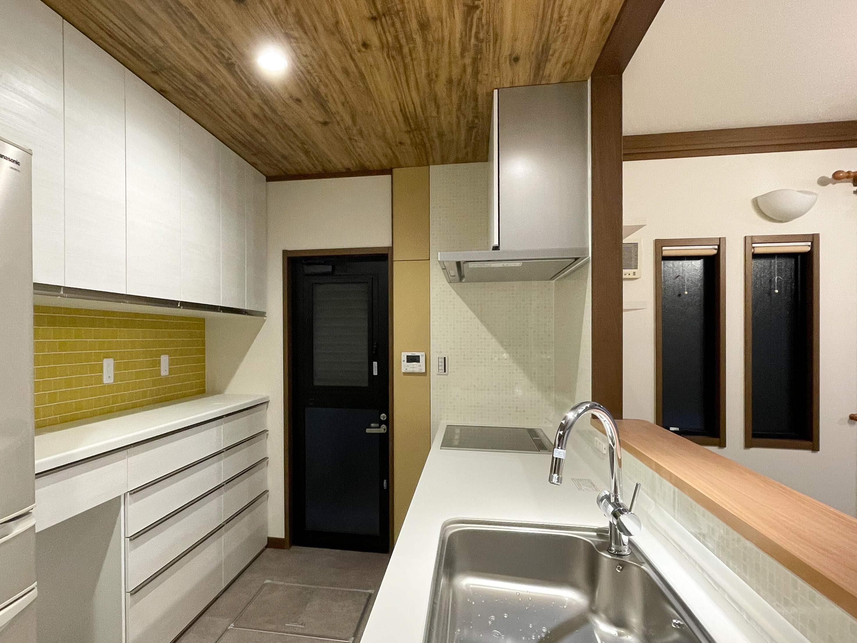 リビングとの一体化で吊り戸と壁をとり、すっきりとしたキッチン空間になりました。