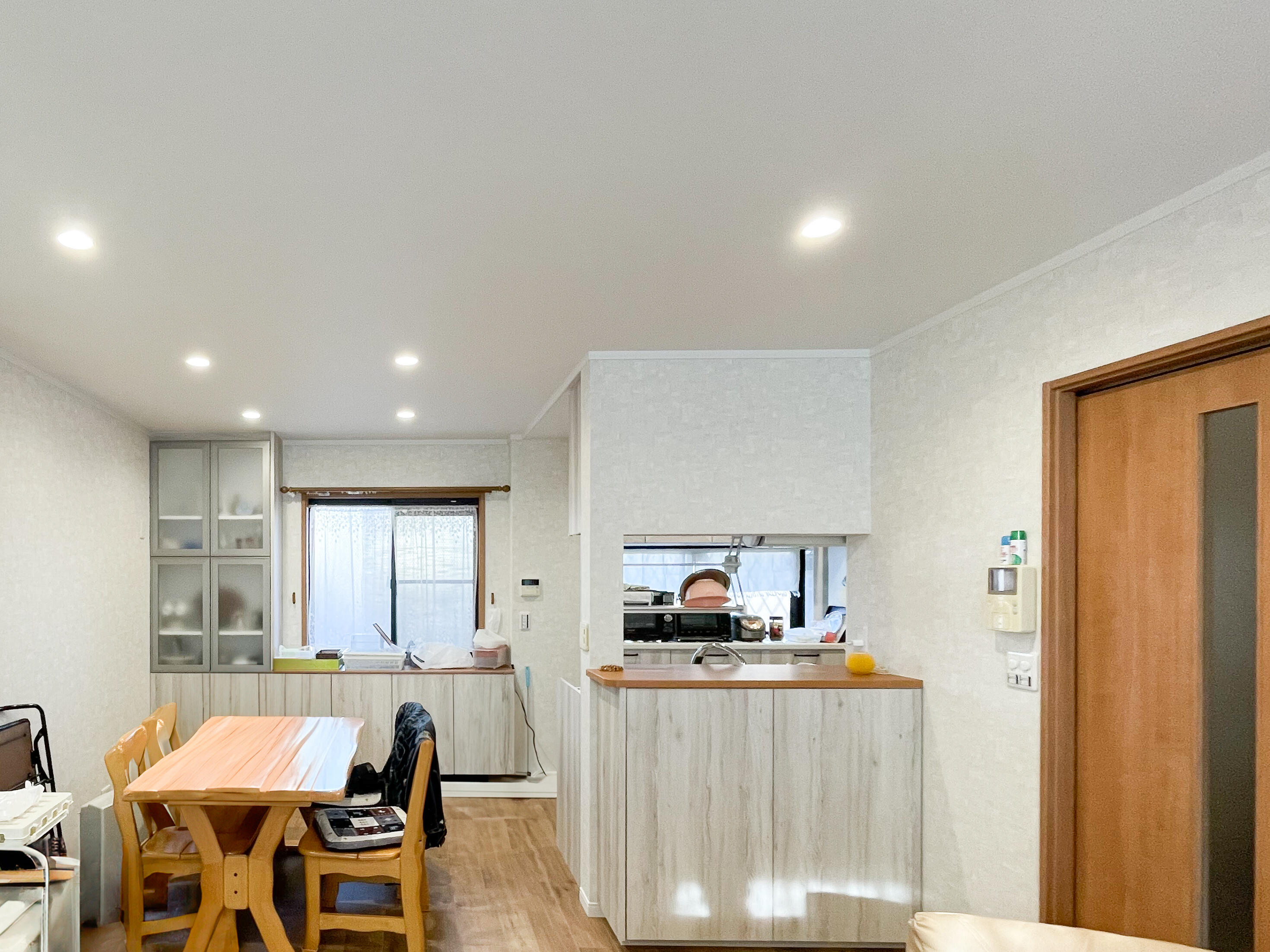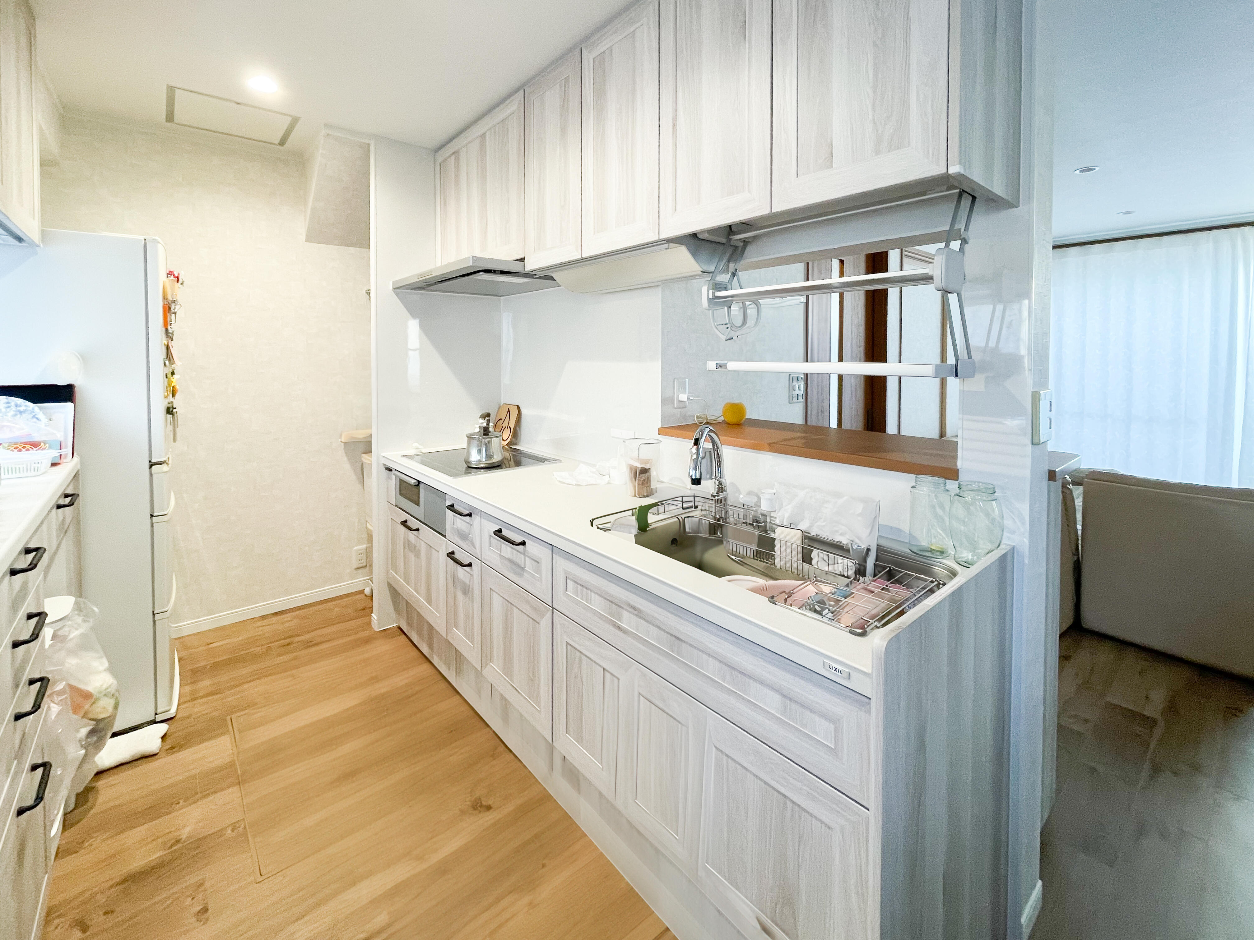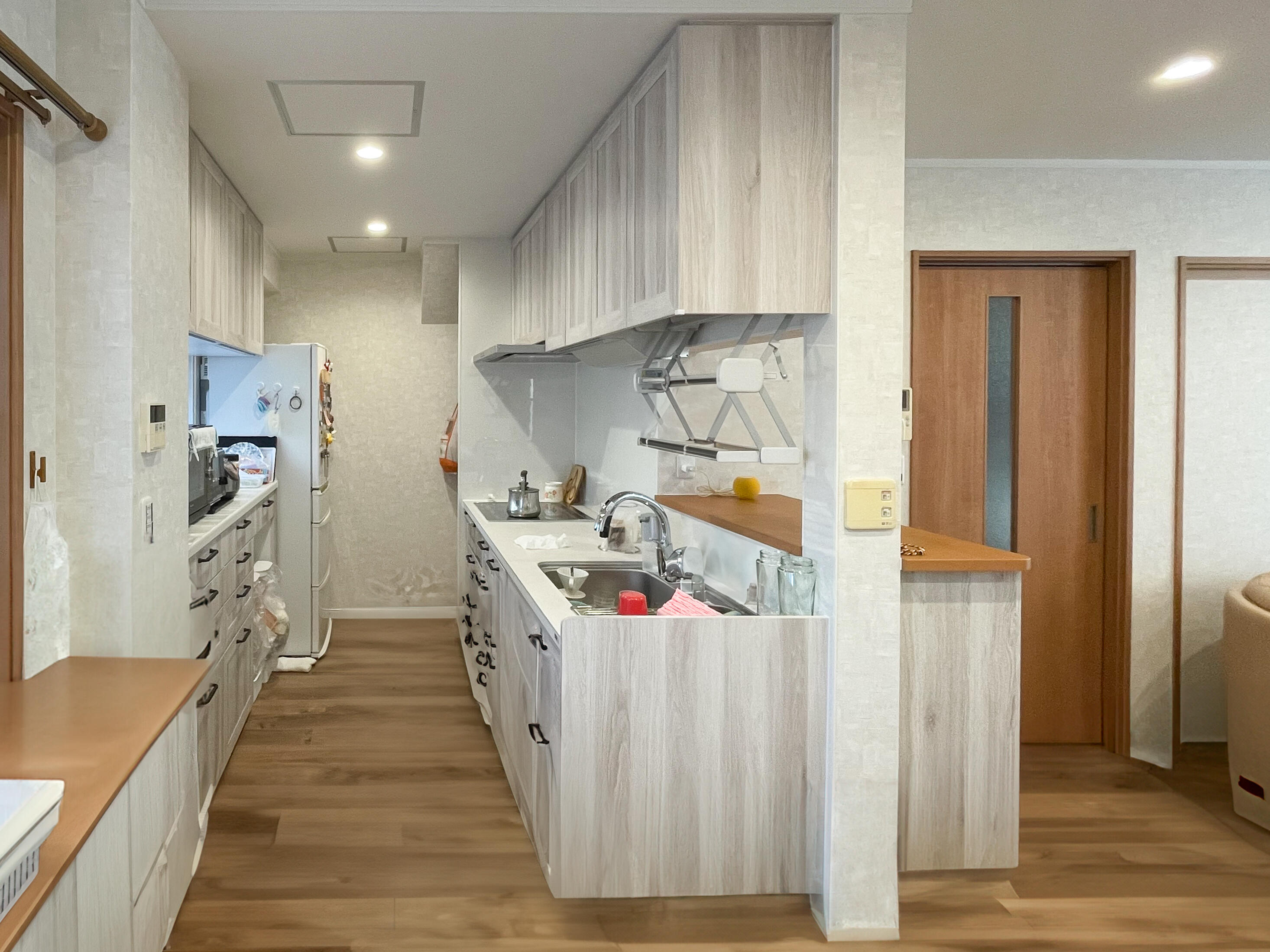 キッチンスペースは以前は半独立型の壁付けI型キッチンでしたが、壁を解体し対面タイプにすることで、ご家族との時間を過ごしながら家事をしていただけるようになりました。