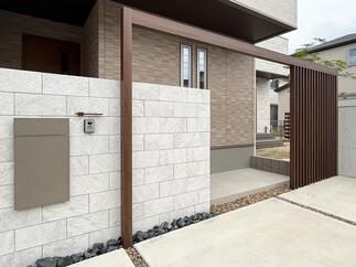 ある程度ご希望のイメージは持たれており、塀と縦格子を使ってオシャレにしたいとのことでした。 全てをタイルで仕上げるとなると重たい印象になるかと思い玄関前の門塀はタイルで仕上げ、デッキ部分はパネル仕上げにしました。 デッキ部分とアーチ部分は縦格子で揃えて、統一感とリビングのテラス窓の目隠しの役割もはたしています。