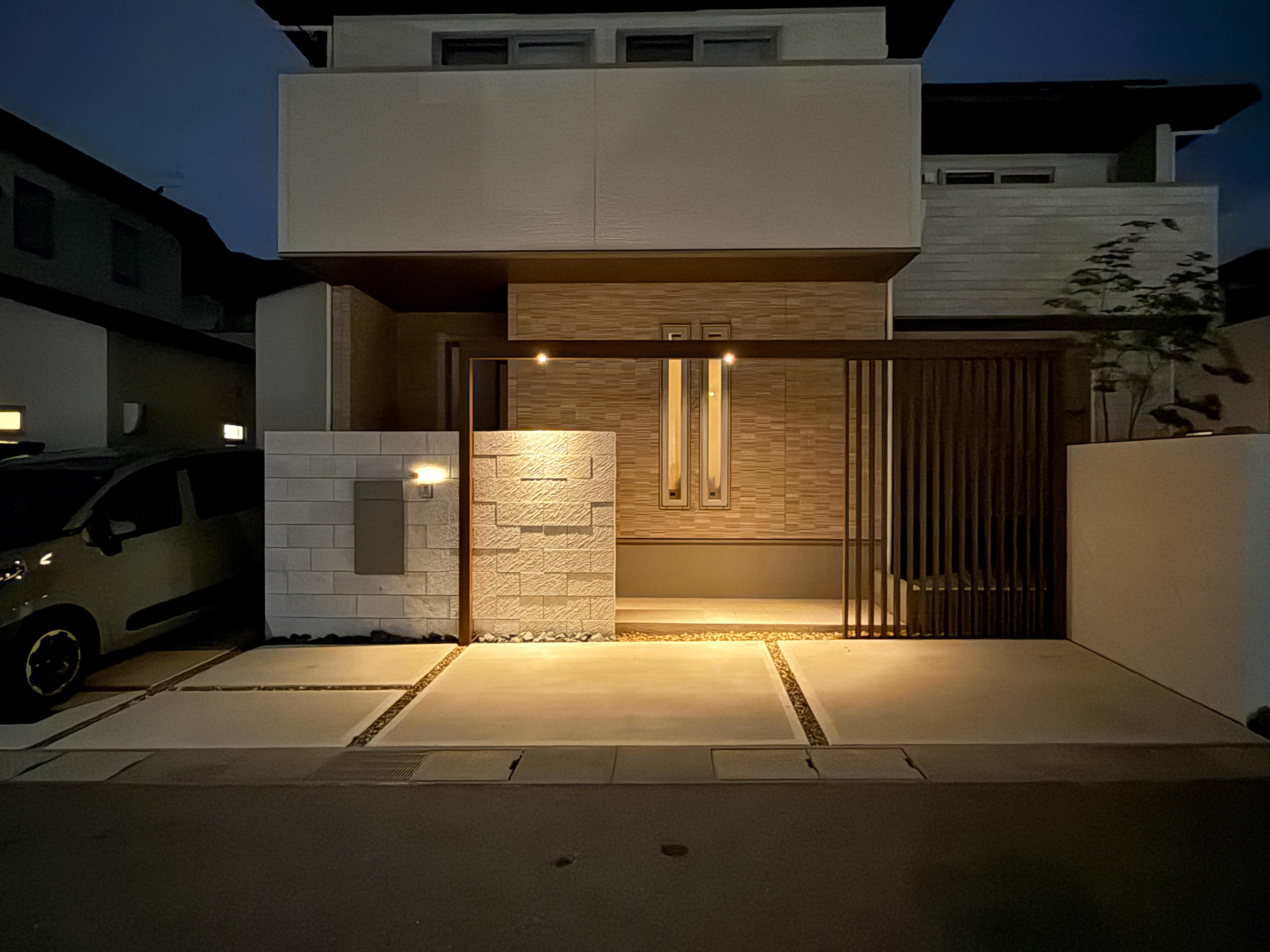 日が落ちたあとの、ライトアップされた外構も品があります。外構が変わるとお家の印象もかわり、素敵な外構が完成しました。