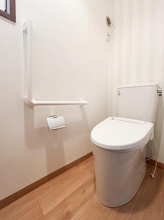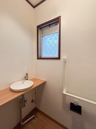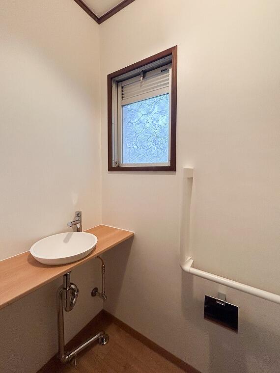 お客様も利用されるため、明るく清潔感のある空間にインテリアもまとめました。トイレ:アメージュ(LIXIL)