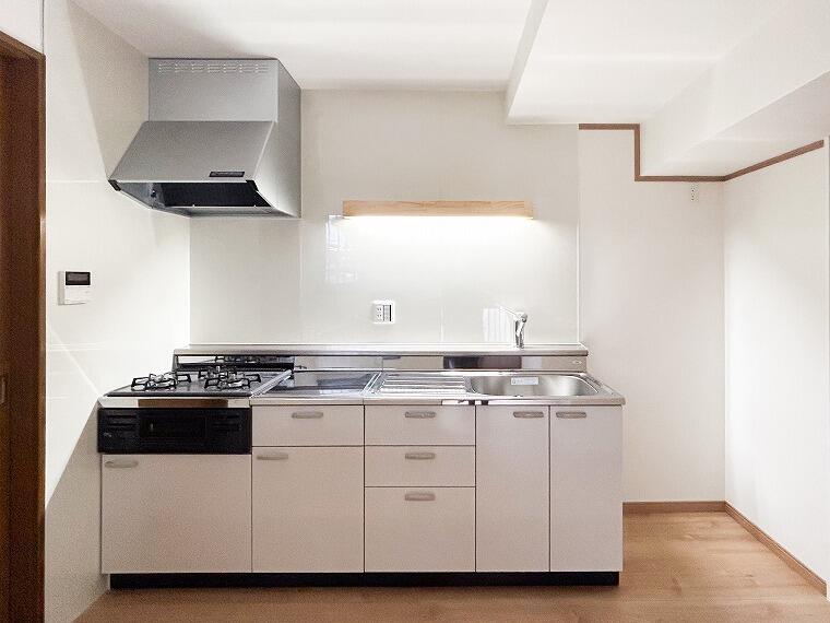 生活をする場ではないため、お料理の機会はほとんどないとのことでしたので、機能や掃除のしやすさではなく、基本の機能があること、コスト、部分交換ができるなどのことを考えセクショナルキッチンを選びました。明るい色を選んだため、空間が明るくなりました。セクショナルキッチン GSシリーズ(LIXIL)ライトグレー