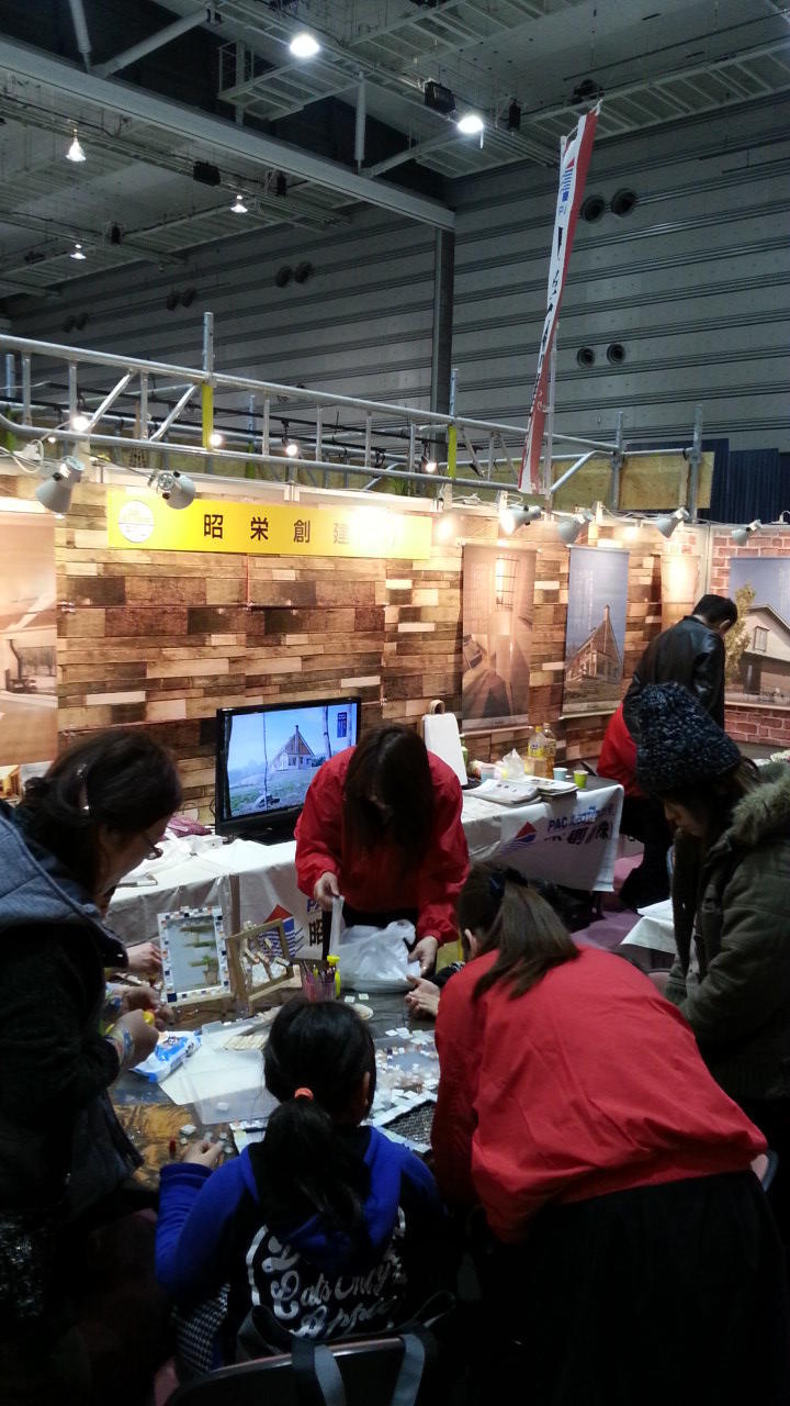 昭栄創建のブースでは、新築やリフォームの家づくりのご相談や、お子様向けタイル工作、木工小物の販売、