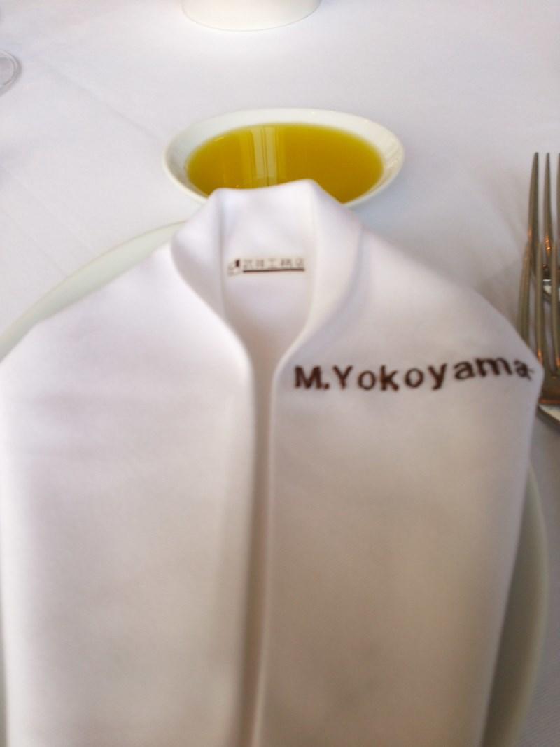 ナプキンには各自の名前が刺繍され、シャツに見立ててたたまれました。襟元にも会社のロゴ。