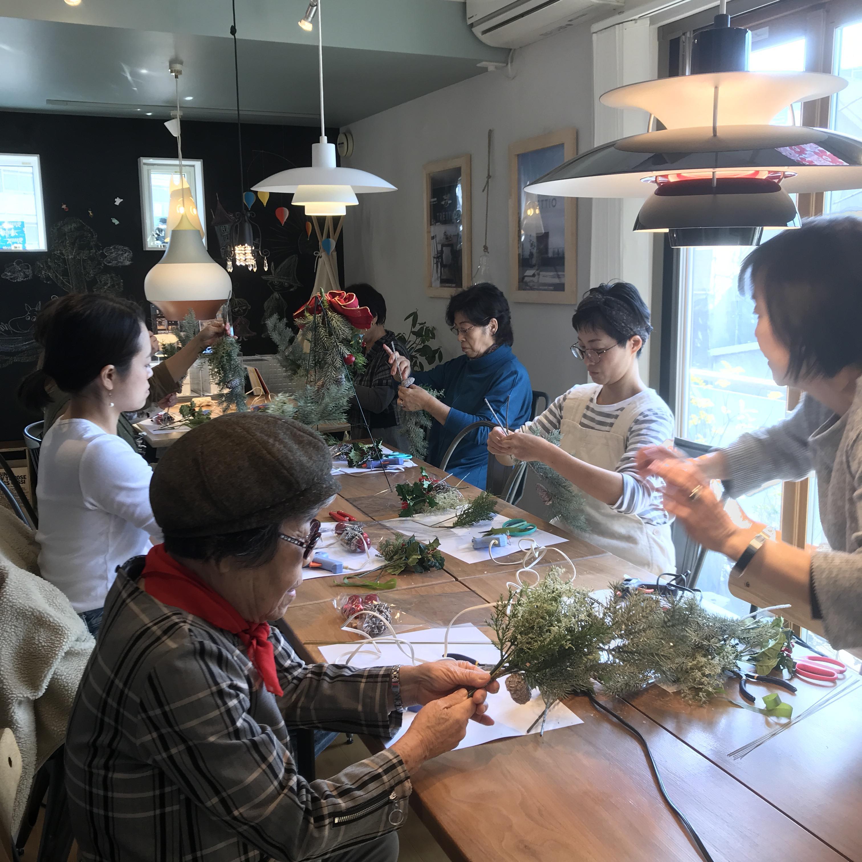 今回は講師の先生を招いて、本格的なクリスマススワッグを作成しました。