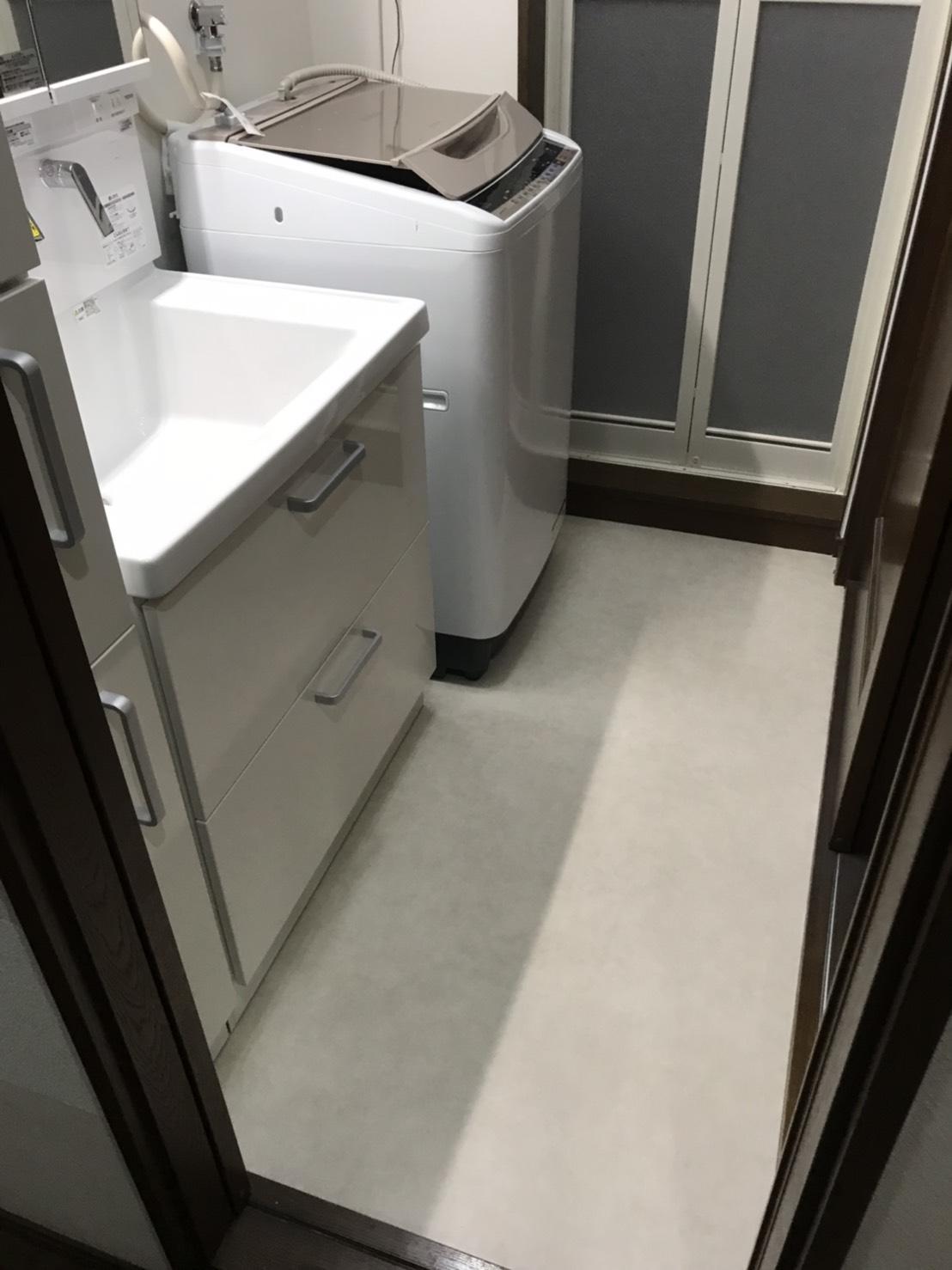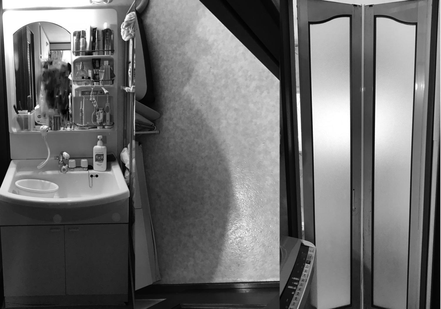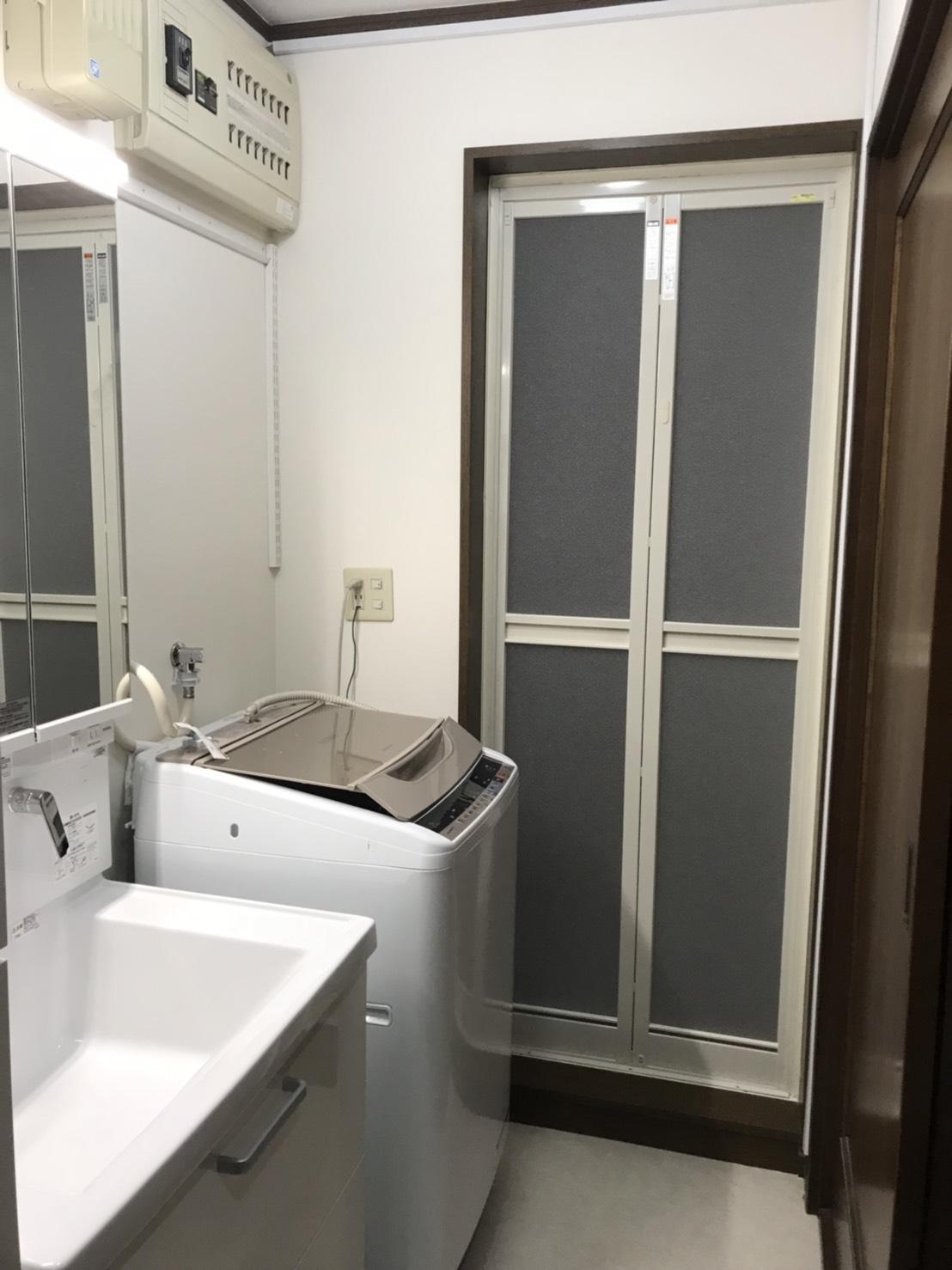 洗面台と天井、壁床クロス、お風呂の扉を交換し、明るくなりました。