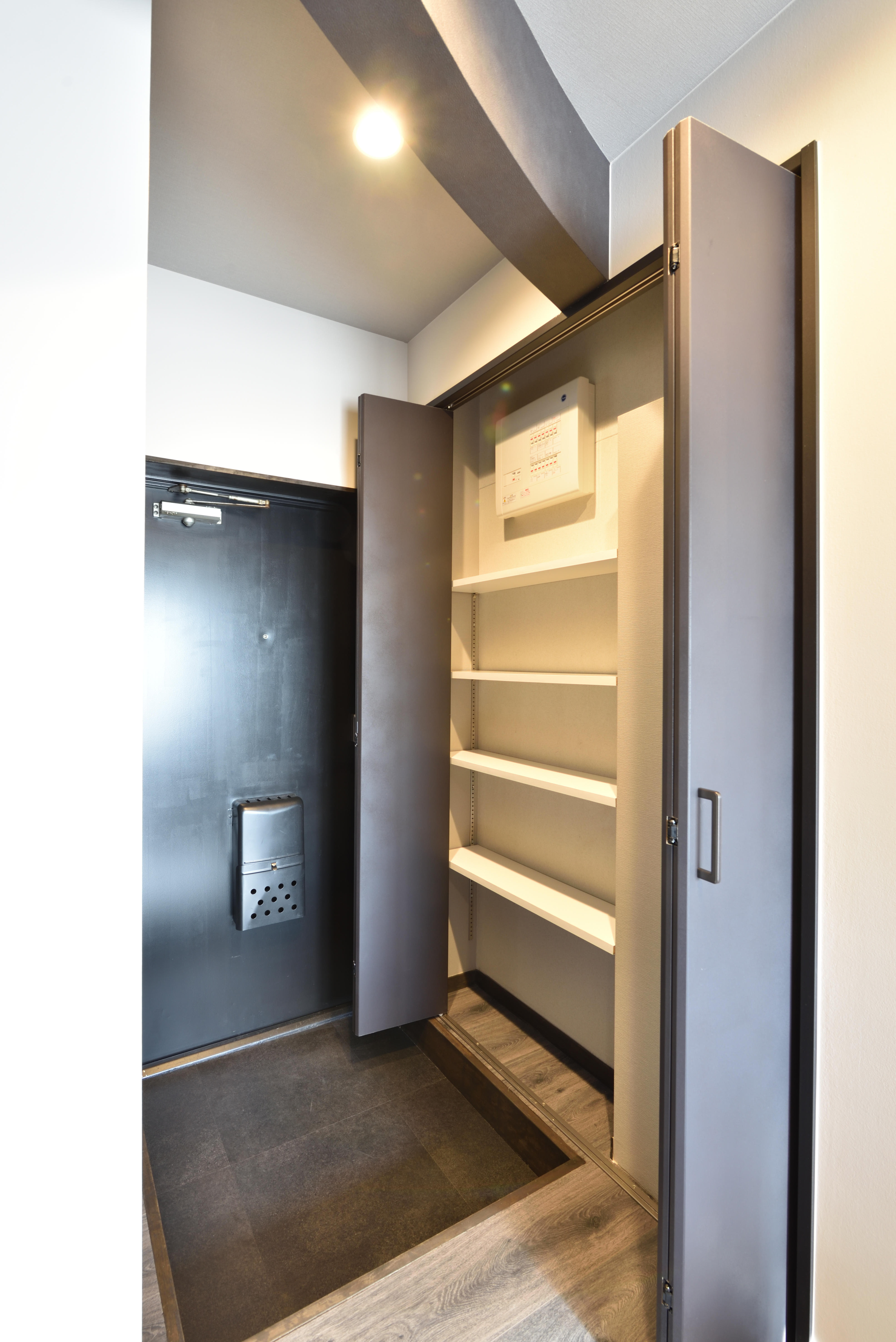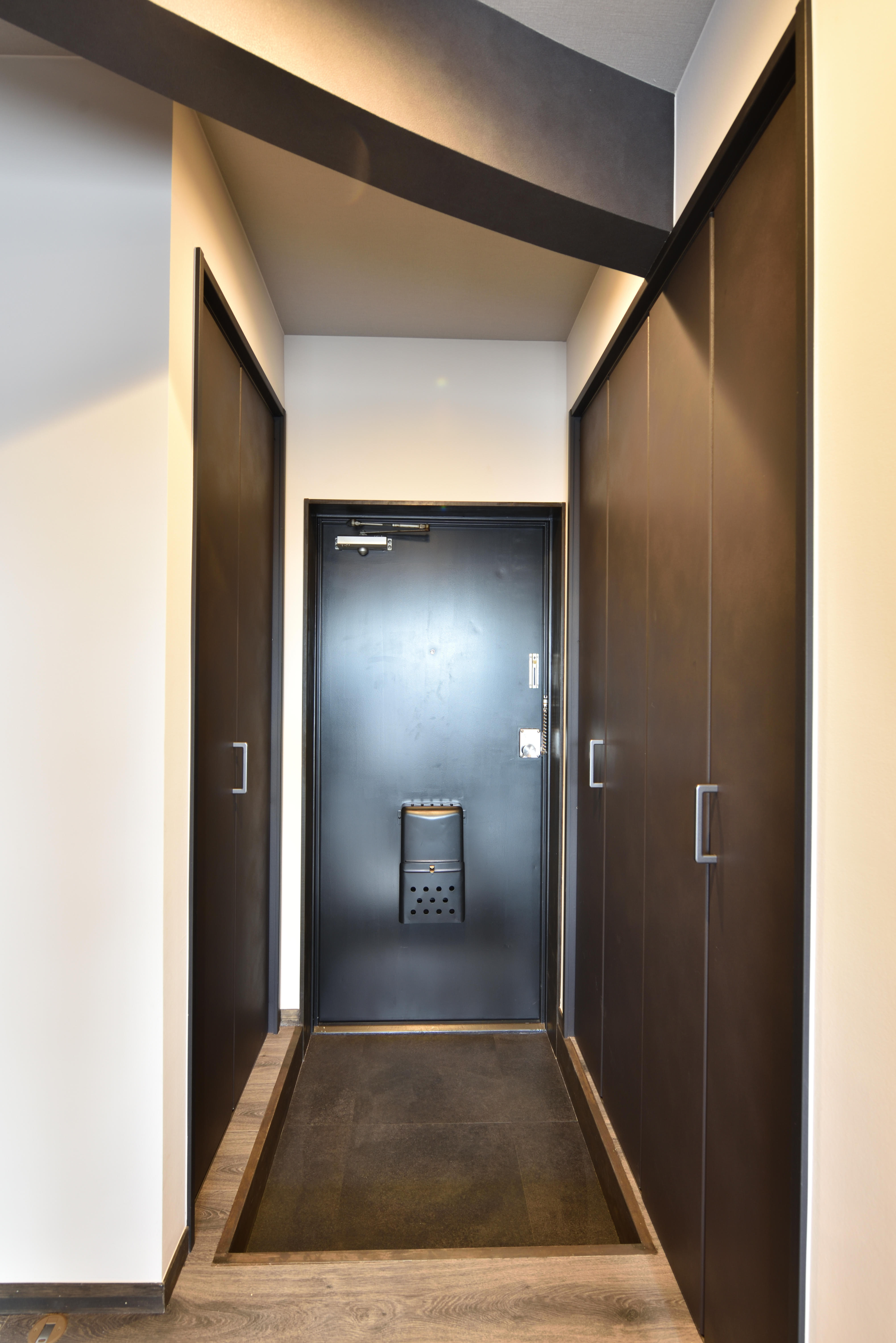 フルリフォームをしたマンション。玄関のBeforeとAfterです。限られたスペースを有効活用し、両側に収納を設けました。