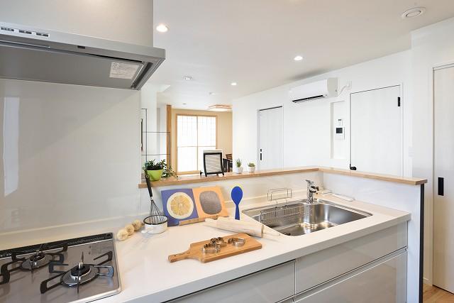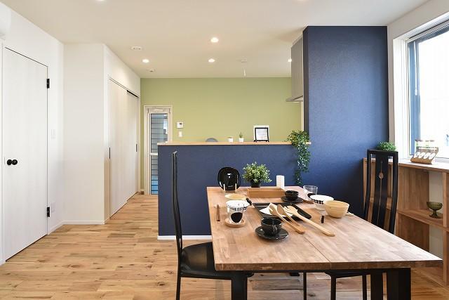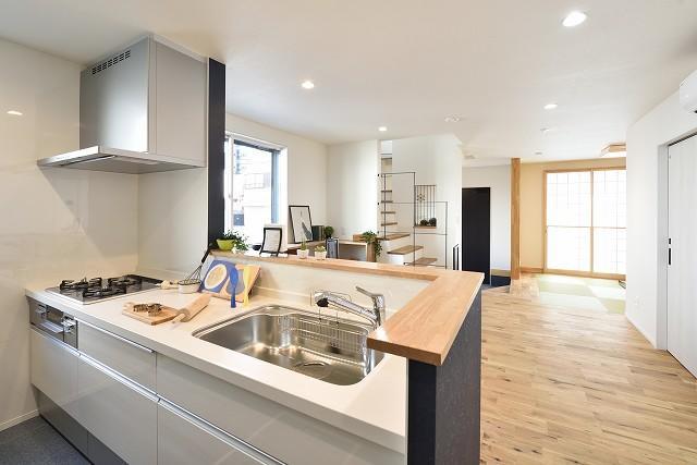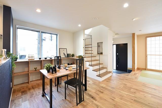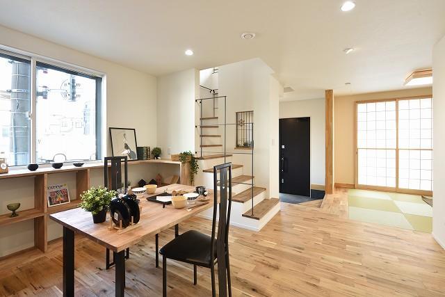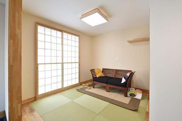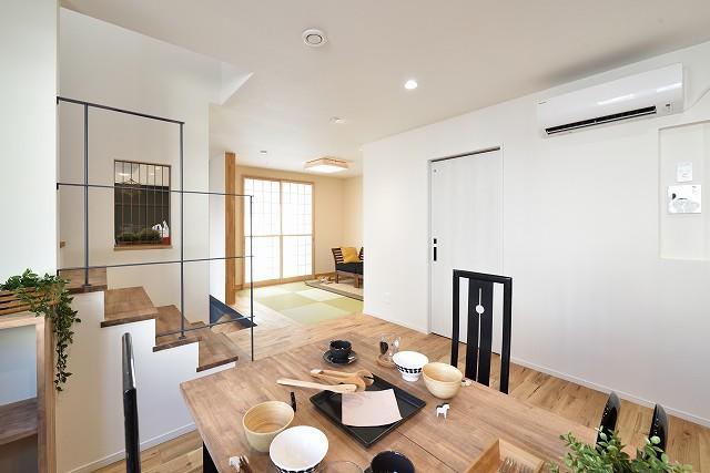 ダイニングの奥にはくつろげる和室を設けました。 高気密・高断熱のスーパーウォール工法なので、部屋を仕切る建具も最小限で広々としています。 長期優良住宅・ZEH・耐震等級3・高性能ハイブリット給湯器ECO ONE・全熱交換換気・太陽光搭載・高気密・高断熱・高性能住宅・国産天然木