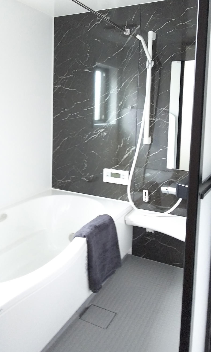 ご夫婦で利用する洗面所は白を基調にグレーのタイルでアクセント。