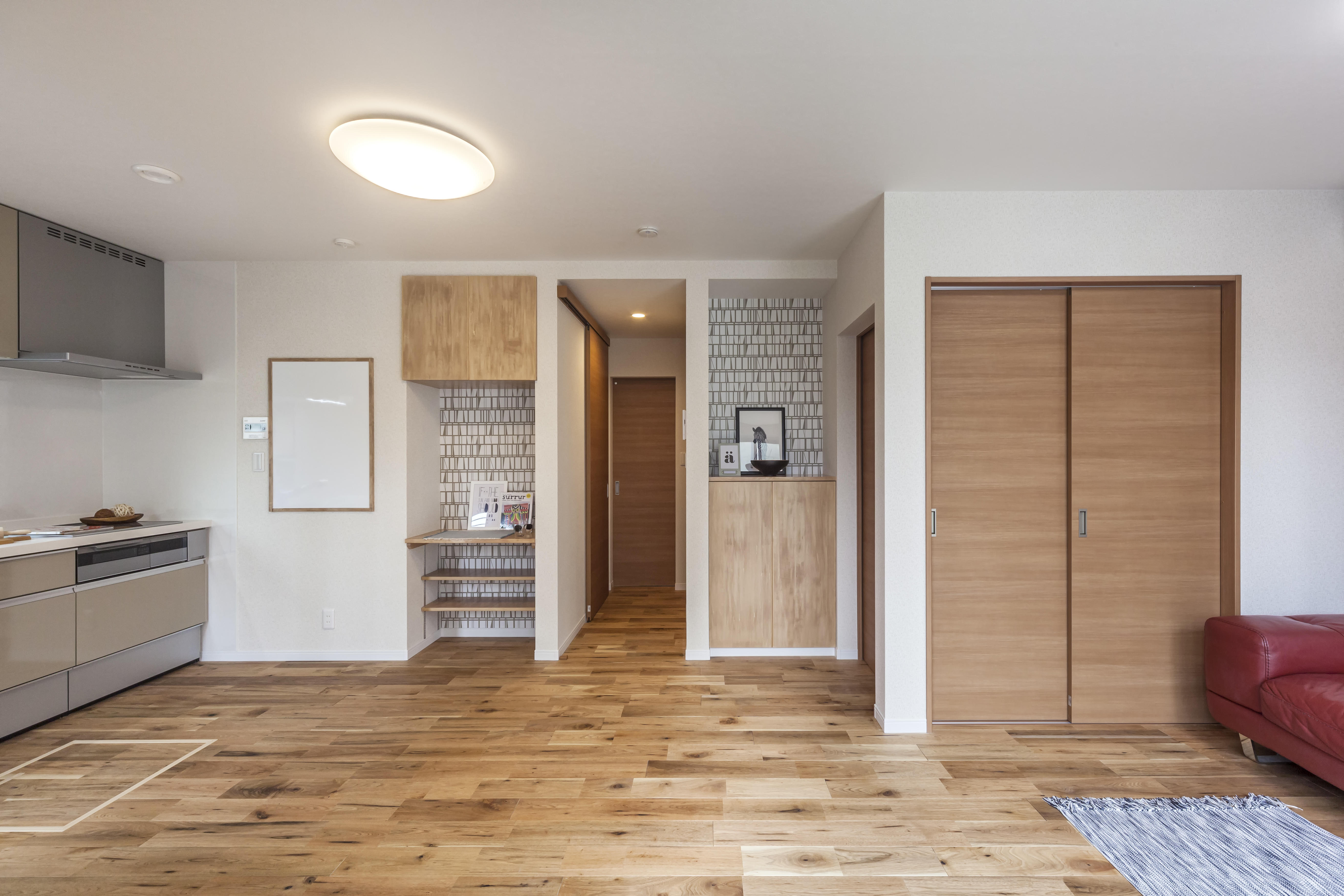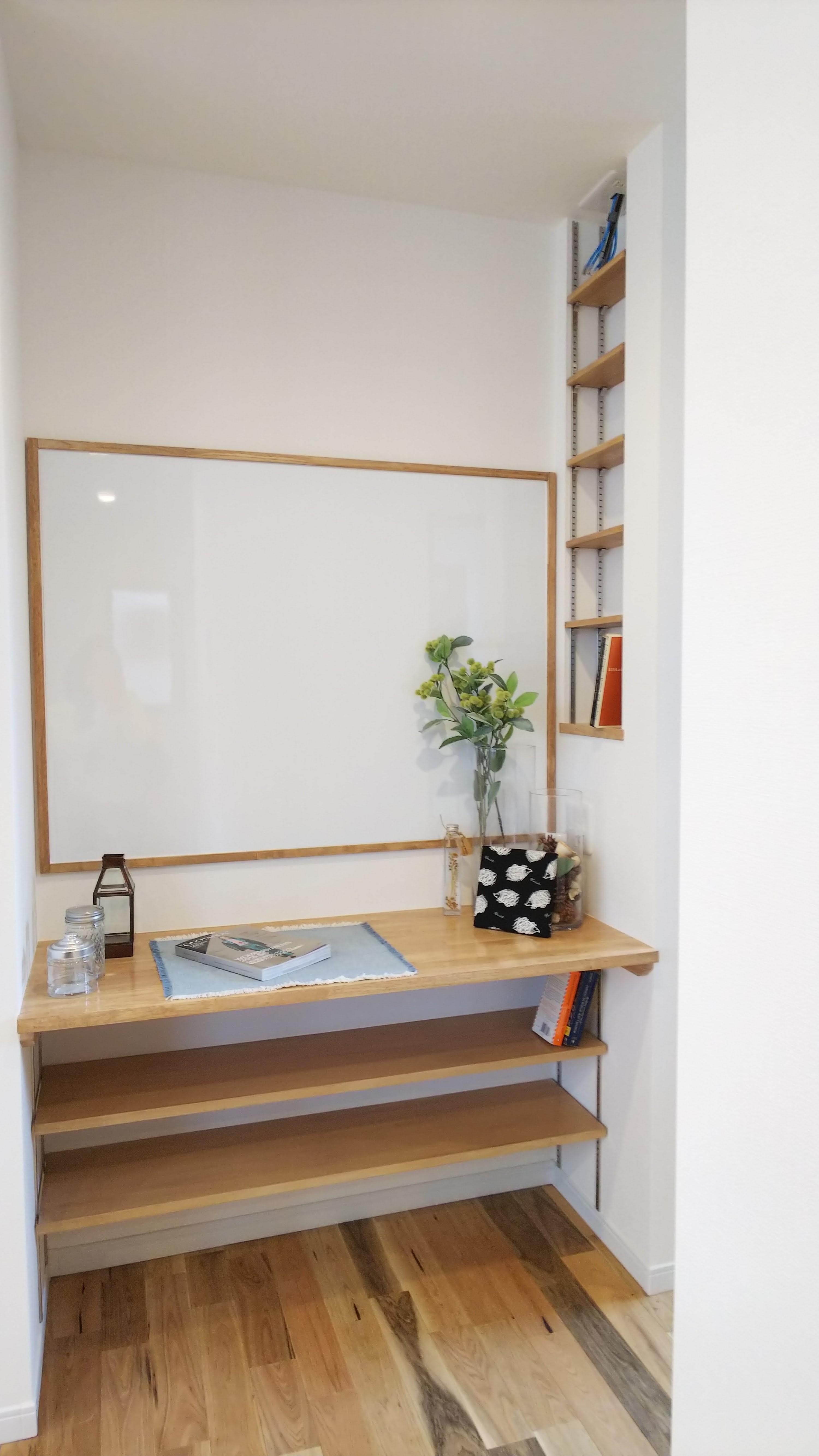 リビング入口前に設けた作業台はホワイトボードを設置して、伝言を残したり、学校からの連絡を貼ることも可能です。