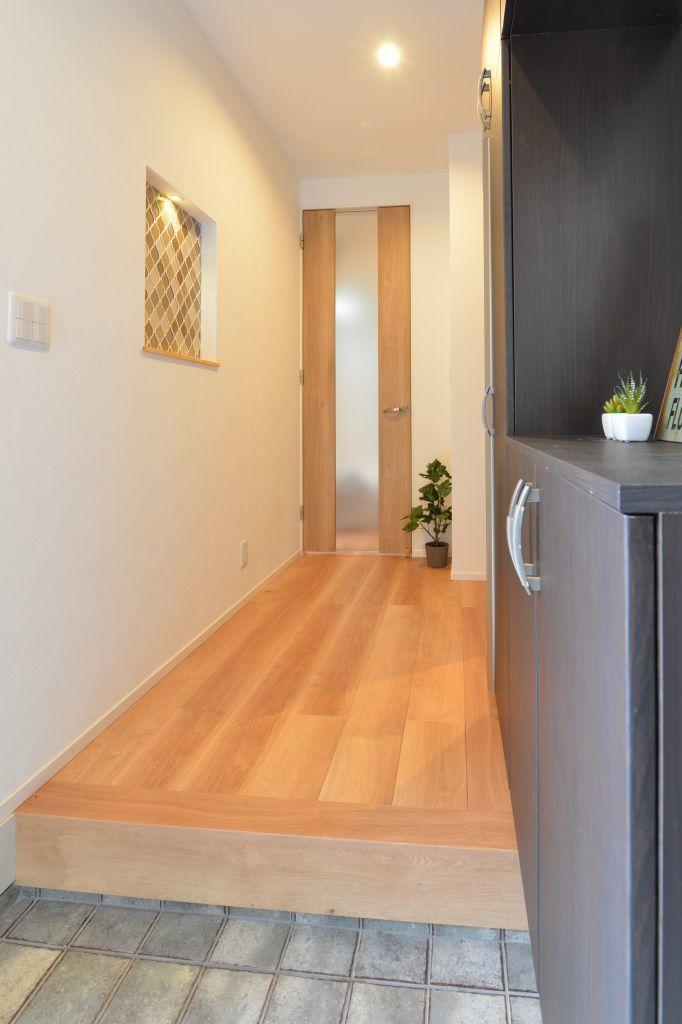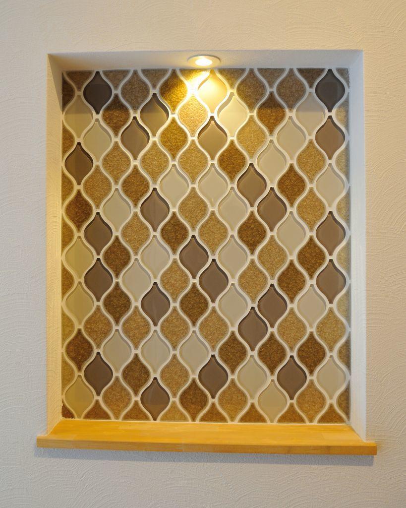 玄関を上がってすぐ先の廊下壁にあるタイルと照明がついたニッチ。
