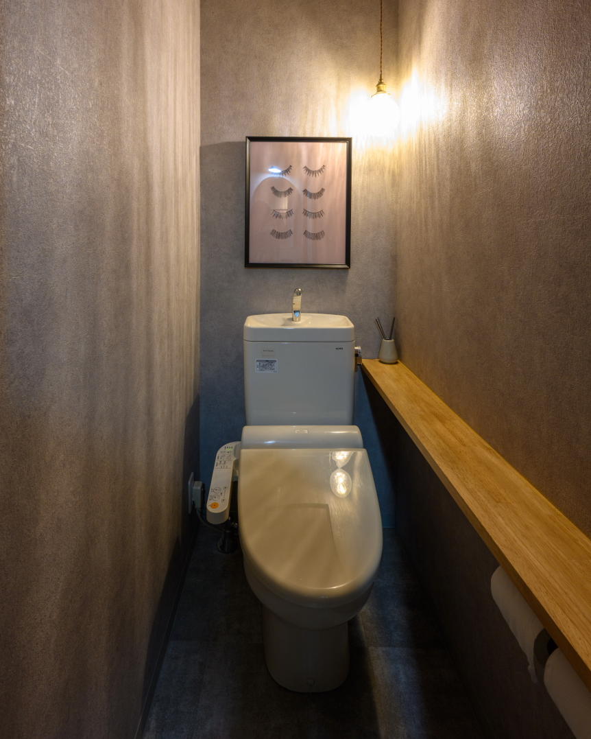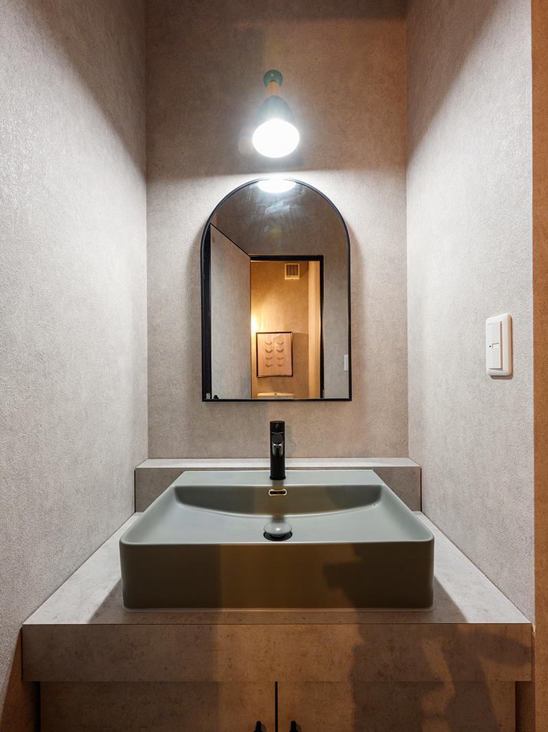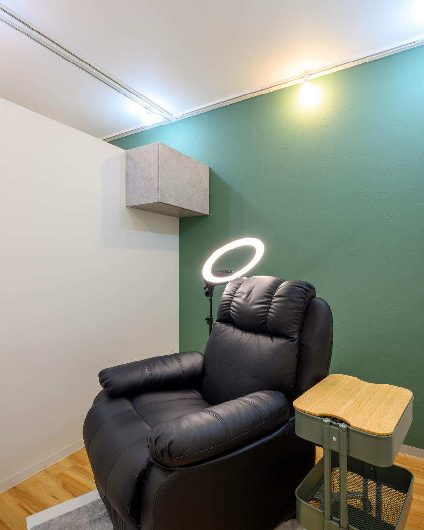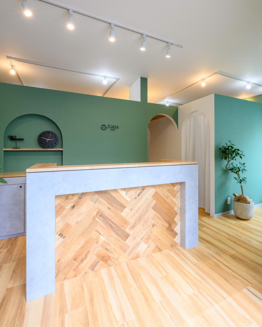 落ち着いたモスグリーンを基調にナチュラルウッドの組み合わせを活かした大人シックの空間になりました。アーチ形の入口に天井ルーバーはおしゃれで開放的な雰囲気に。受付カウンター、ベンチシート、洗面台、棚はオーダーメイド家具で各所ジャストサイズに!大人女性が通いやすいワンランク上の店舗リノベーションになりました。