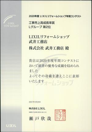 2020年度LIXILリフォームショップ年間コンテスト「工事売上高成長率賞」で全国第2位を受賞しました。