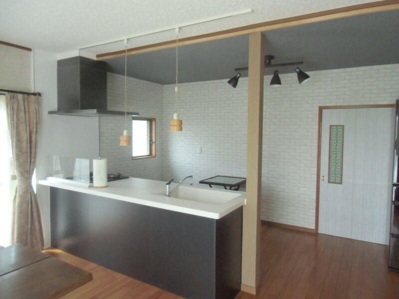 L型キッチンを対面キッチンにリフォームしました。中央の柱は構造上抜けませんでしたのでそのまま残しクロスで仕上げました。