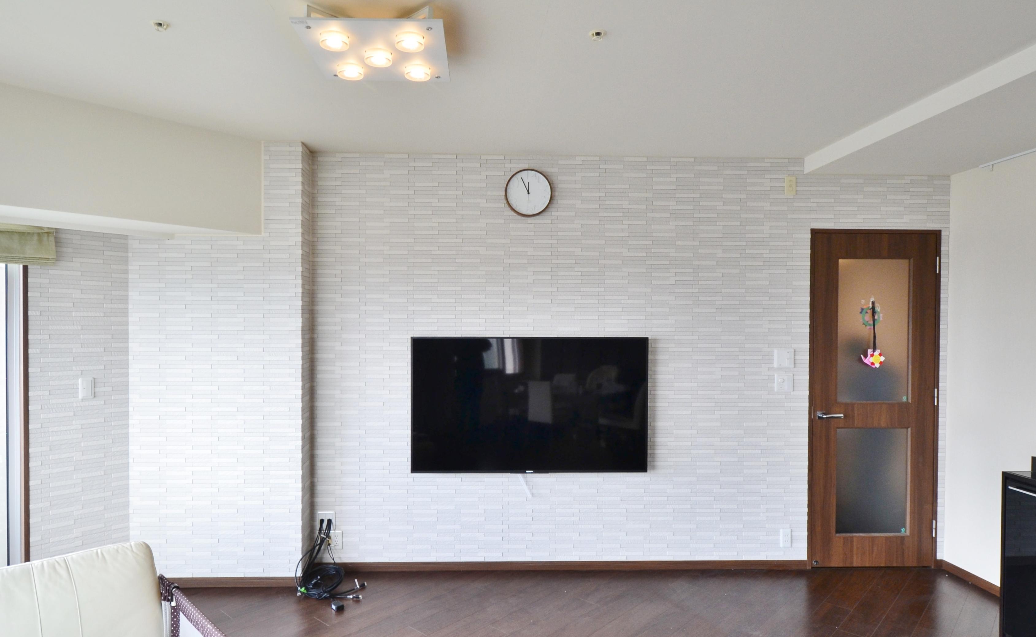 エコカラットの施工をご希望とのことで、壁掛けテレビの設置とあわせて施工させて頂きました。 テレビの壁下地補強と、金物設置、配線も壁内に隠蔽配線してスッキリとしたLDKとなりました。