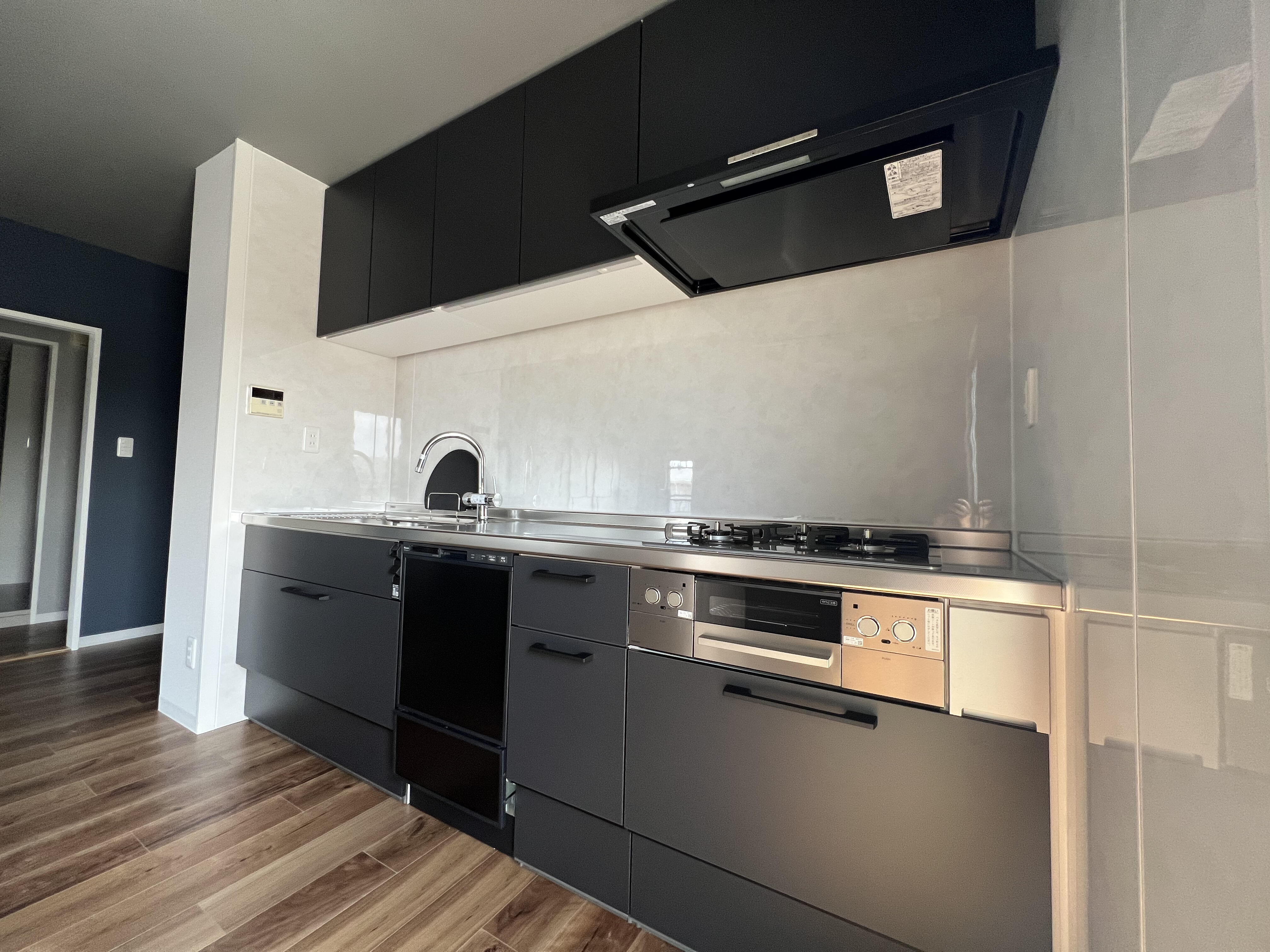 キッチンはリクシルのノクトを採用。デザインだけでなく使い勝手にもこだわり、食器の出し入れが楽なフロントオープンの食洗器を採用しました。