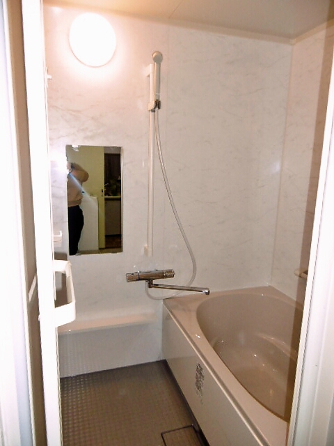 以前のお風呂は壁や床がタイルでしたので、どうしても目地の汚れが気になるところです。壁も鏡面にして、お掃除のしやすさを考えて選んだお風呂です。また、浴槽のまたぎも低くなり、手すりも設けて、安全にも配慮した浴室になりました。