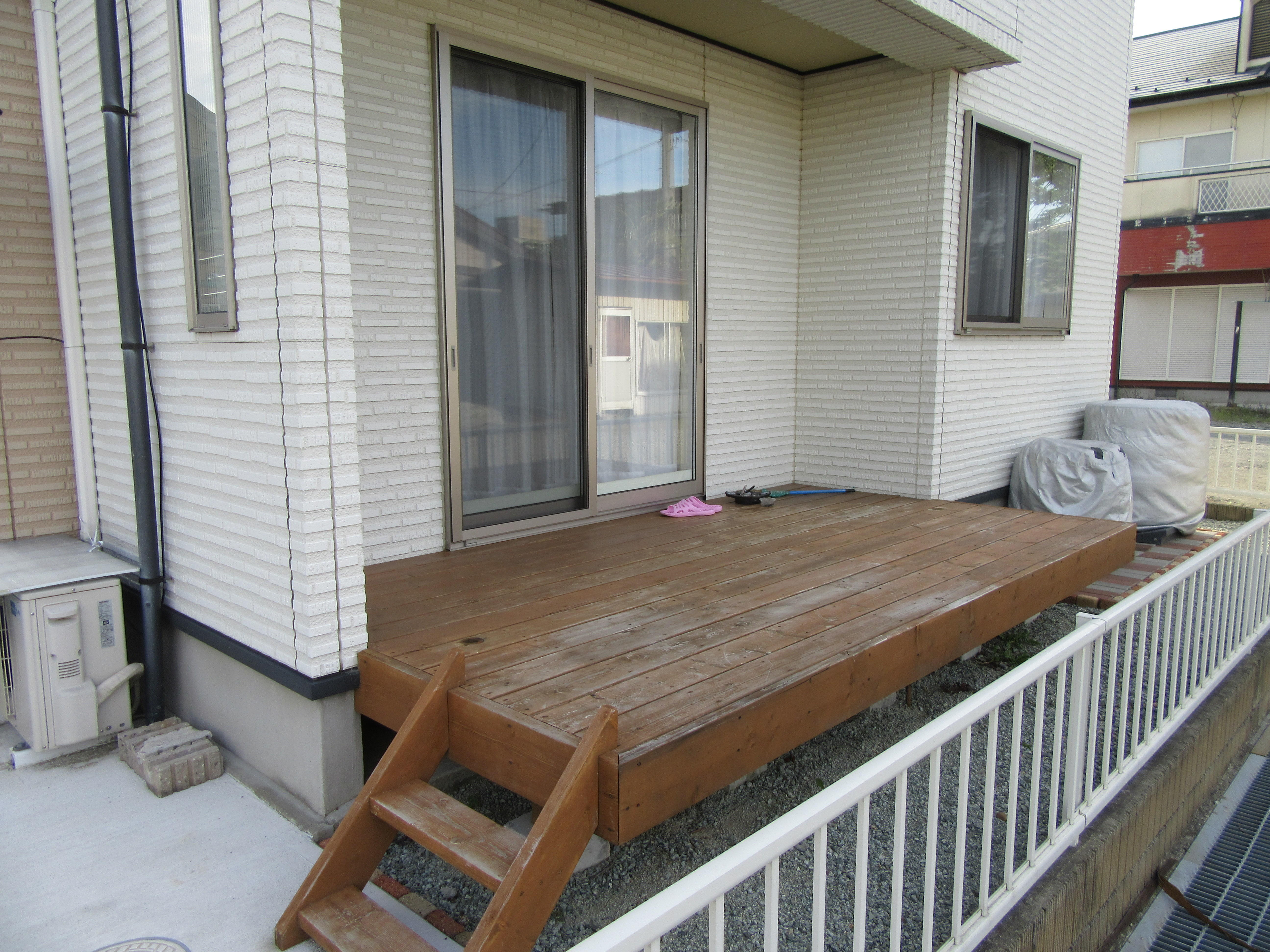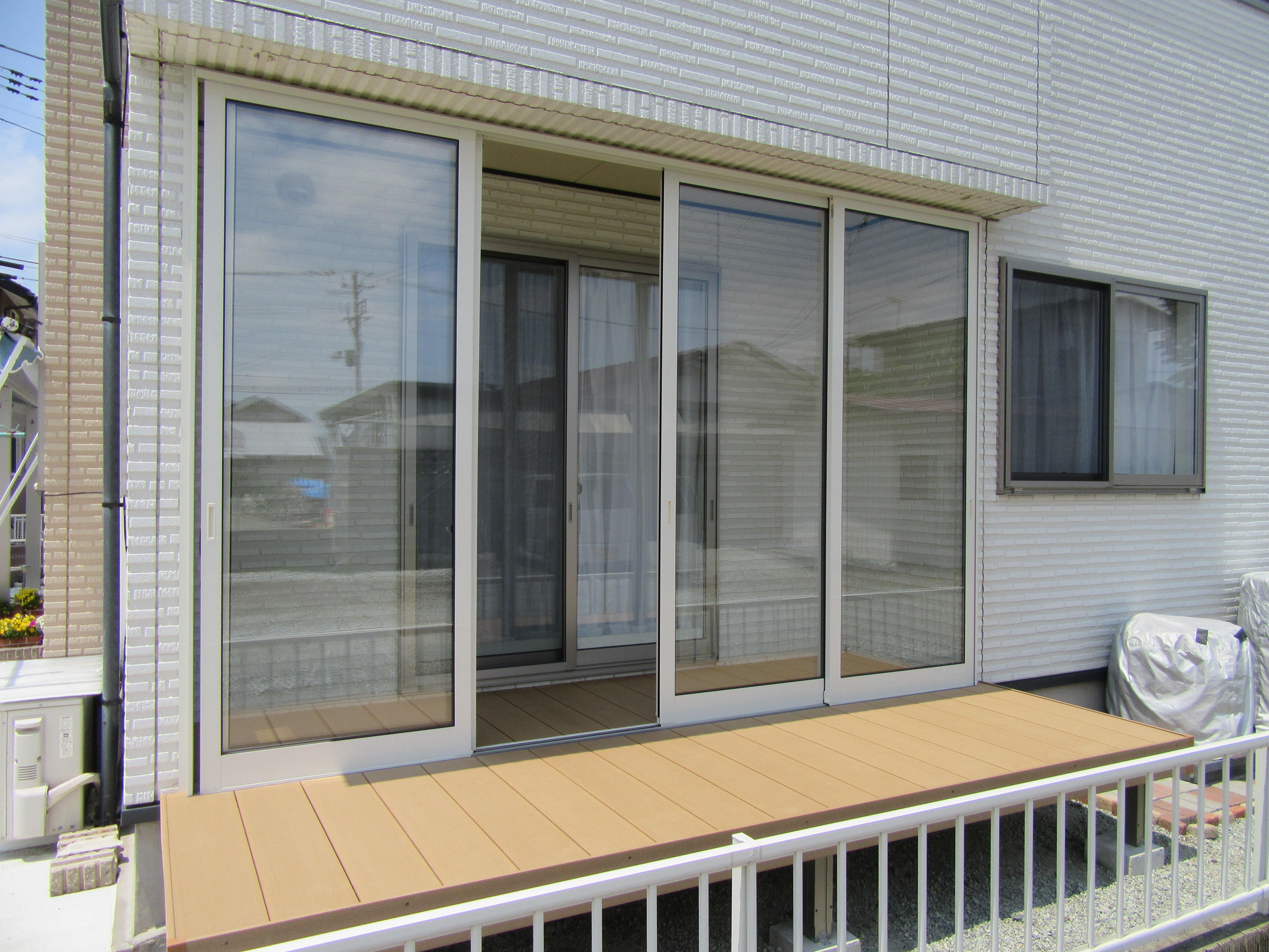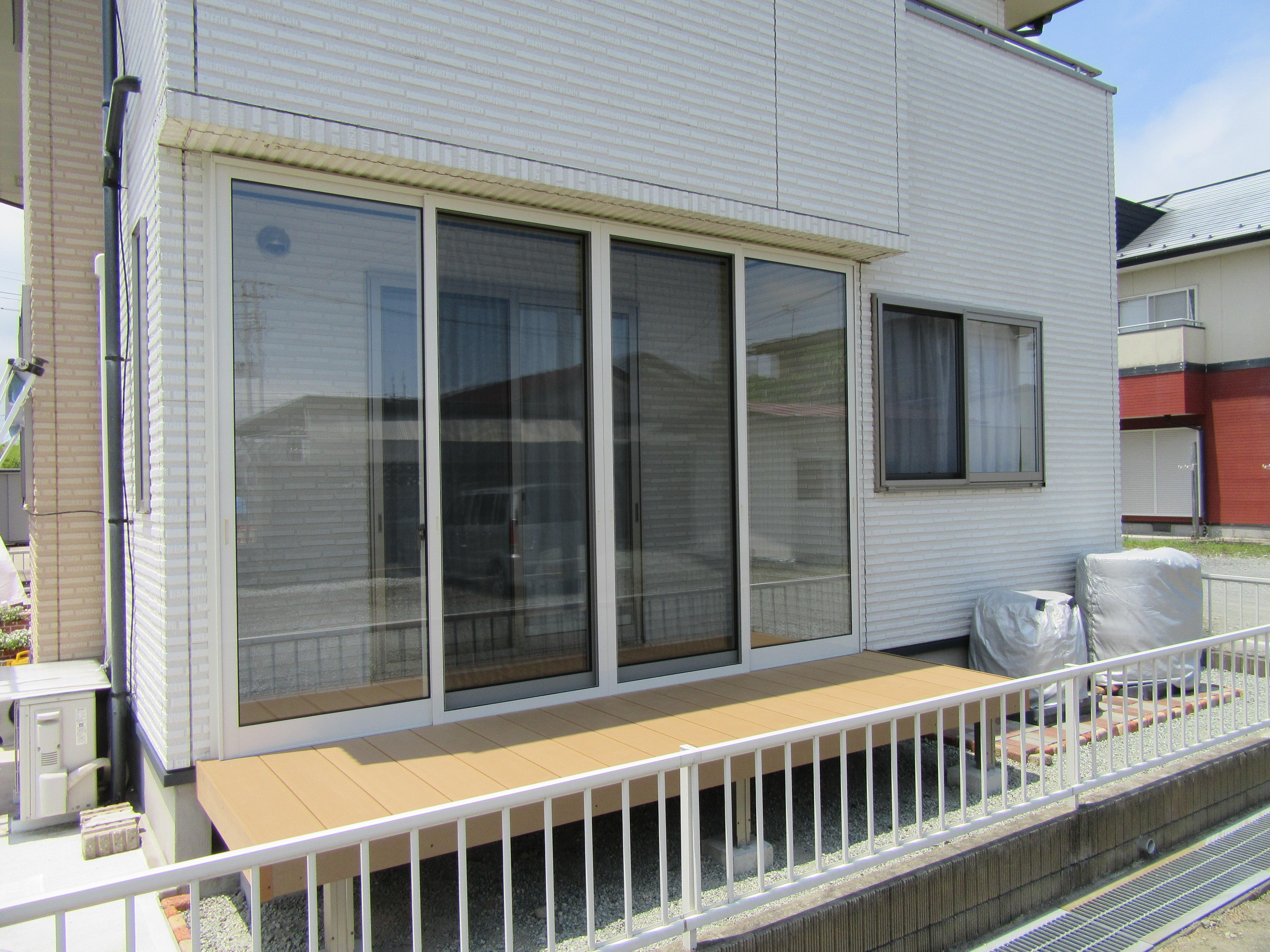 既存の天然木のウッドデッキの傷みや劣化が目立ってきた為、耐久性・メンテナンス面を考慮して既存のウッドデッキは解体、樹脂製のウッドデッキ(樹ら楽ステージ)を新規取付させて頂く事となりました。更にノンレールタイプのサッシを取付け、サンルームとしてもご利用頂ける空間が生まれました。