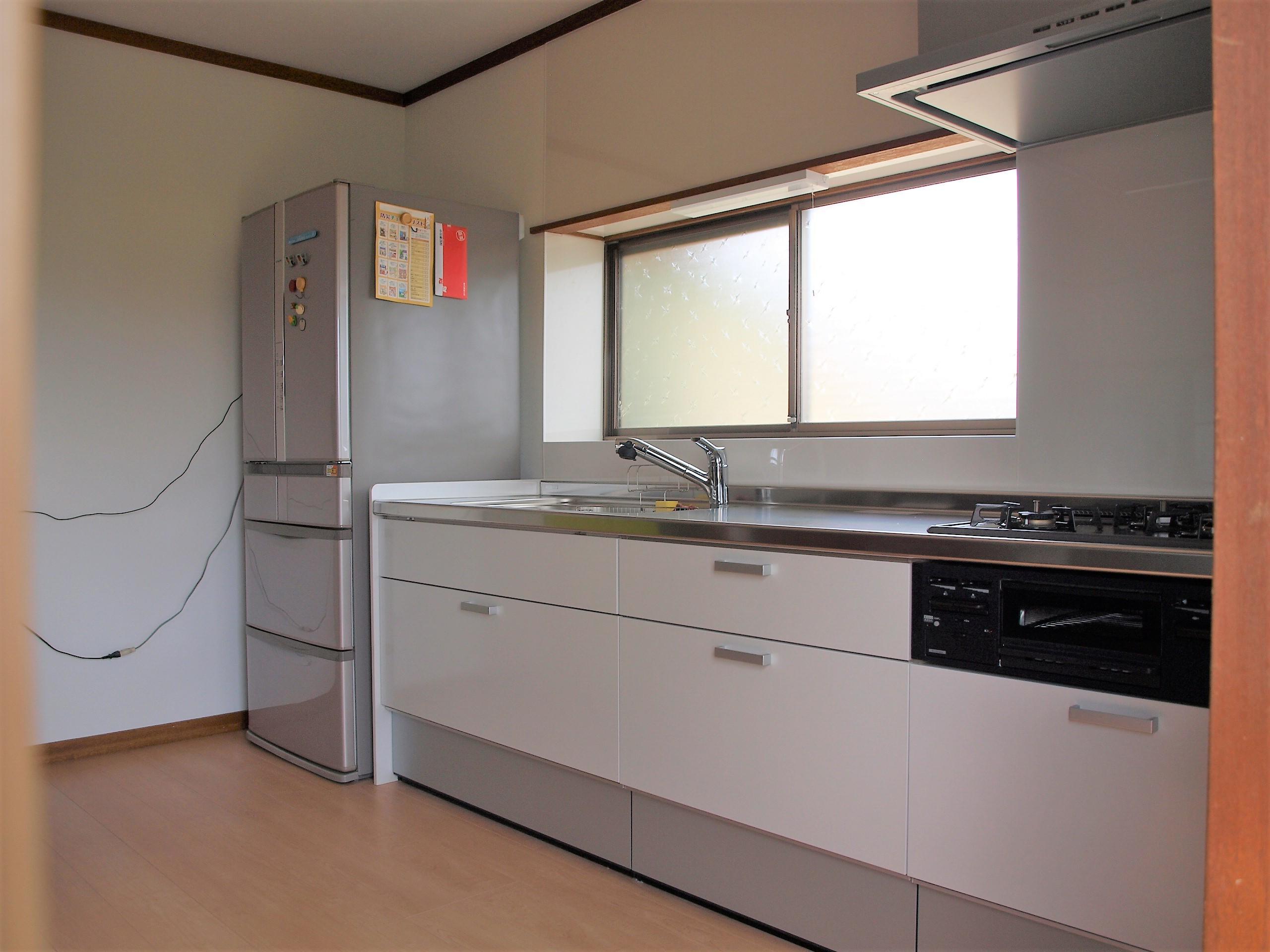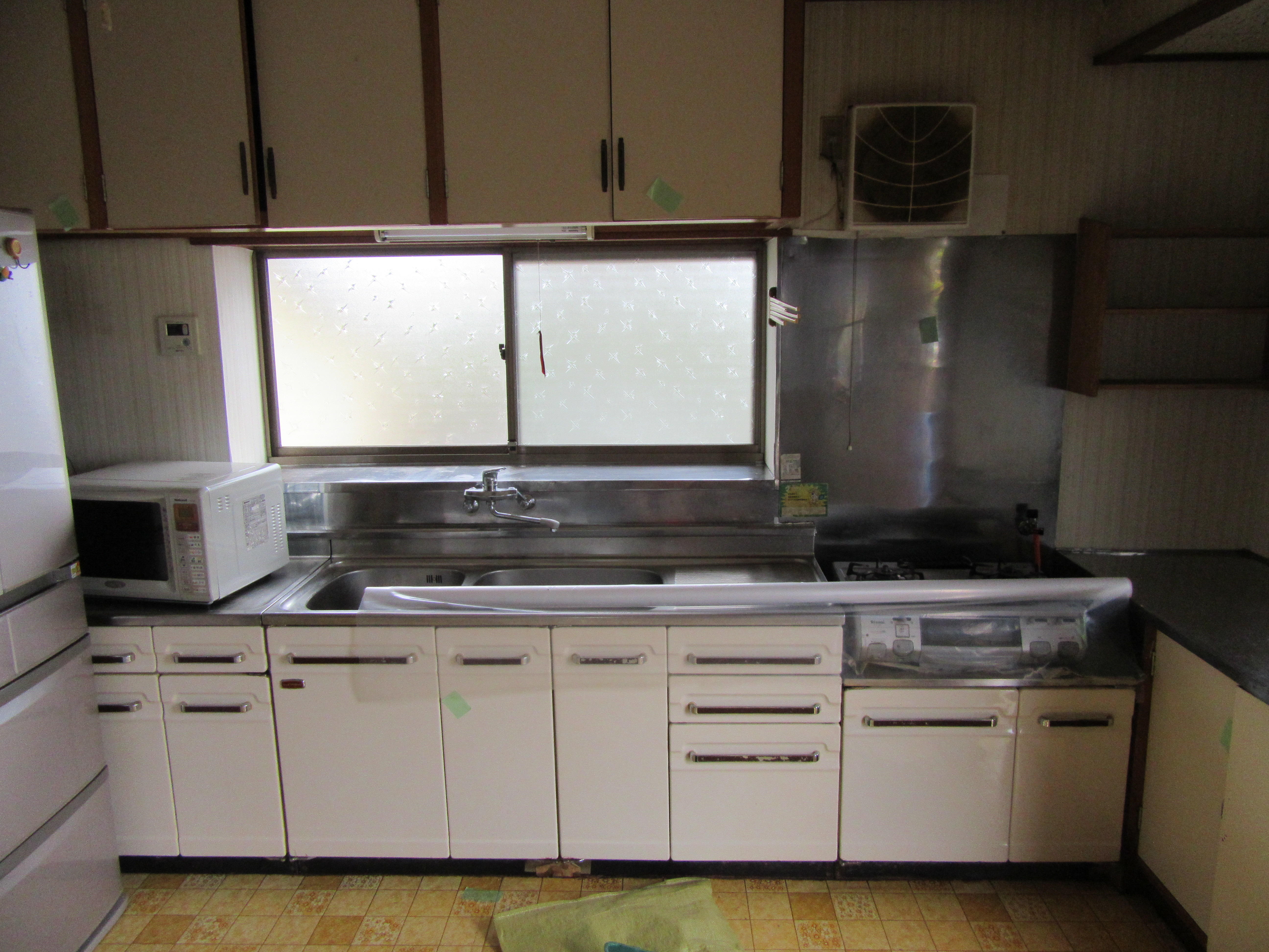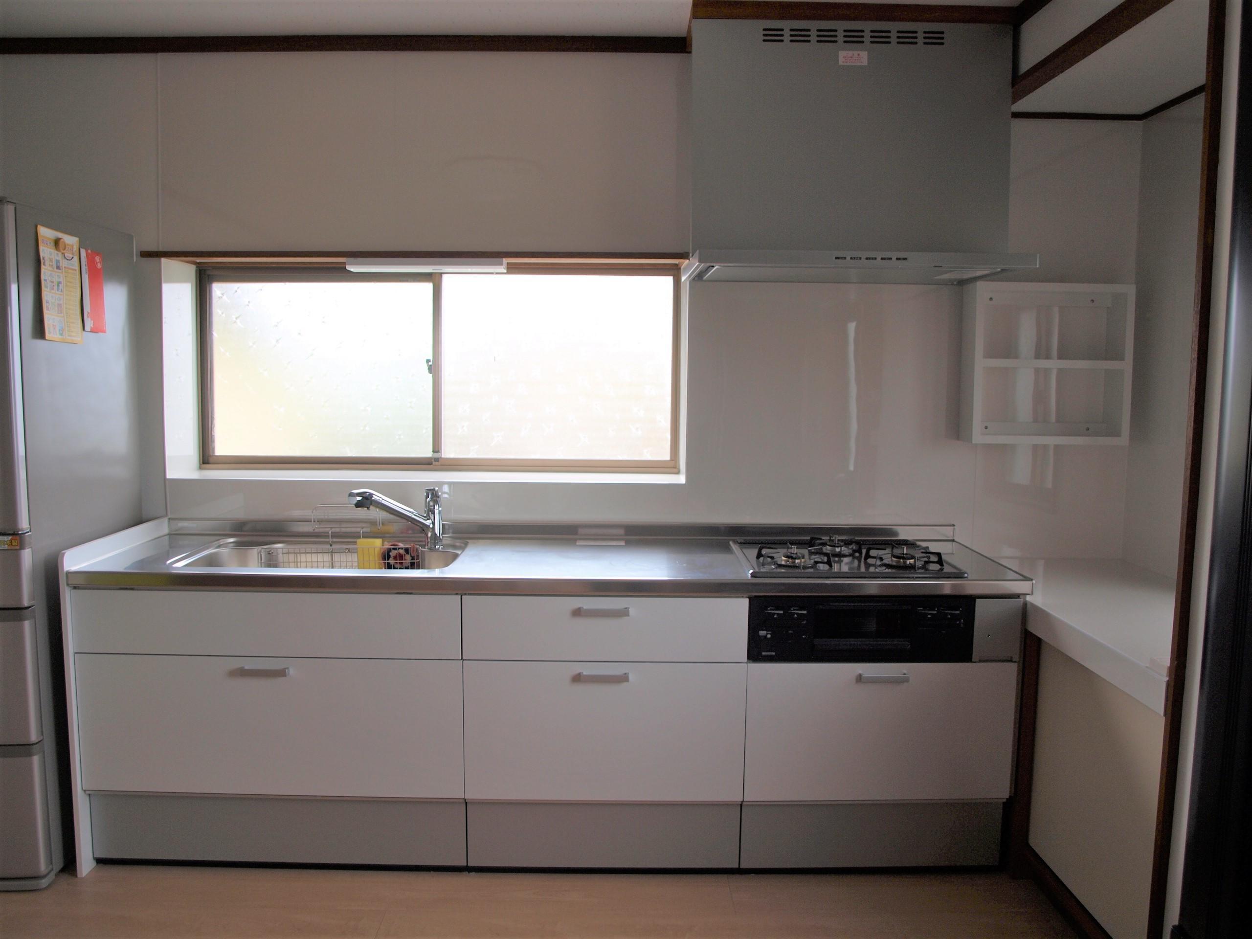 築40年が経過し、キッチンを交換する事になりました。同時にクロス・フローリングも張替え、ガスコンロ右上の小さな棚も新しく造作し、キッチンの色味に合わせて塗装しました。