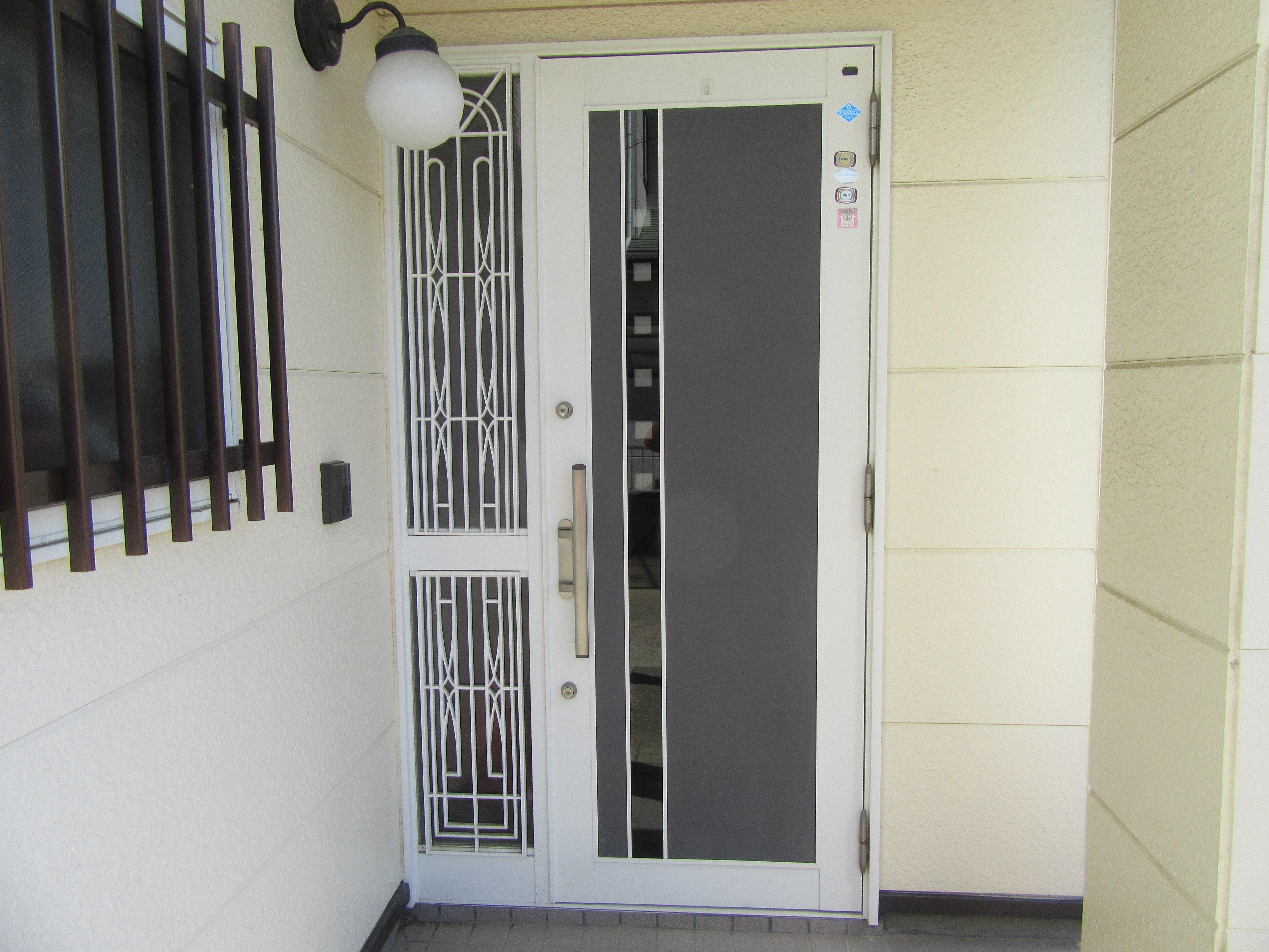 既存の玄関ドアの開け閉めがしづらくなってしまったとご相談頂きました。見させて頂いた所、部品がズレてしまっている・鍵を閉めないと知らず知らずの内にドアが開いてしまう、等の状況でした。部品を交換しての修理も可能でしたが、ご相談の上、リシェント(断熱性能ドア)へ交換させて頂く事になりました。また、デザインは奥様がお好みのモノをお選び頂き、木目調のデザインを採用しました。
