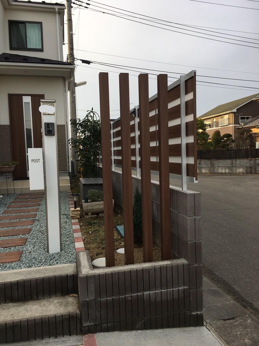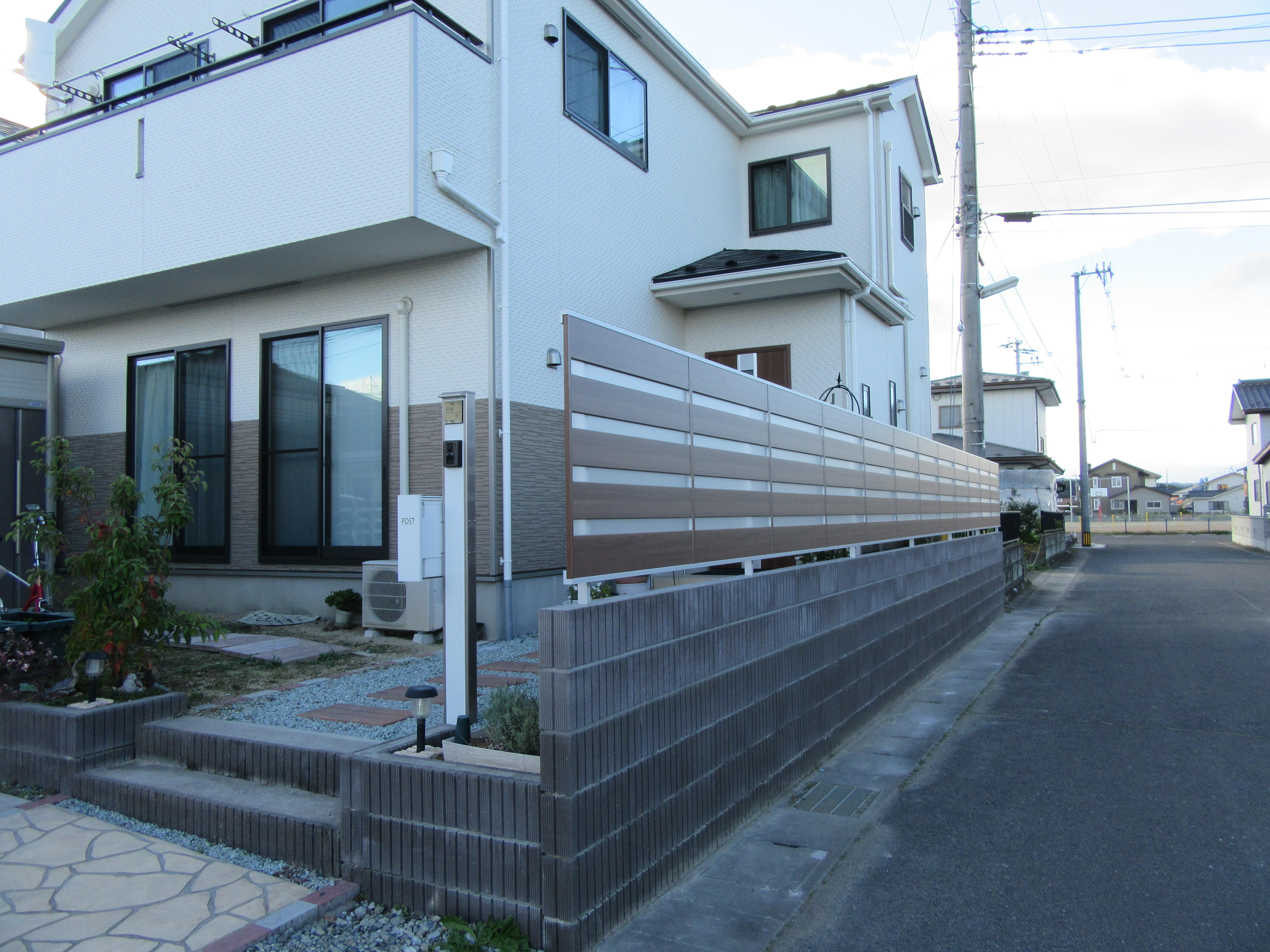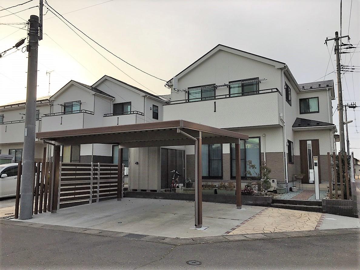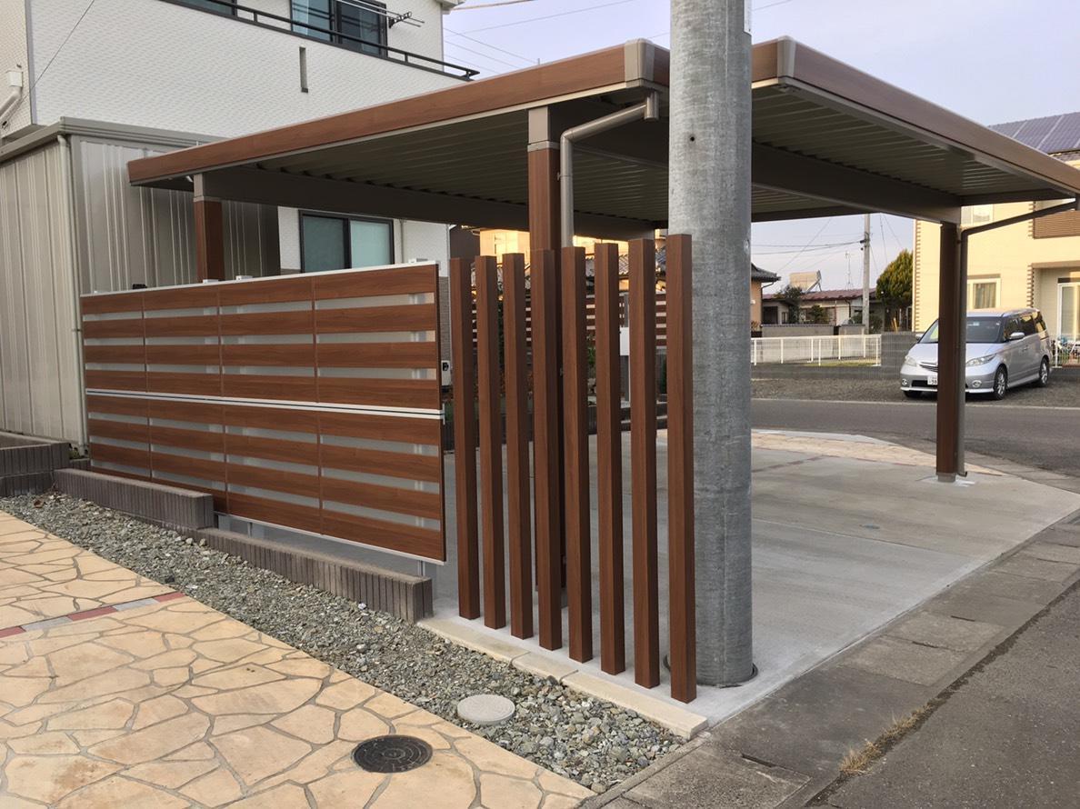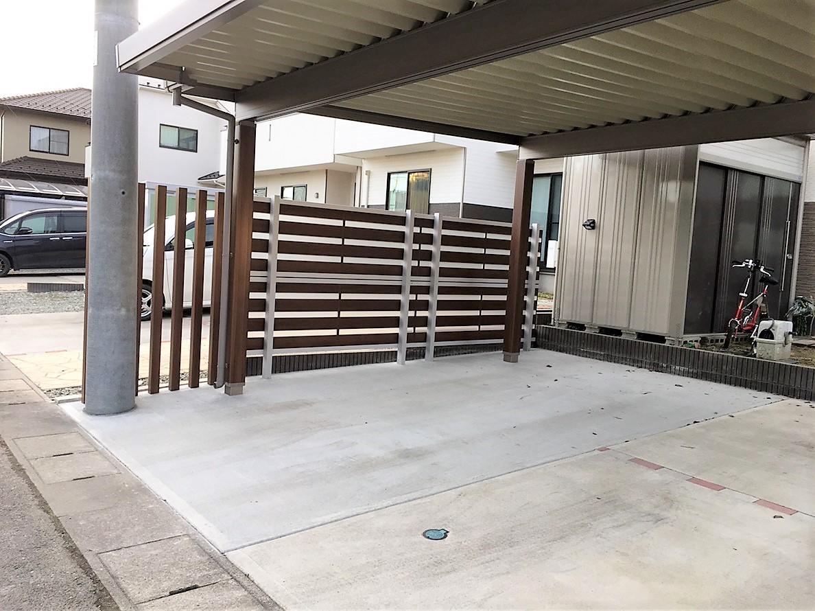 建売住宅を購入。駐車場の砂利の部分にコンクリートを敷きたい、雪や風の事等を考慮し、カーポートや隣地境界にフェンスを取付けたいとのご相談を頂きました。カーポートはテリオスポート、フェンスはジオーナ(※今回採用したデザインは2018年11月にで生産終了)、化粧柱にデザインパーツの枕木材を採用しました。(全てLIXIL)