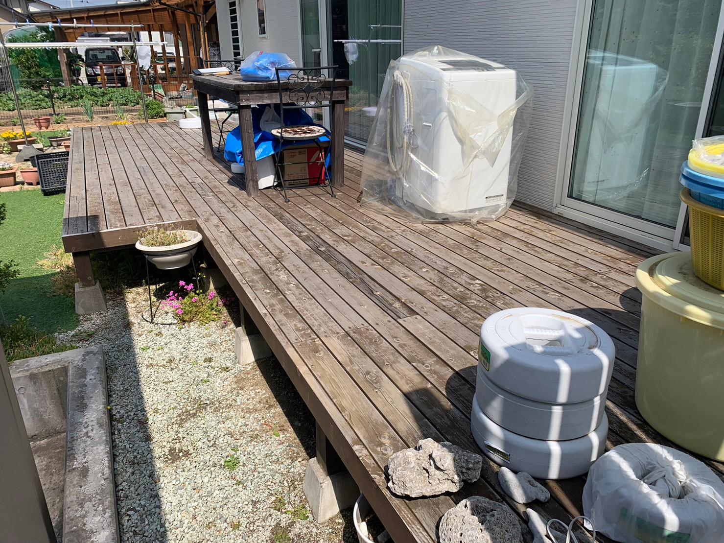 設置してから年数が経ち、劣化してきた木製のウッドデッキの塗装工事のご依頼を頂きました。 傷みがあり、交換が必要な部分のみ木材を交換し、塗装しました。