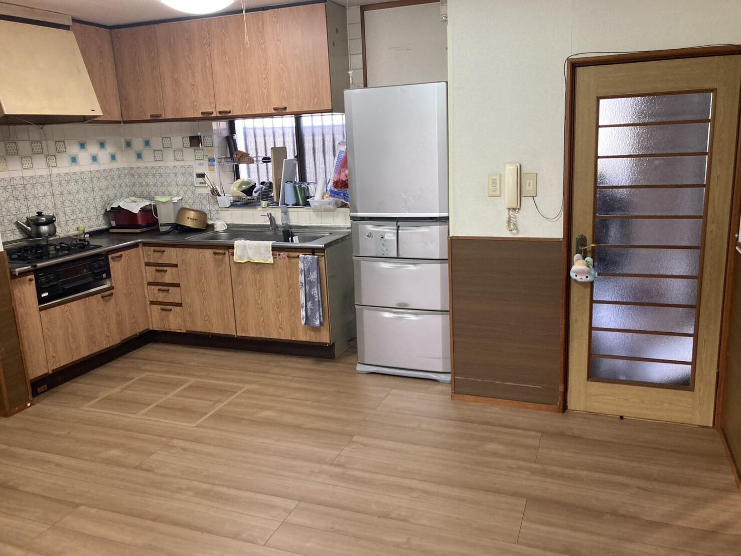 ダイニングキッチン床のフローリング重ね張りを行ないました。
