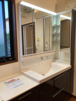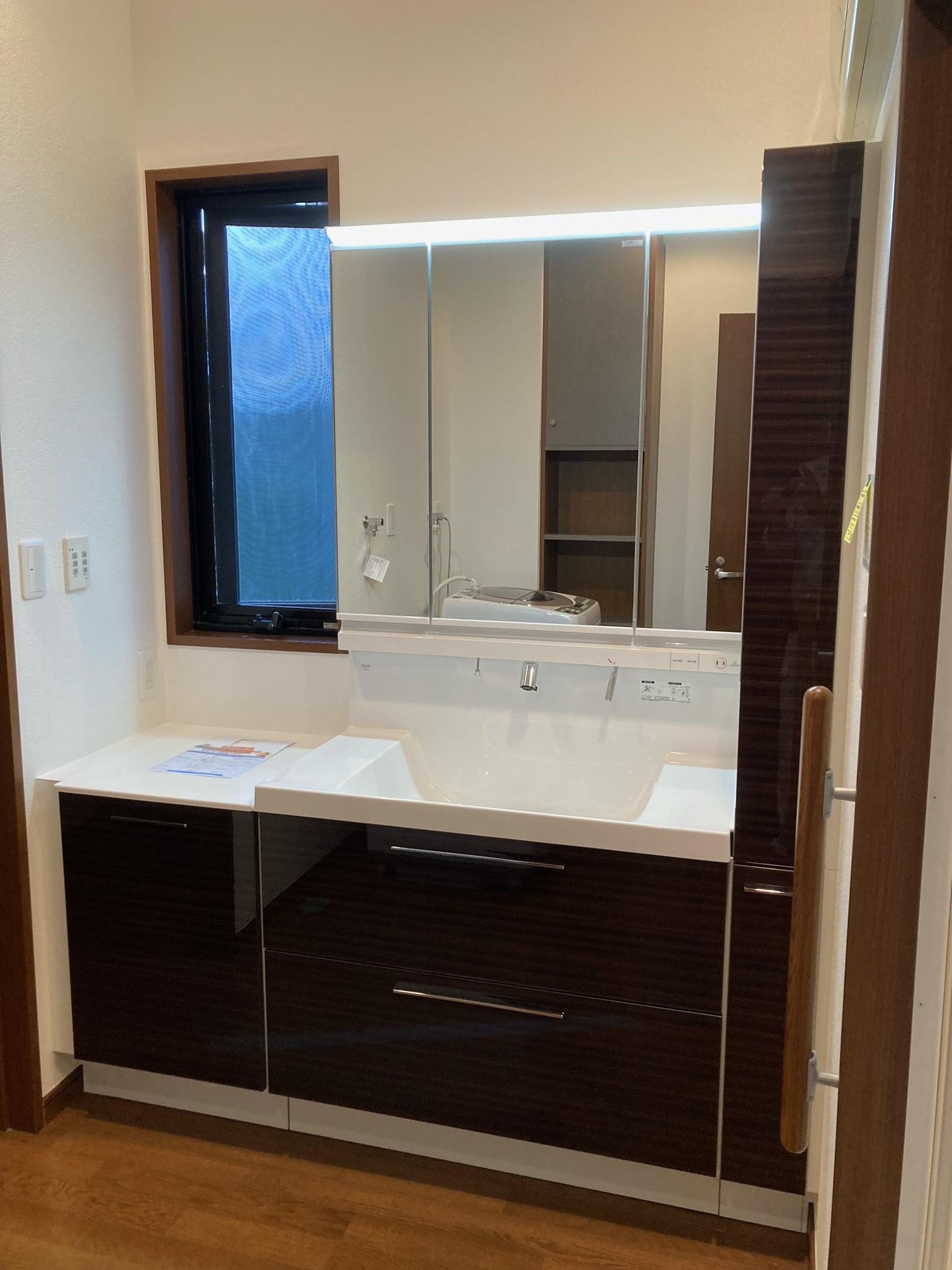洗面は袖壁を撤去し、150キャビネットを設置ご提案。 デットスペースを無くし収納へ。 仕上がりに満足していただけて安心しました。