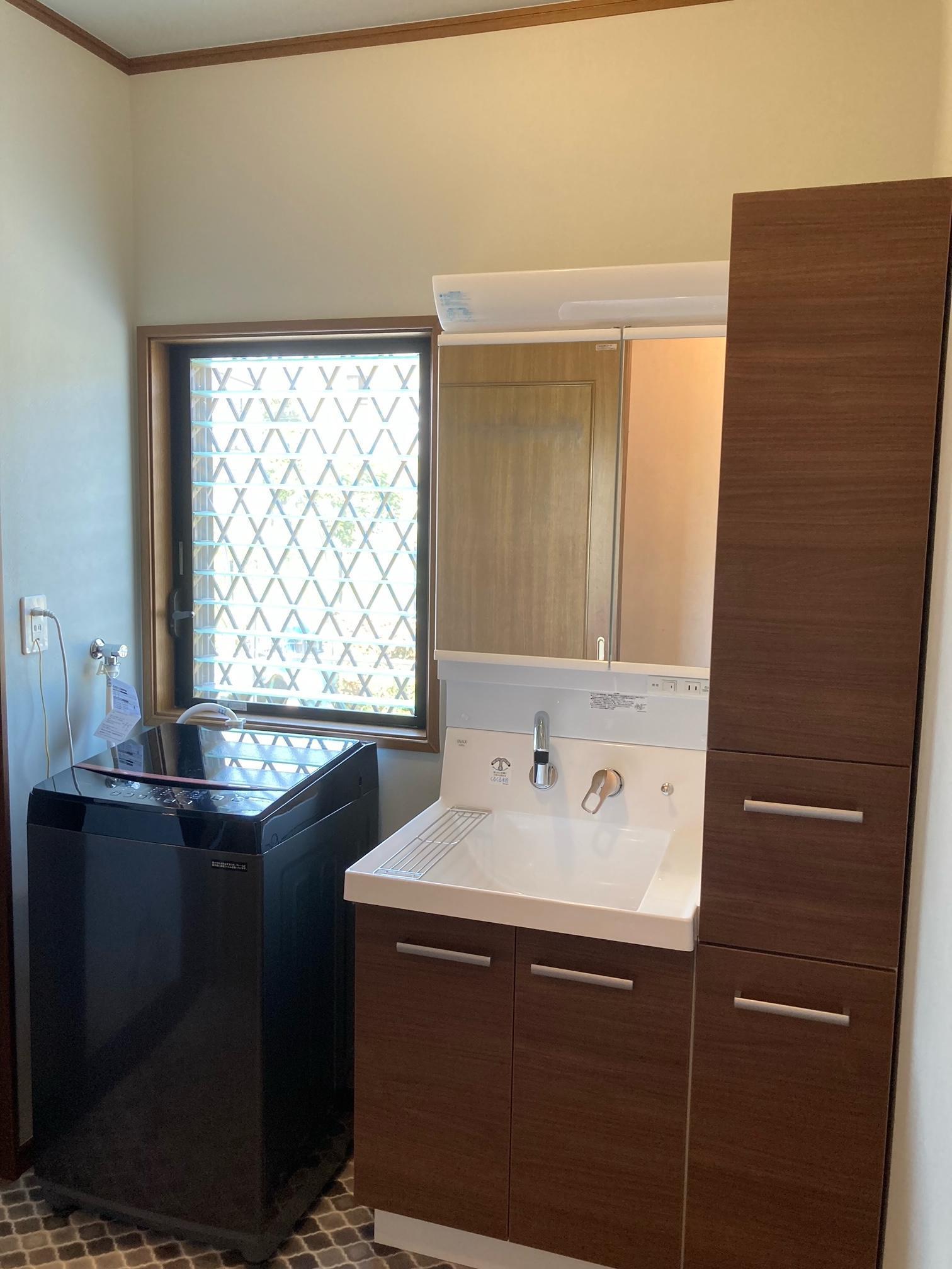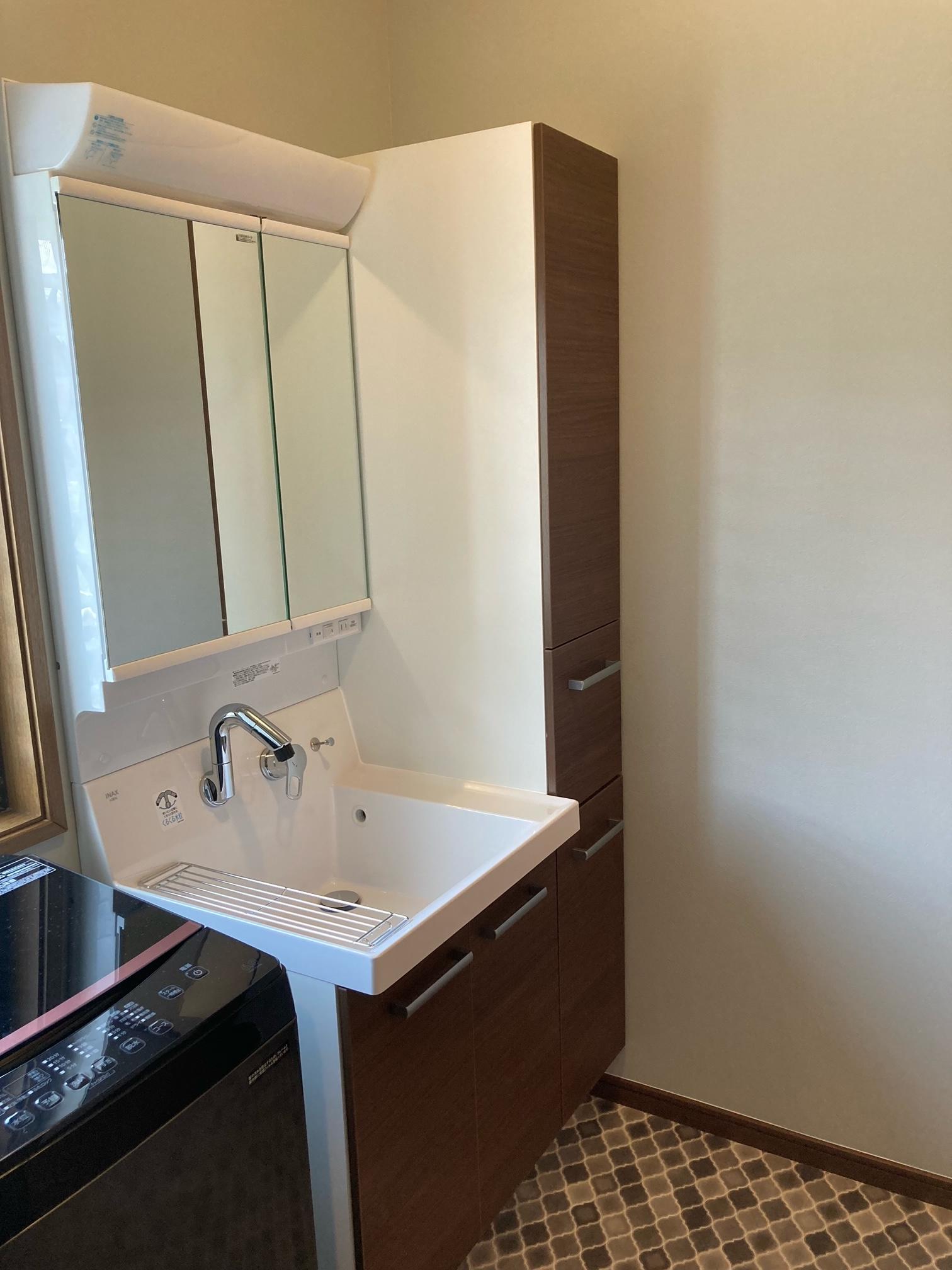 奥様のセンスがとても素敵です。洗面所の床も浴室に合ってシックなデザインとなりました。