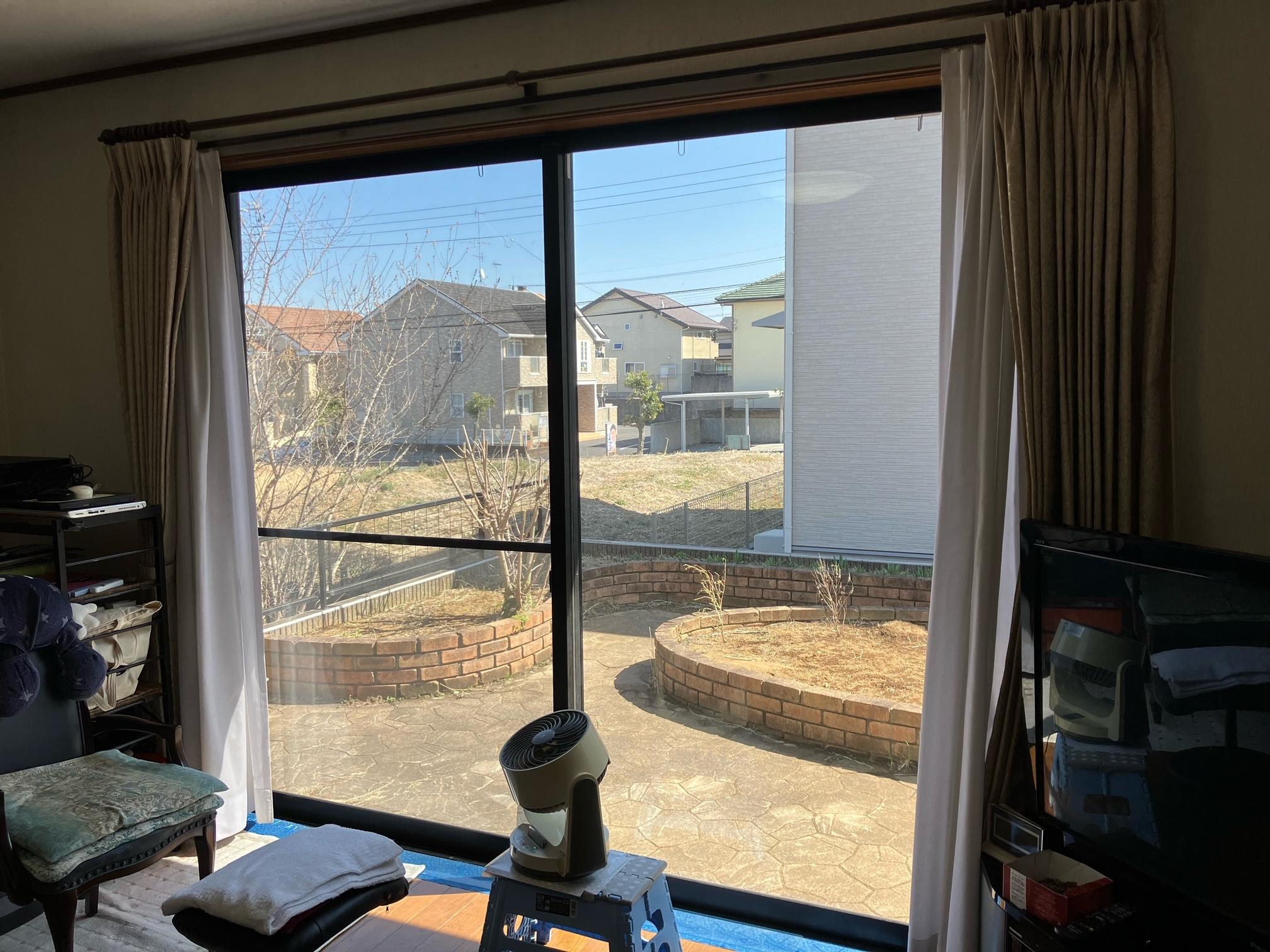 掃き出し窓が大きいためペアガラスにしていますと重たくなって開閉が大変なので内窓は2枚サッシではなく4枚サッシへ