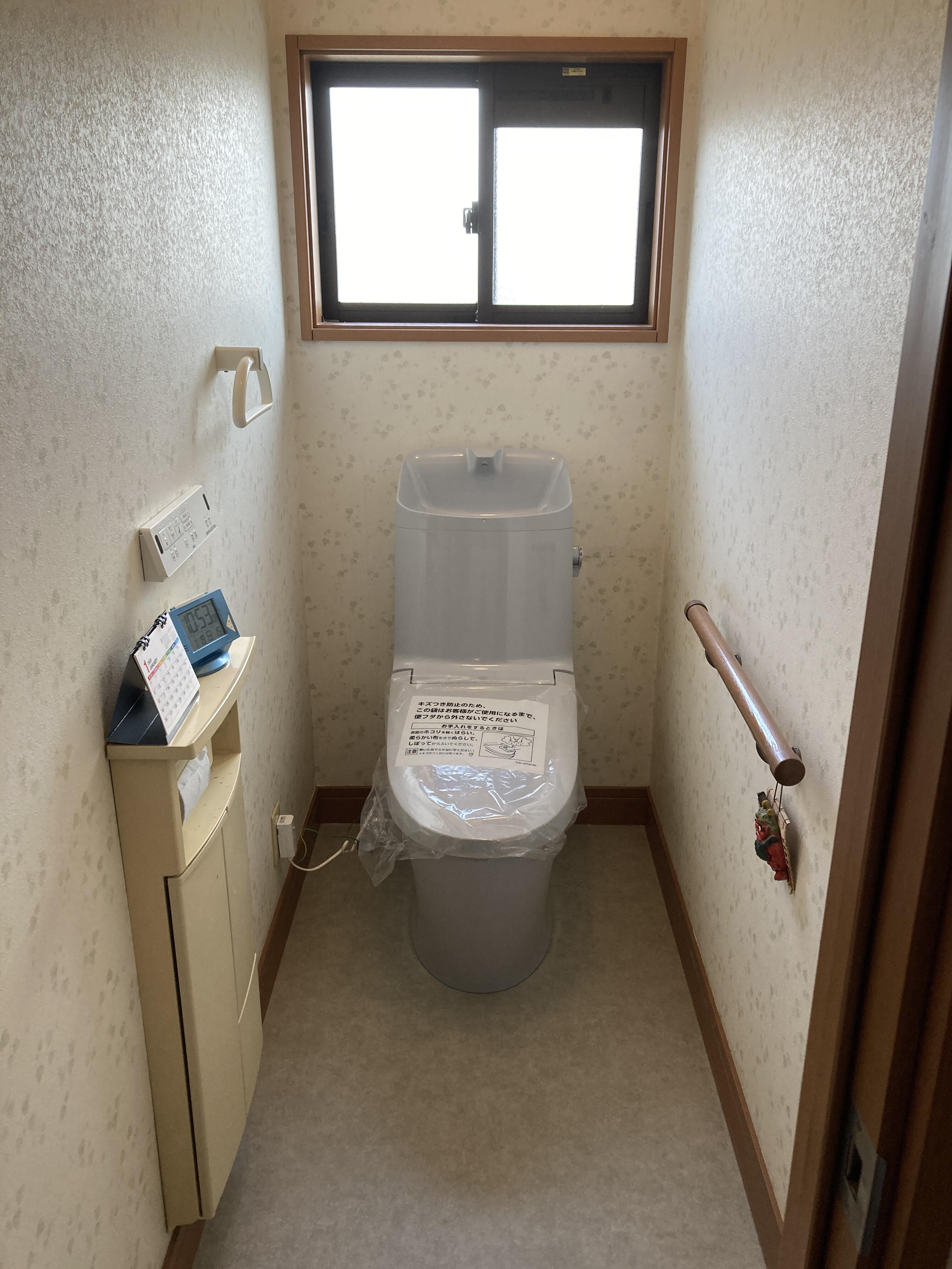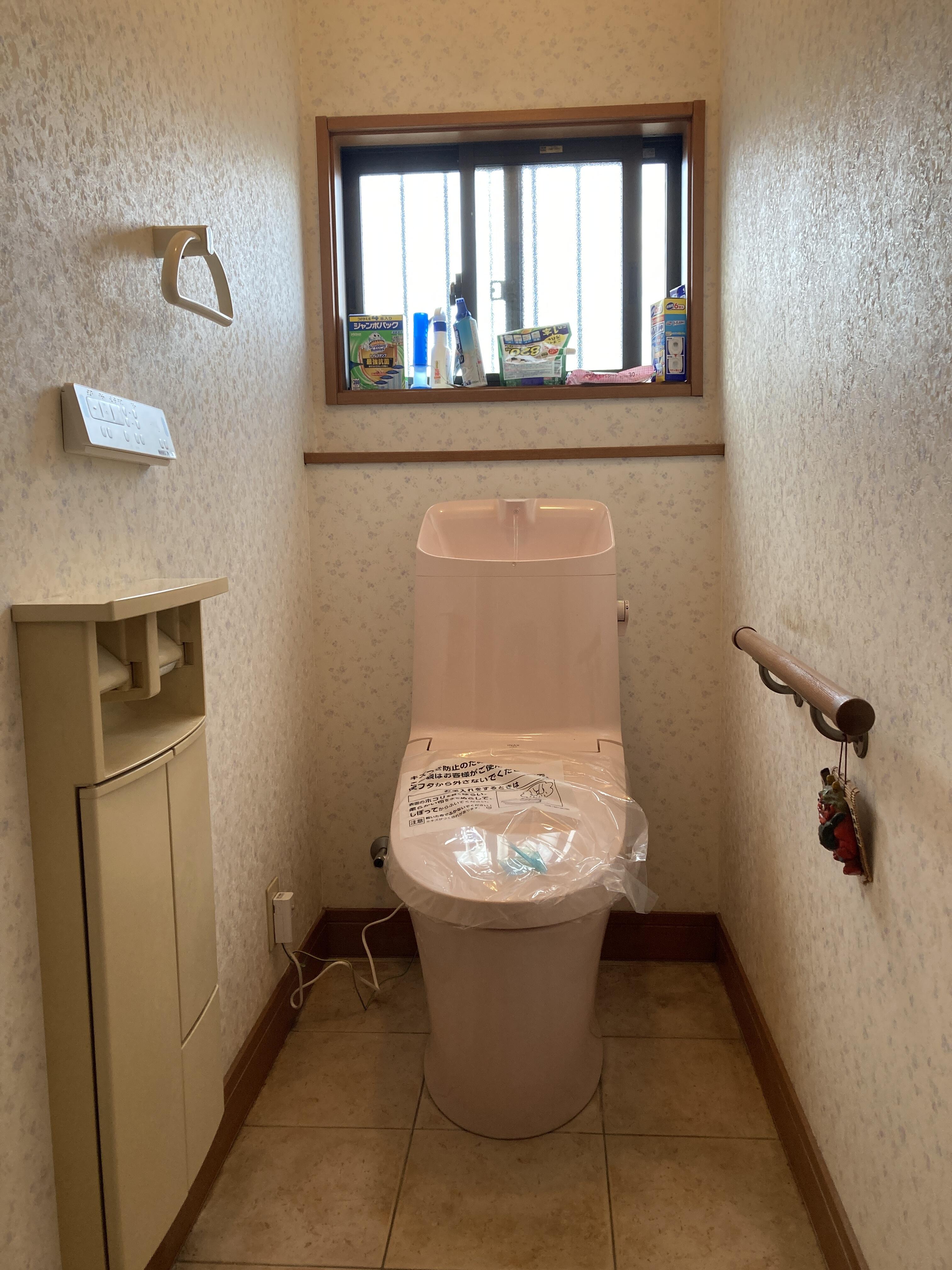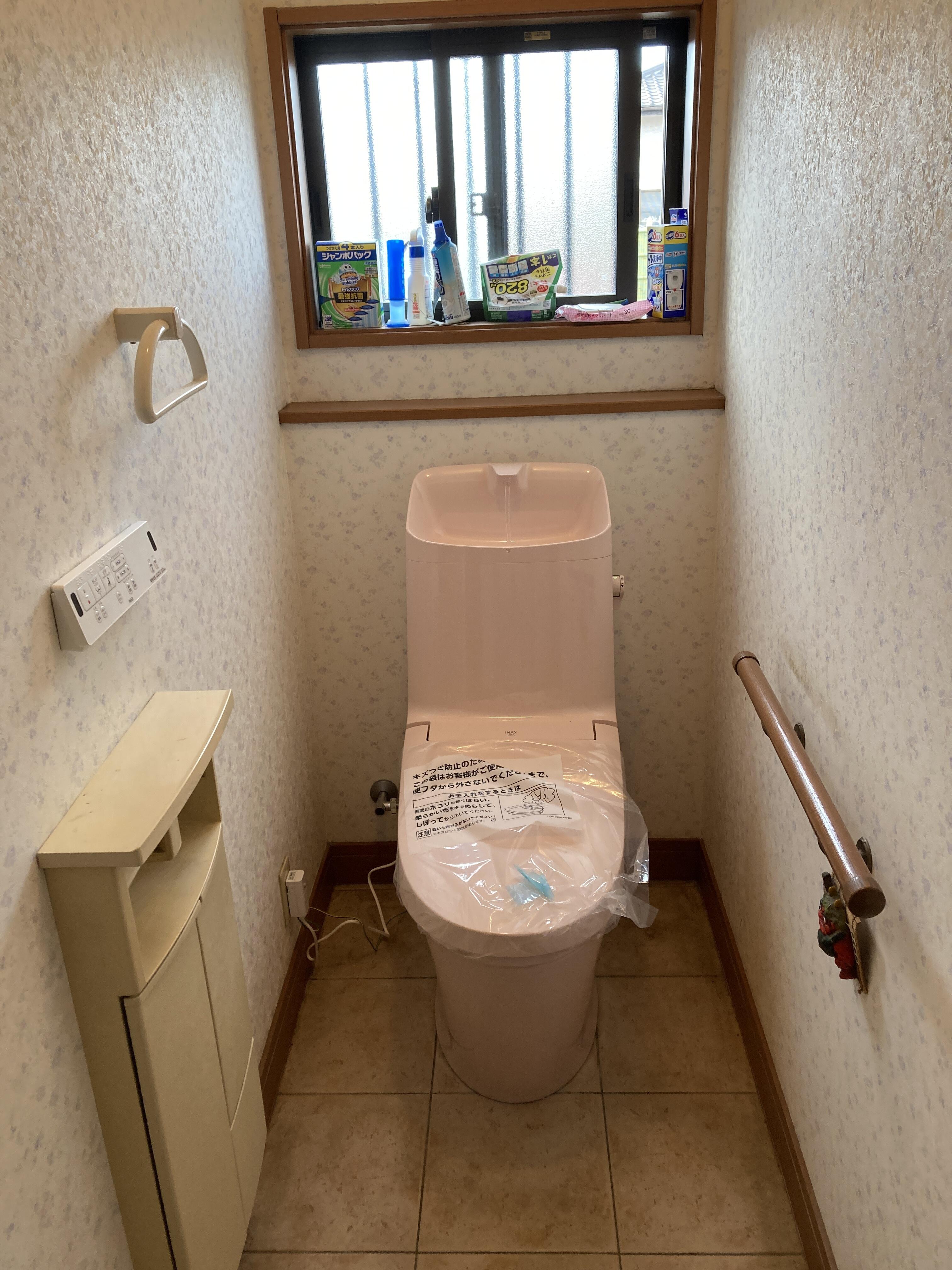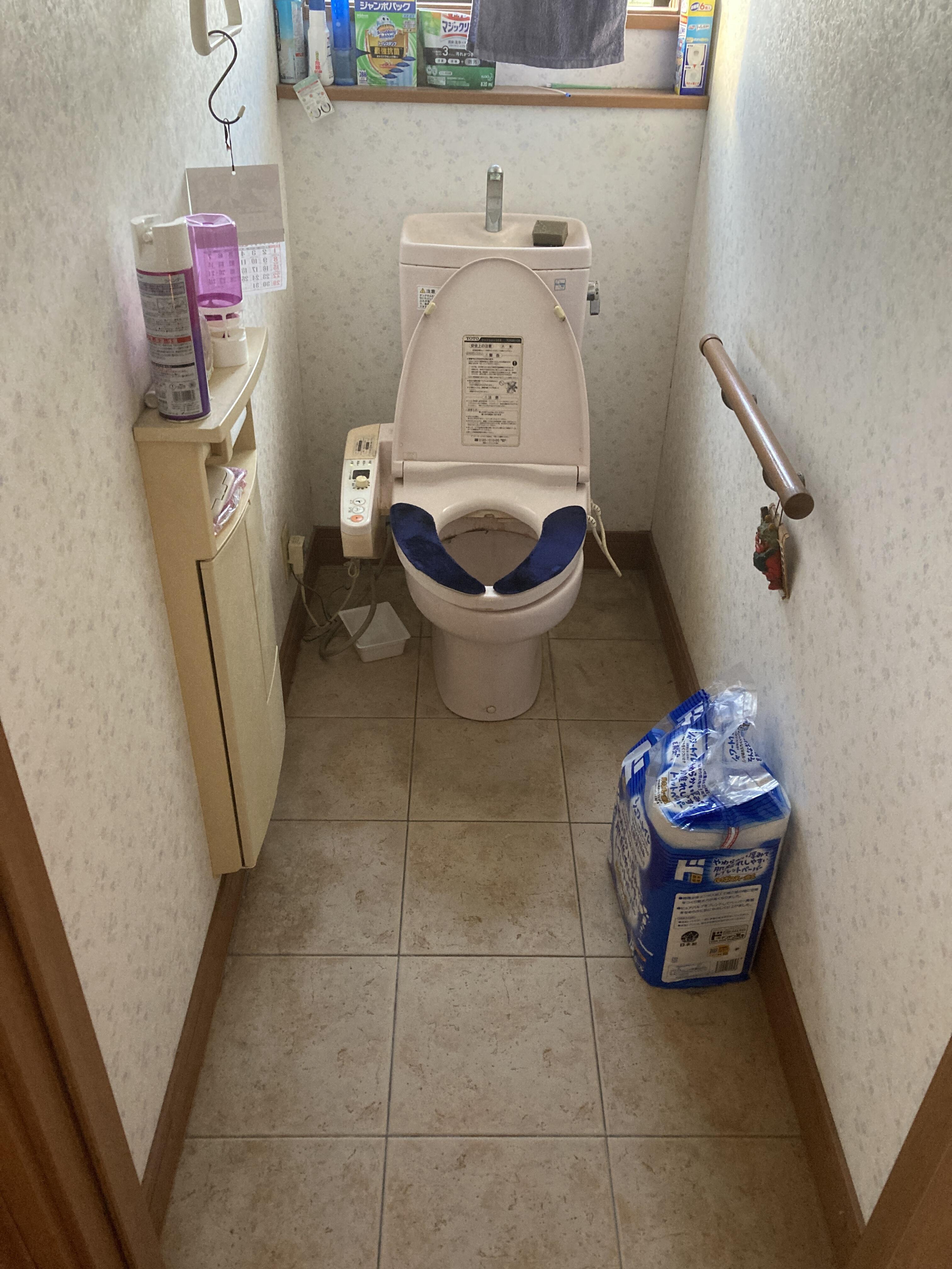 ウォシュレットの水漏れ。21年使っていたため便座だけでなくトイレ事交換することになりました。一体型トイレを実際に見て掃除が楽になるという奥様のご意見でご主人様もご納得されました。