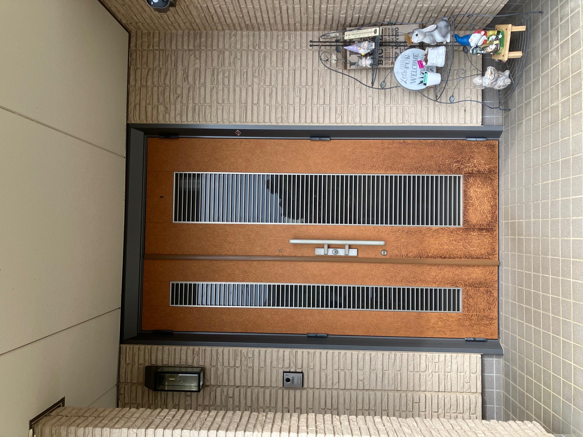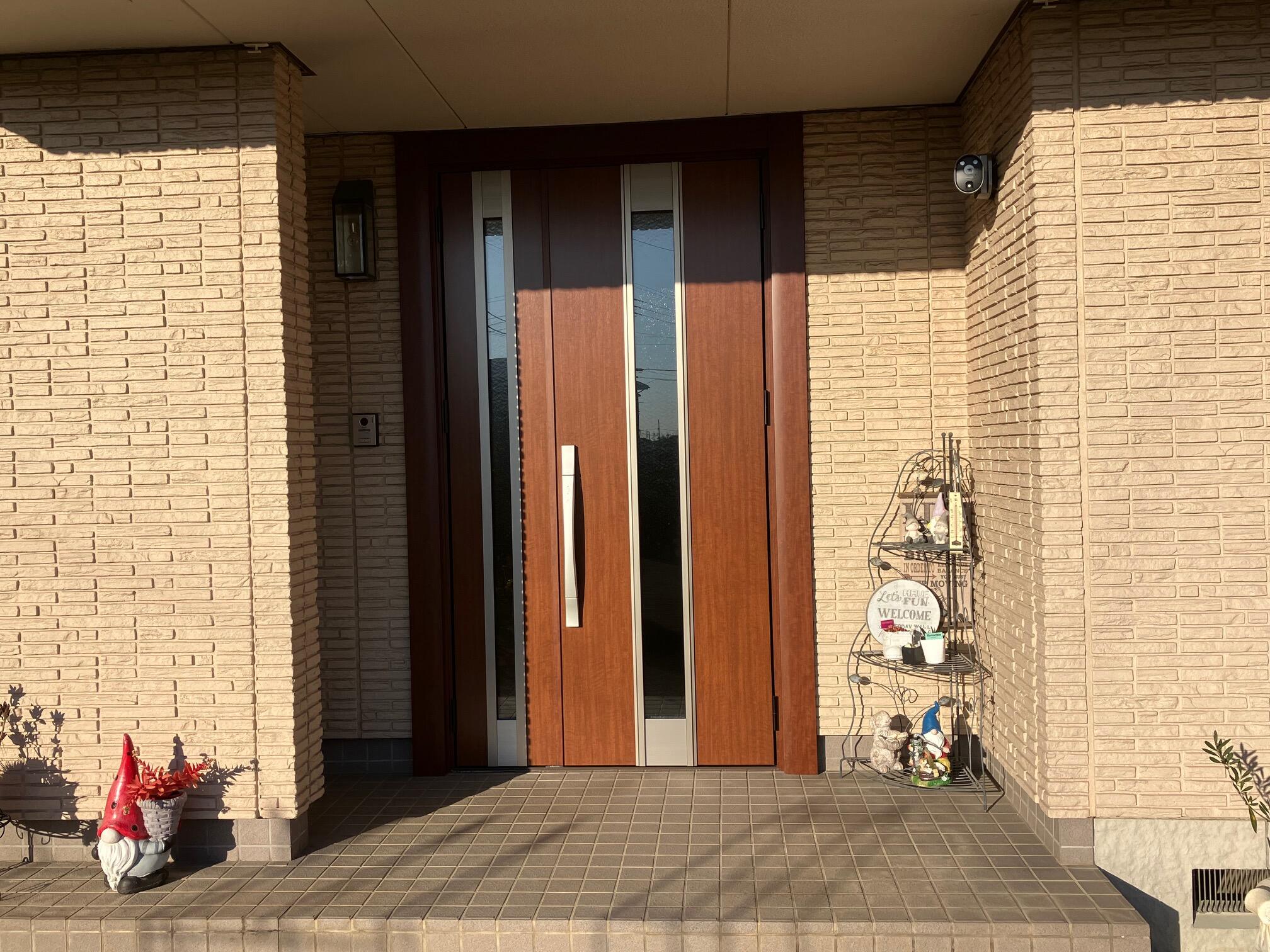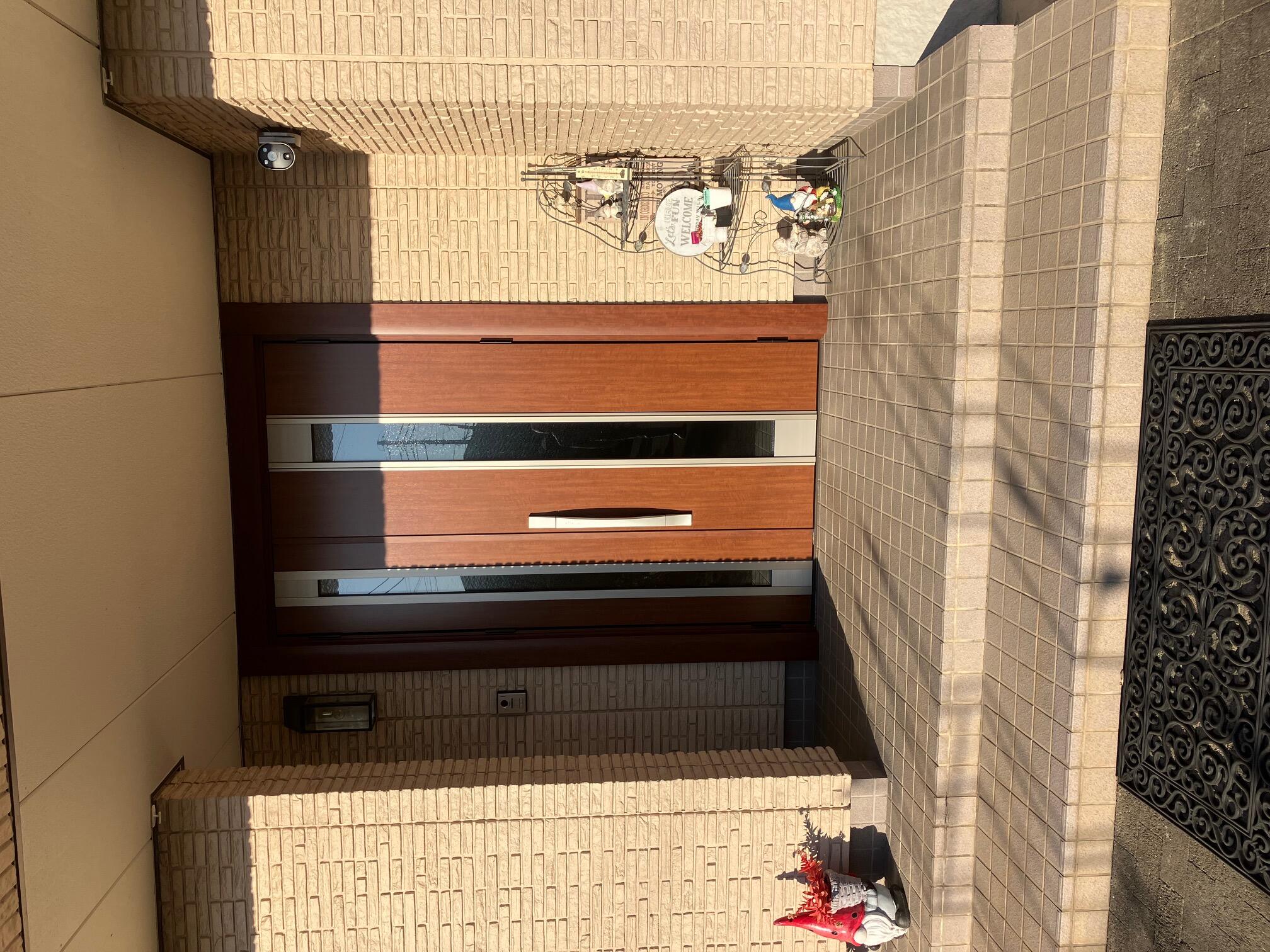 日当たりがよく色あせがひどかったためシートを張ったそうですが何年かしてまた色あせしてしまったため今回は玄関ドアリフォームをしたそうです。 リクシル リシェント玄関ドアM77型、ファミロック(リモコンキー)へ