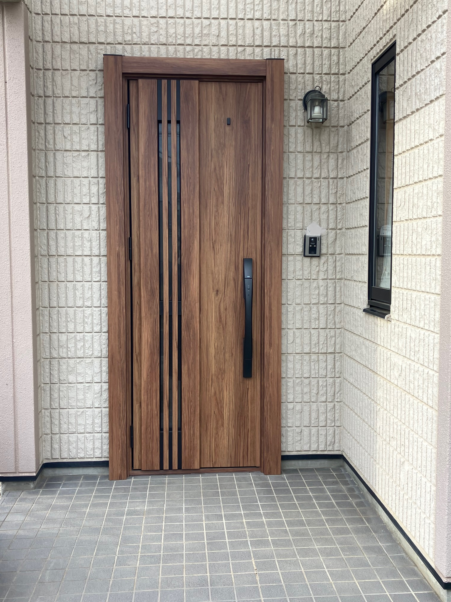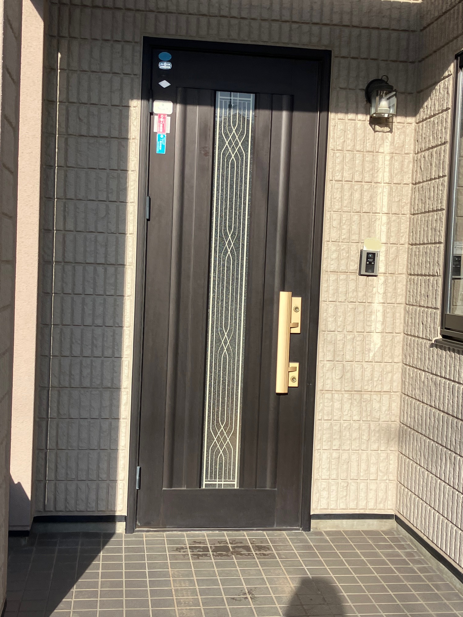 最近強盗、空き巣等のニュースが多かったため不安で玄関ドアを交換したいとの事でした。 お客様希望のLIXIL リシェント玄関ドアM83型(チーク色)へ