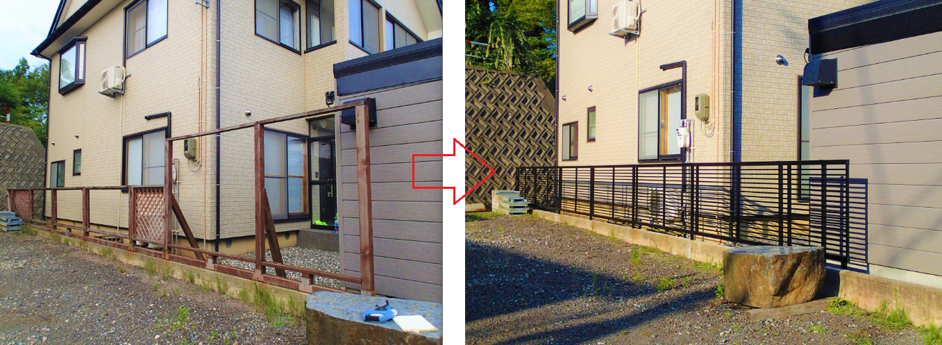 木製フェンスからアルミフェンスになりました。正面のみ2段にして高くすることで、少しリビングが見えずらくなりました。