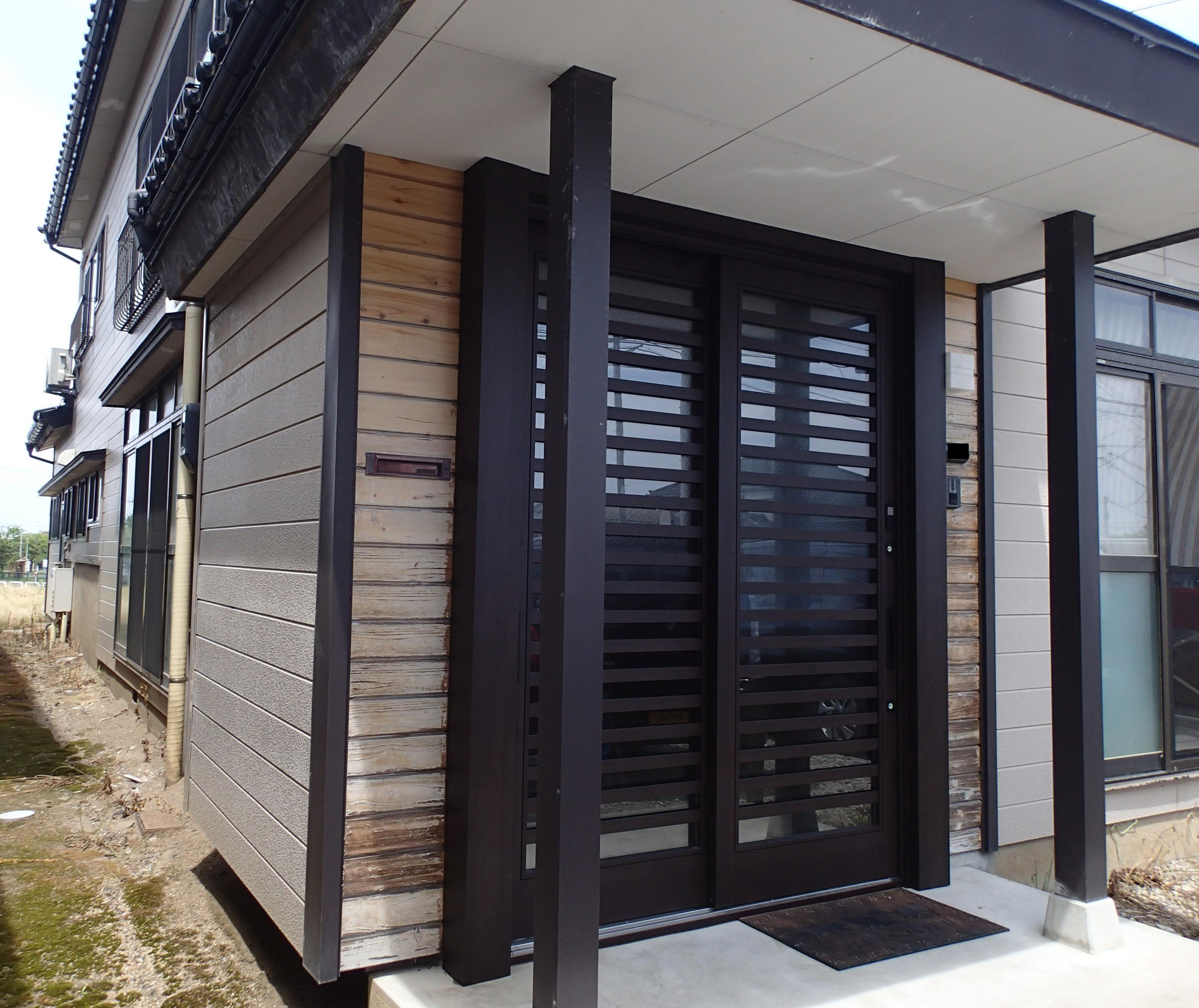 玄関引違戸の入替をご希望でした。 LIXILのリシェント玄関引違戸に入替え、電気錠(タッチキー)でドアのボタンを押すだけで鍵の開け閉めが可能となりました。 ガラスはペアガラスで断熱性能にも優れています。玄関のポーチ柱の色とも合って素敵になりました。