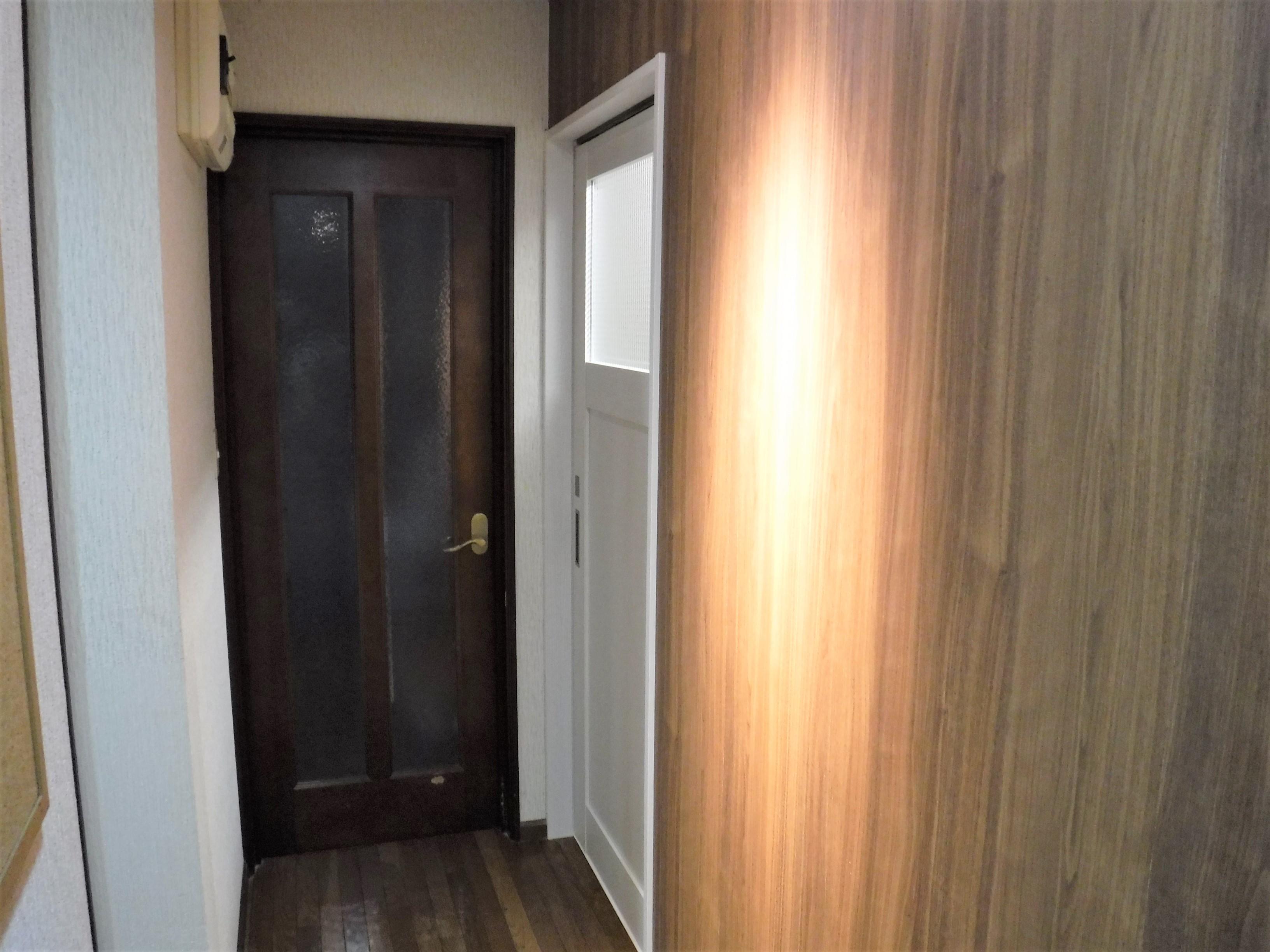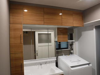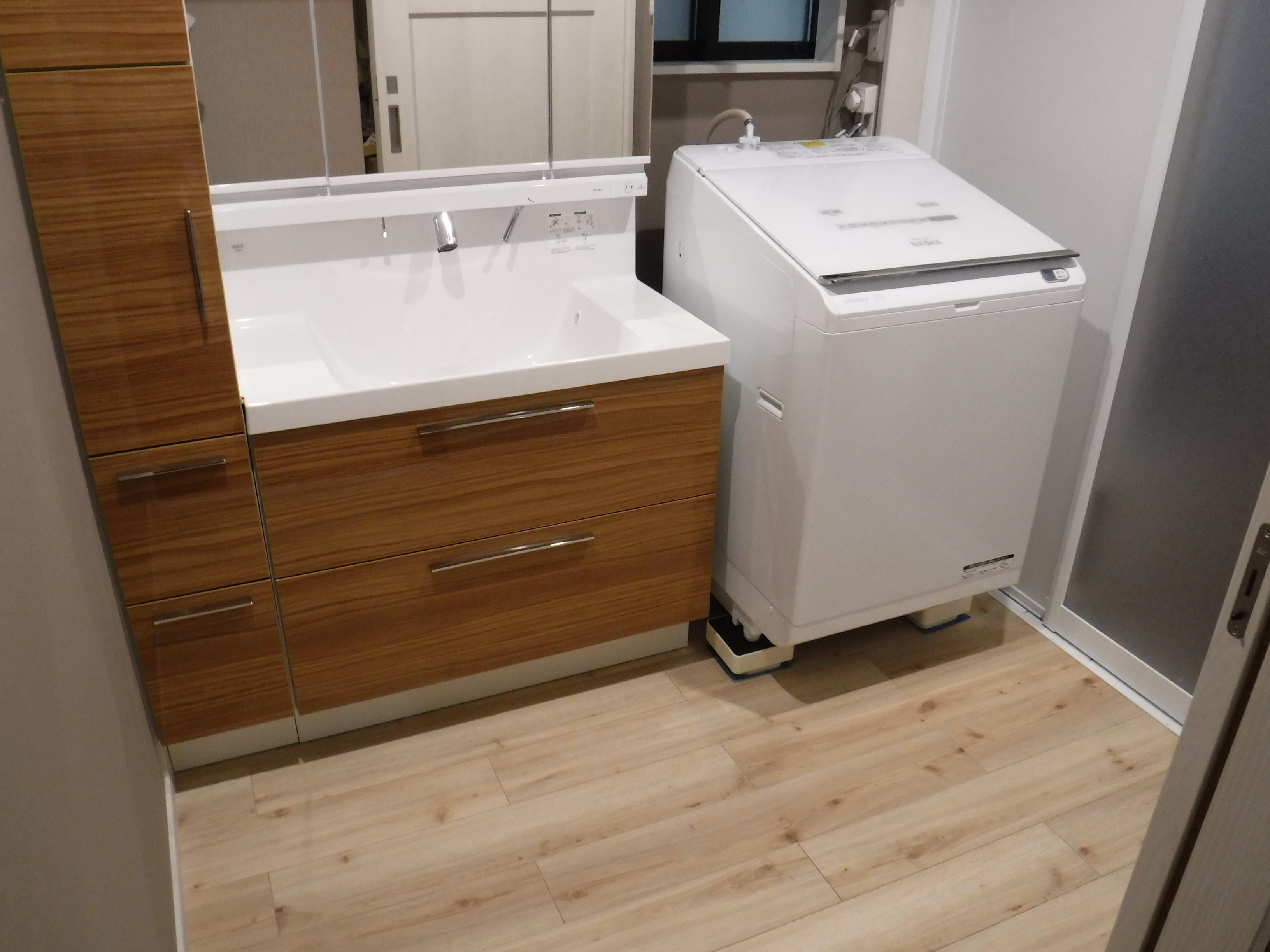 UBは引戸にして出入りしやすいです。 洗面台LCは、奥行きが500㎜と薄型なので、脱衣室のスペースが少しひろくなります。 また、LIXILの床タイルはオーク柄で、自然な風合いが表現できました。