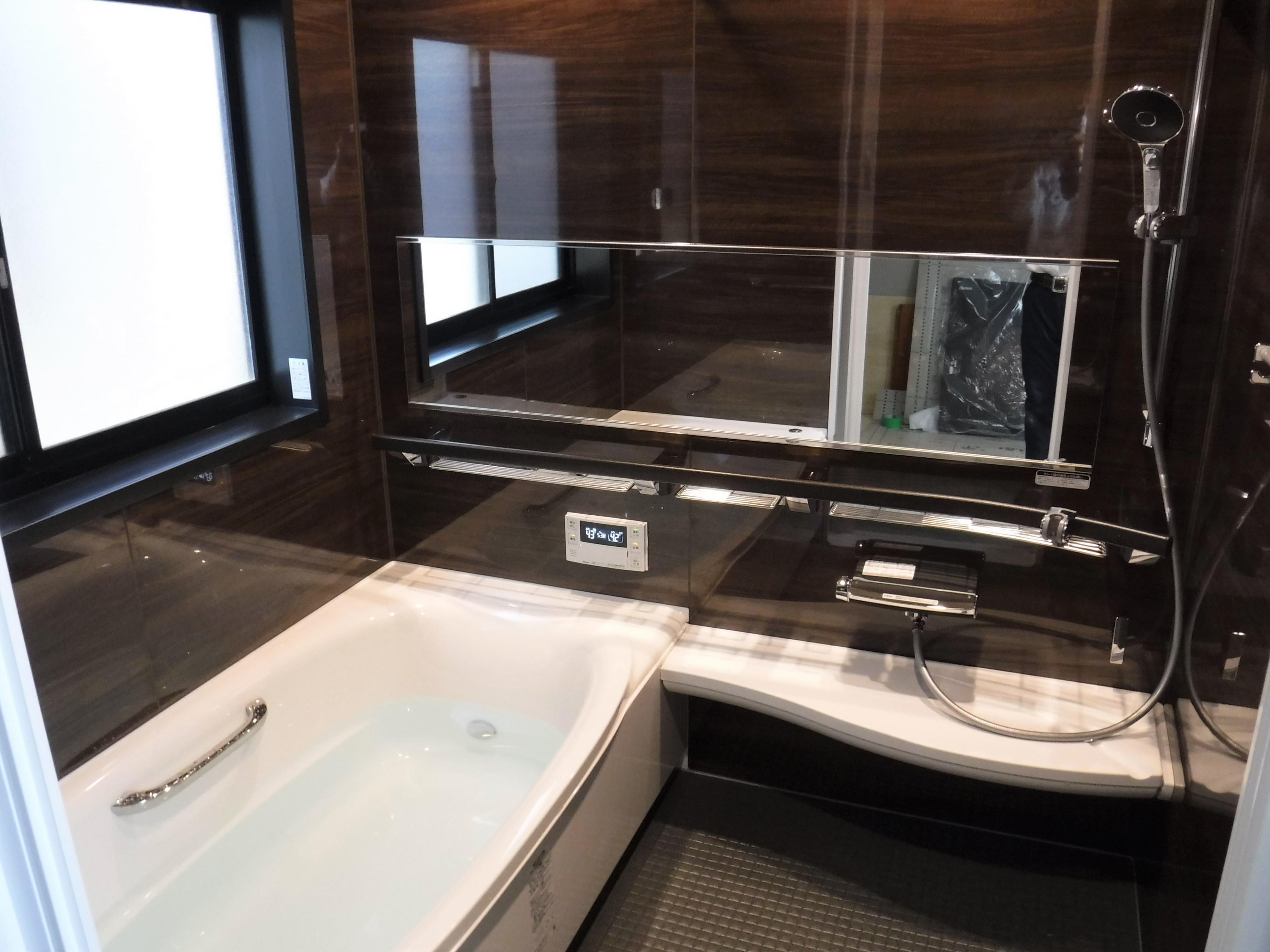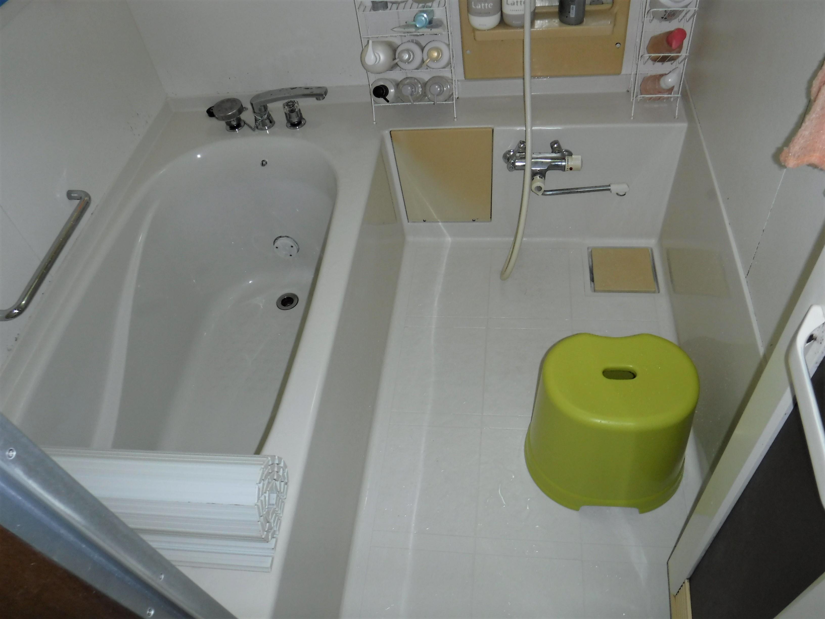 UBは入口に段差があり、古くなって使いづらいというお悩みでした。 段差は解消し、正面のエスコートバーは浴室の出入りの手摺にもなる他、収納部も備えています。 浴槽のミナモ・パールクォーツは、表面が平滑でツヤがあり、美しい人工大理石です。