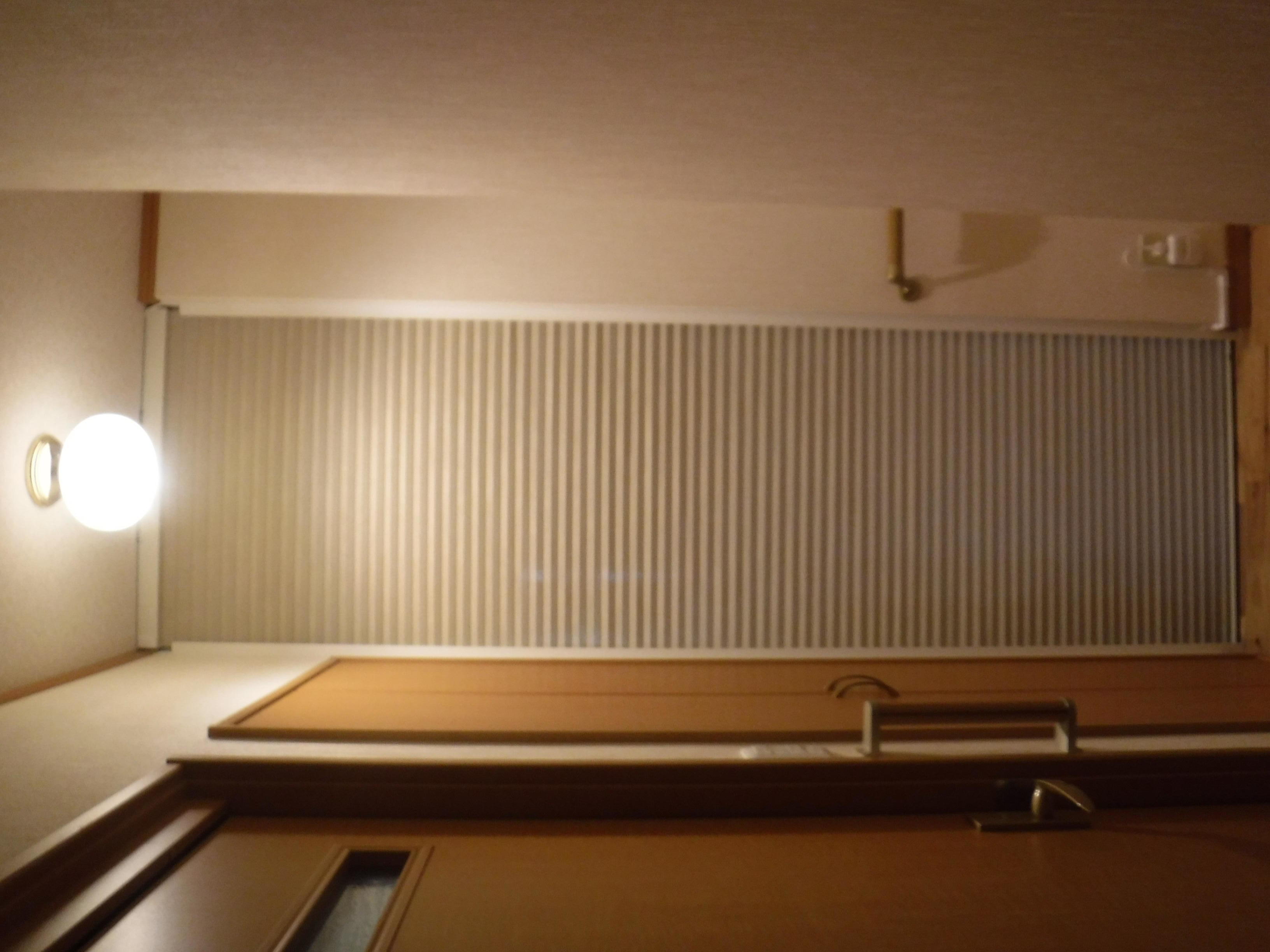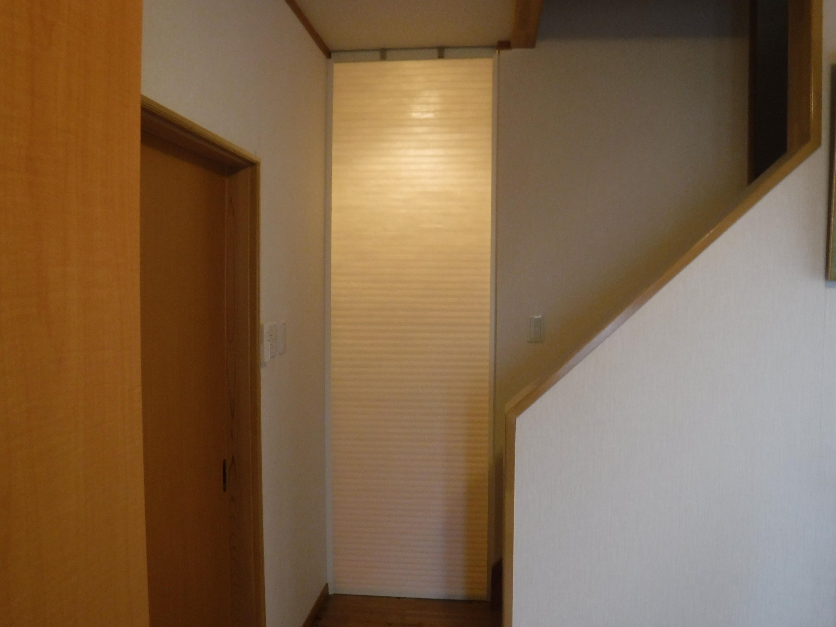 玄関からの冷気が廊下に流れ、トイレや家の中を移動する際の廊下の冷え込むのを何とかしたい。とご相談いただきました。 玄関ホールと廊下入口の間に、簡易間仕切りの電動スクリーンを設置。夜間や移動が少ない時間帯は閉めておくことで、玄関ホールからの冷気が流れにくくなりました。 リモコン操作で簡単に開け閉め可能です。