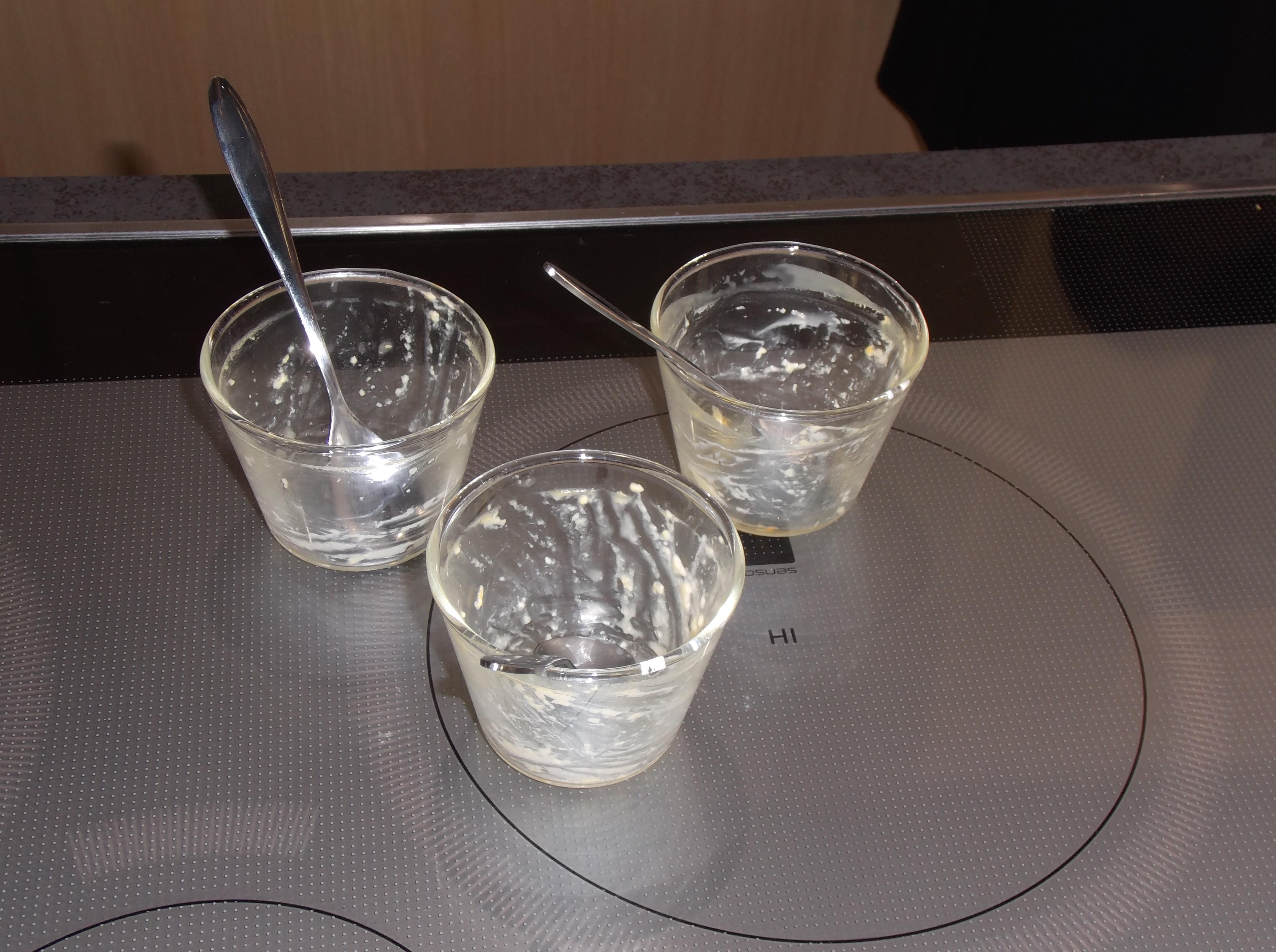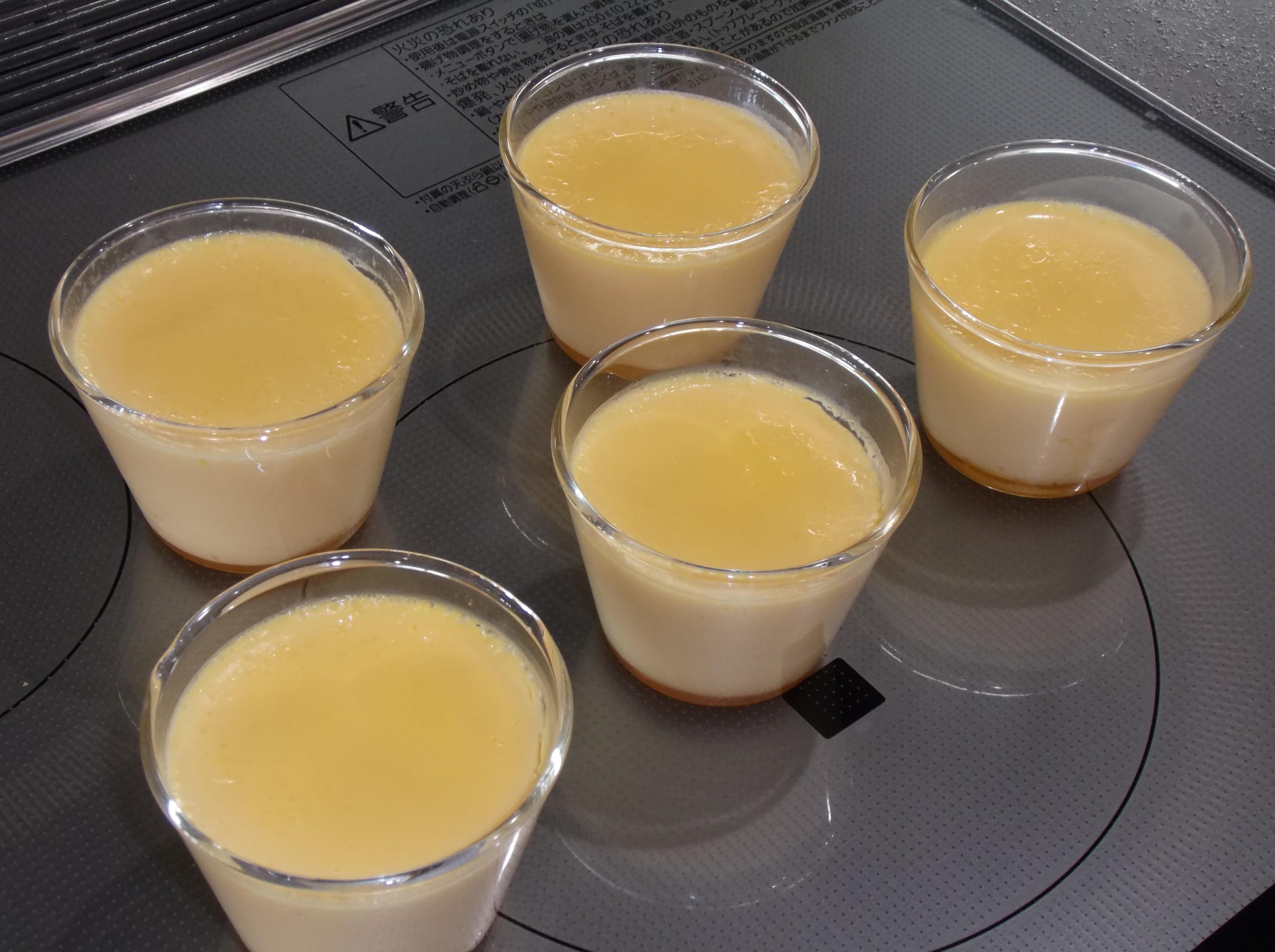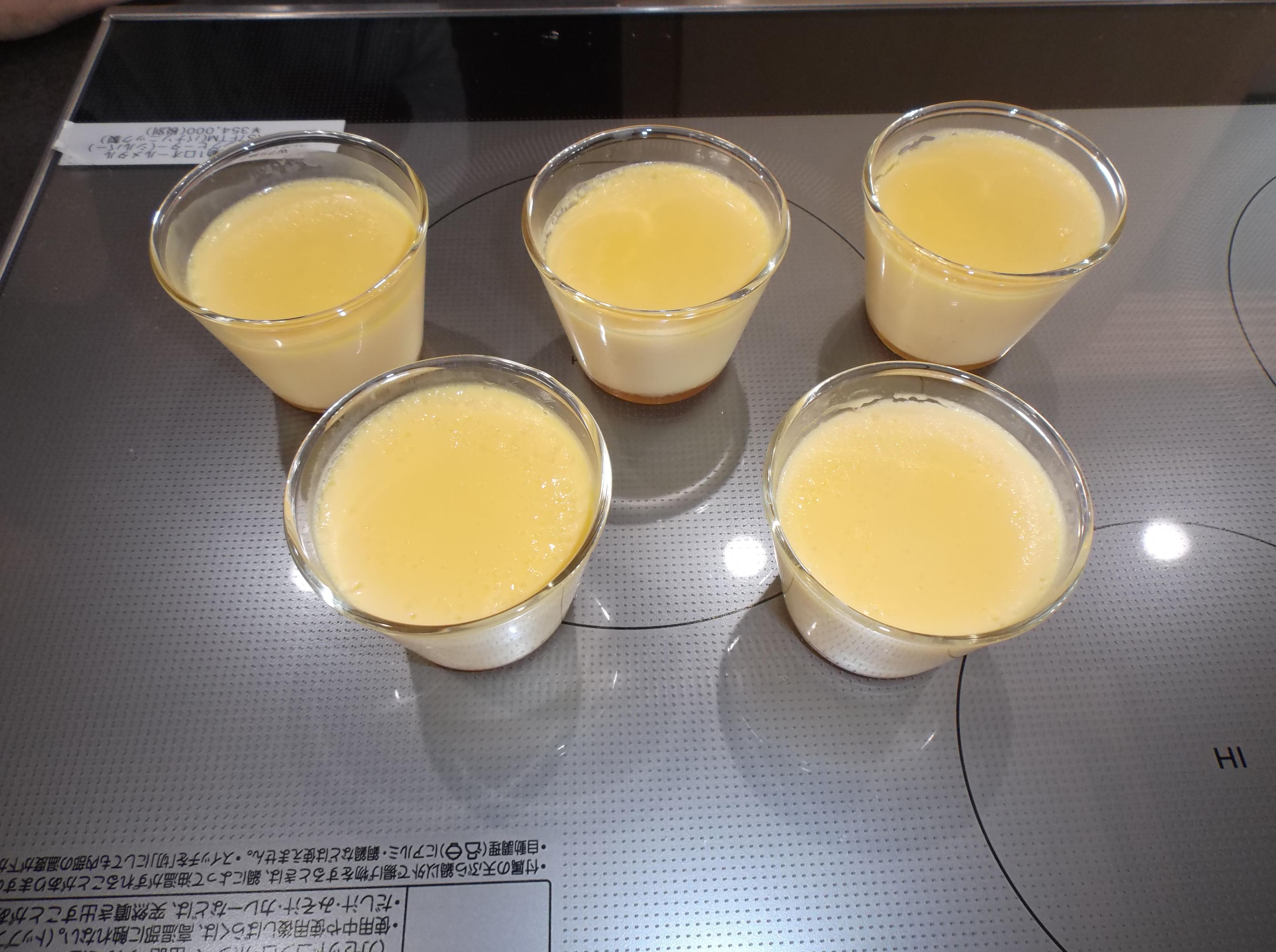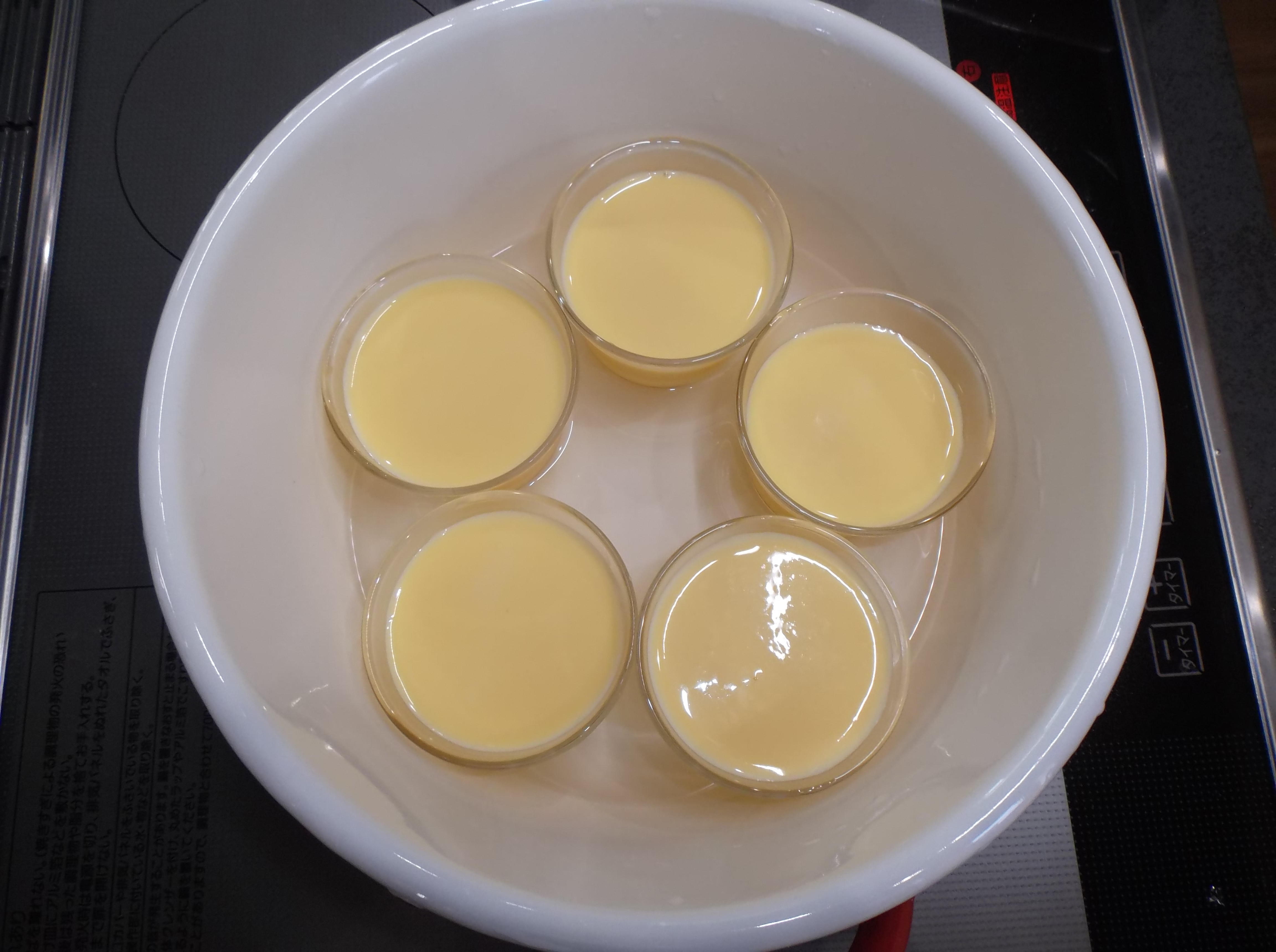 ⑤ 大鍋に④を並べて耐熱容器の半分の高さくらいまでお湯を入れ、フタをして3分。その後、保温で30分。その後、冷蔵庫で冷やして、完成です!!!