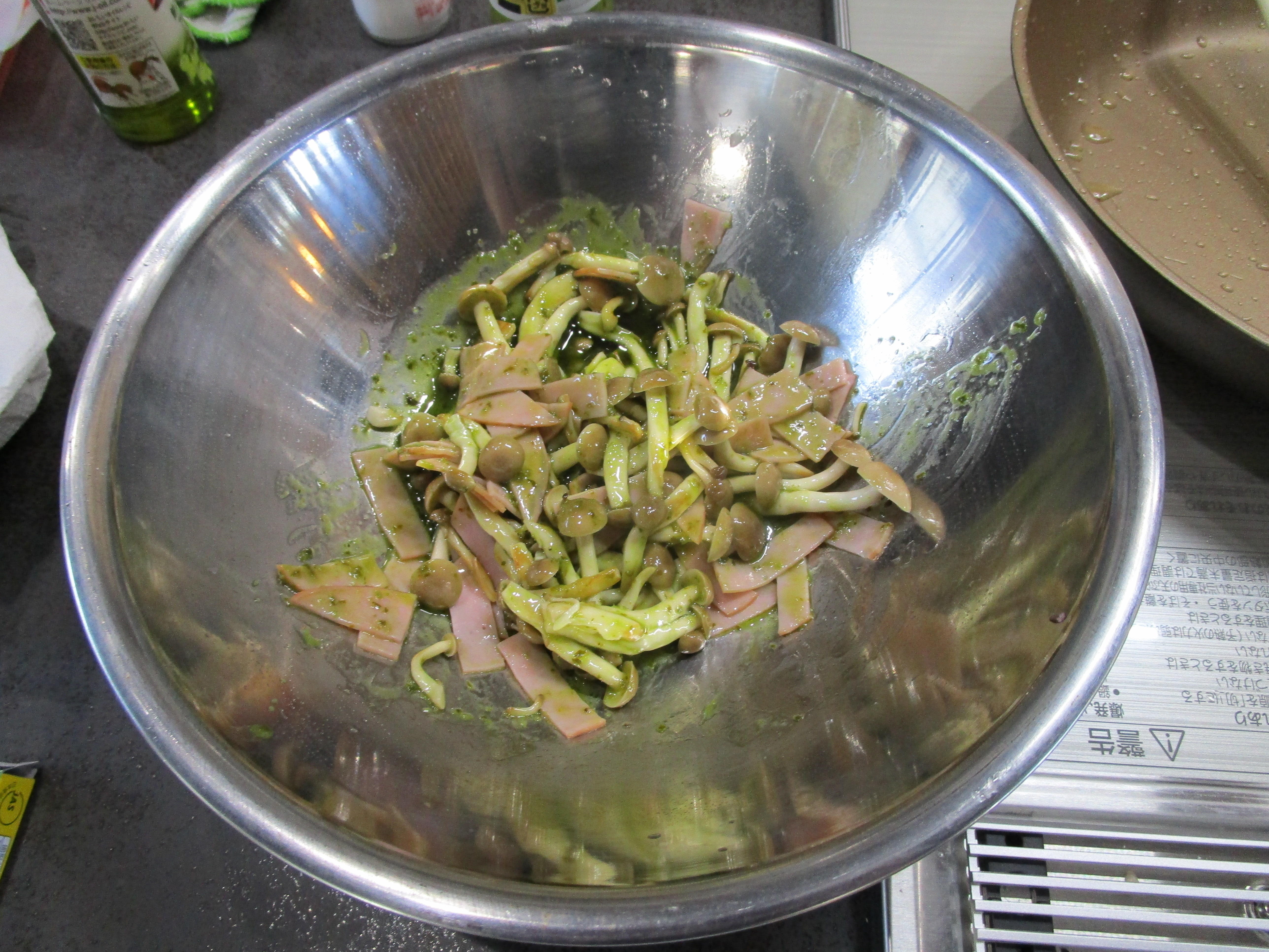 ② その間にしめじをオリーブオイルでソテー火が通ったらボールに移す