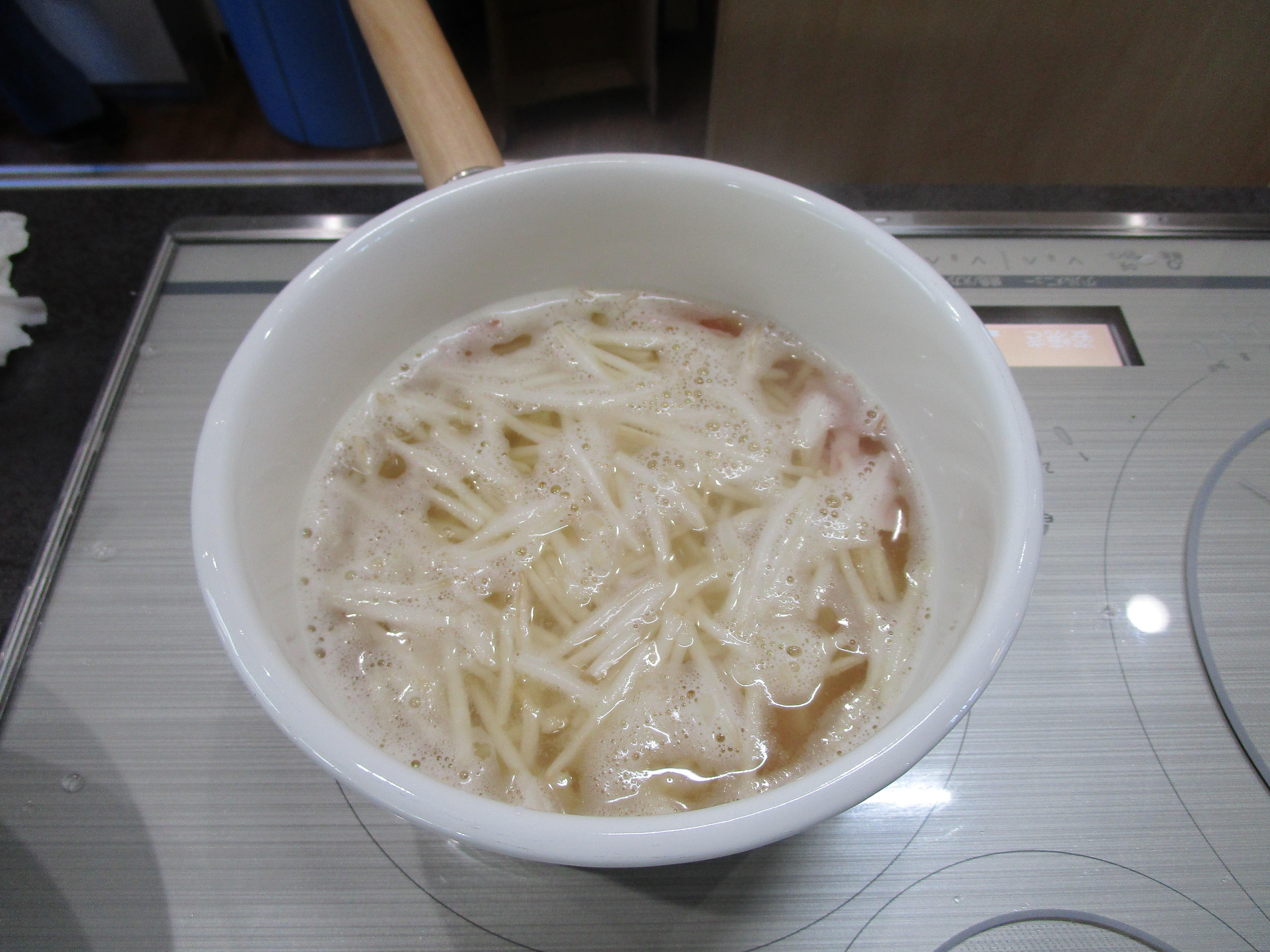② 鍋に水4カップと固形スープの素を入れて強火にかけ、煮立ったらもやし、ベーコンを加える。