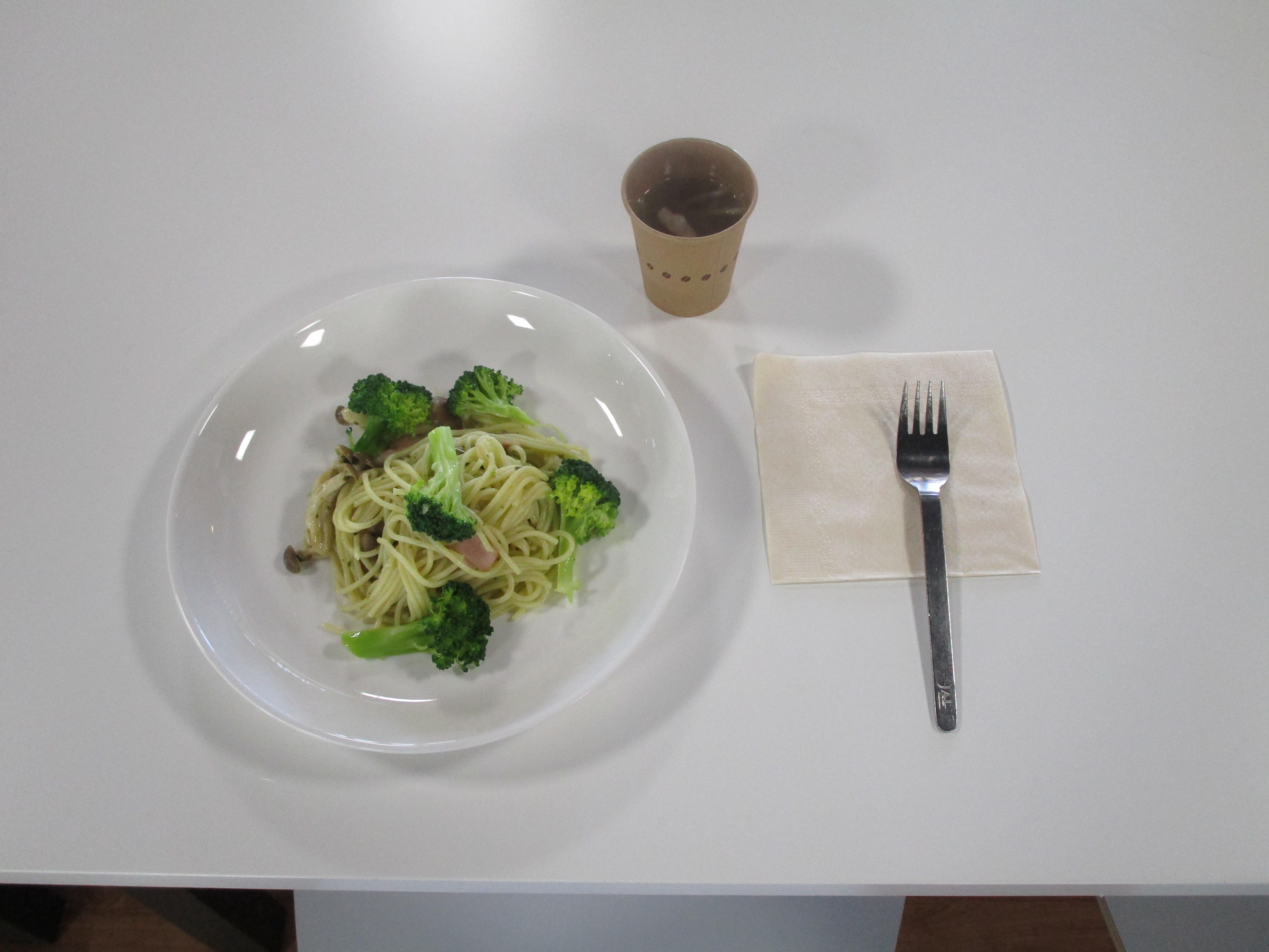 パスタ100g、ブロッコリー適当、塩少々、シメジ適当、ハム適当、オリーブオイル適当、バジルソース適当 です。