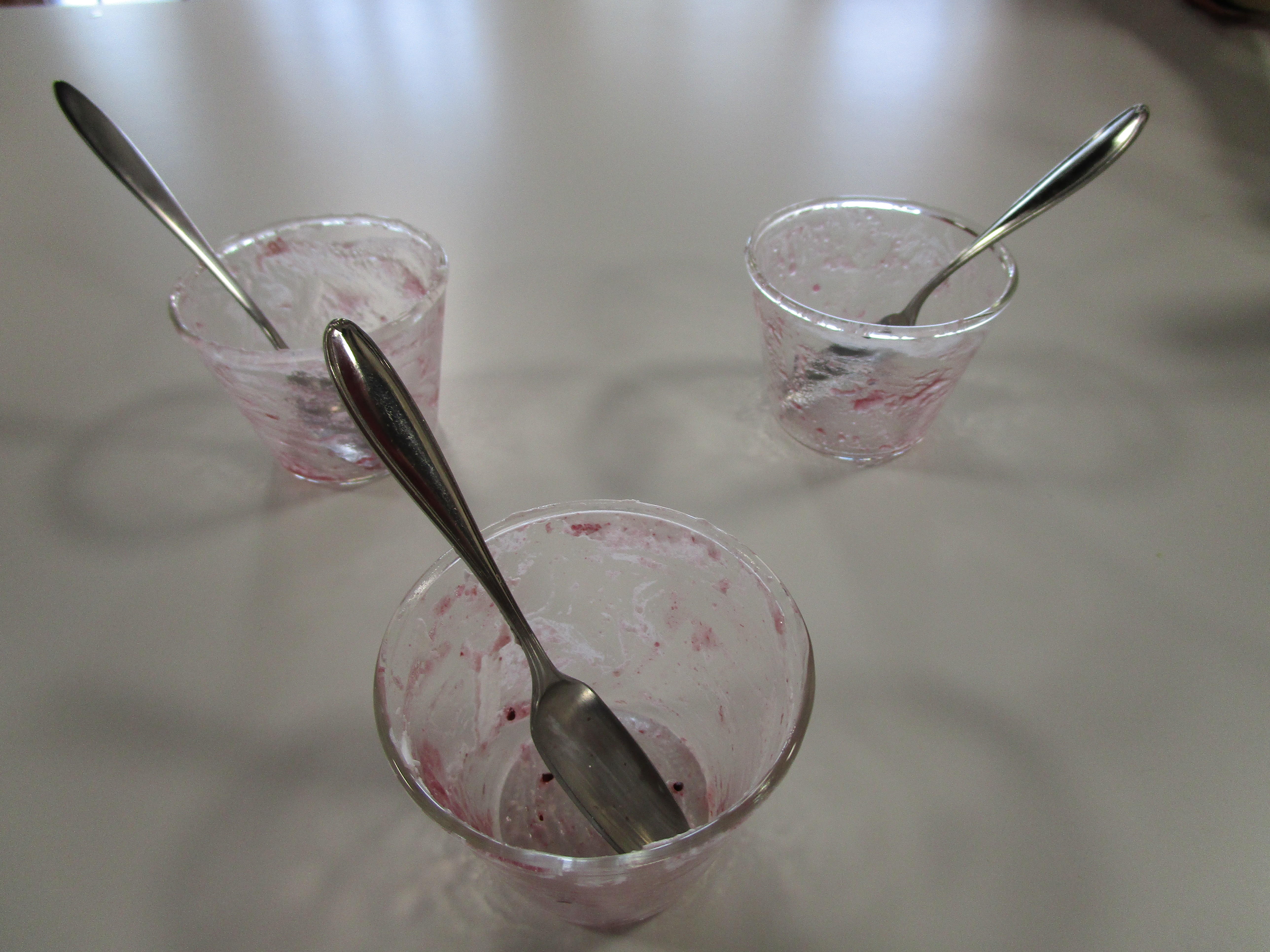 ② もう一つのボウルに冷凍カシスを入れ解凍したらつぶします。グラニュー糖を入れ、軽く火にかけます