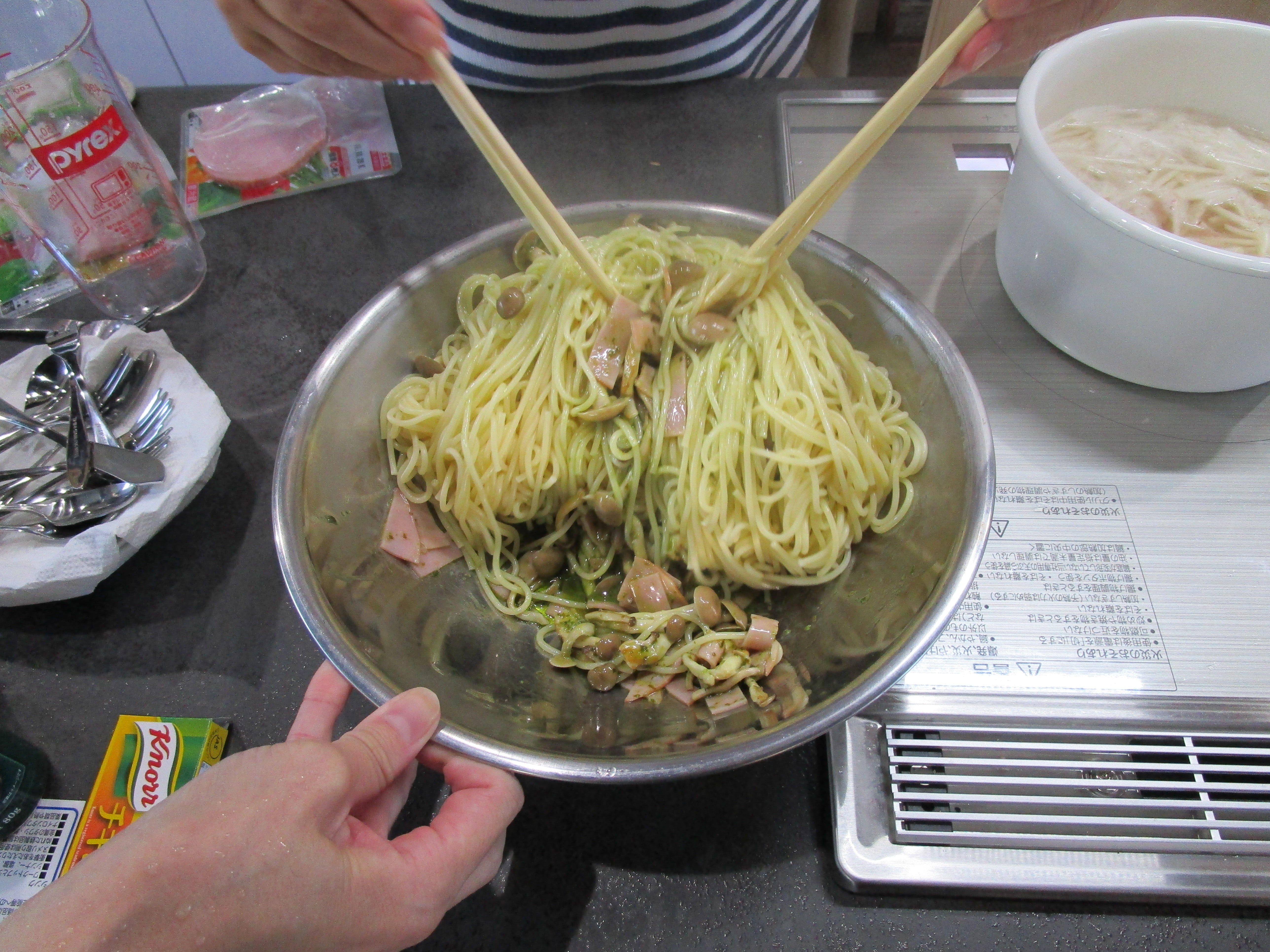 ⑥ 茹であがったパスタを①の中に入れて混ぜる
