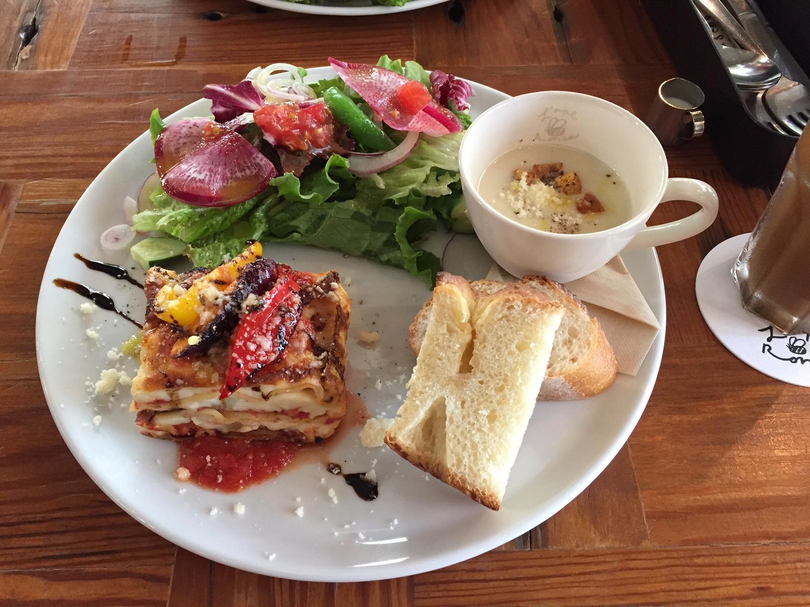 ラザニアのほか、サラダ、パン、スープがワンプレートに!