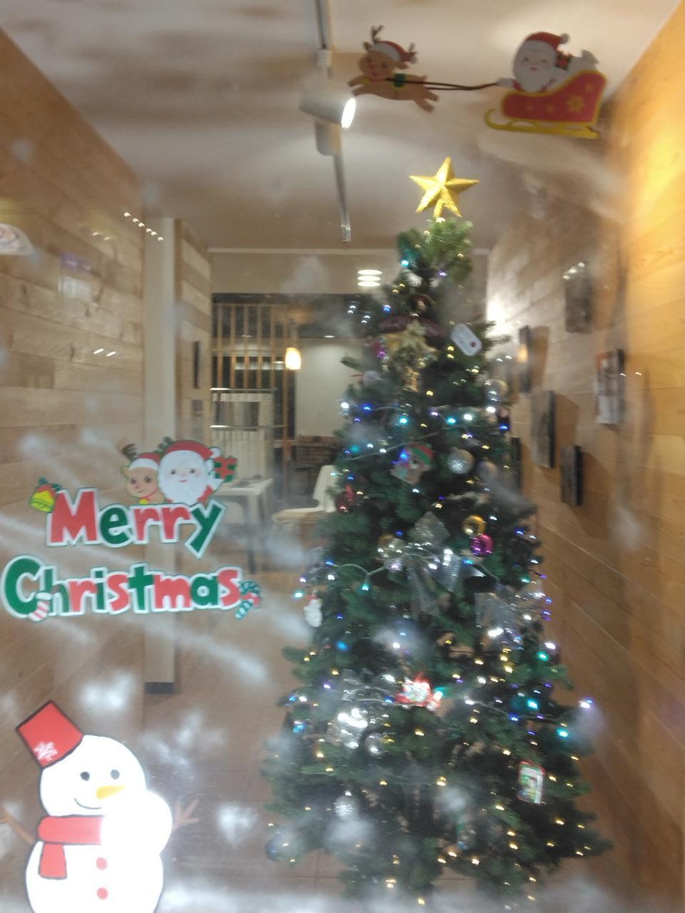 結城店の事務所を覗くとガラスに飾ったクリスマスがキレイですよ!