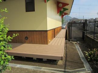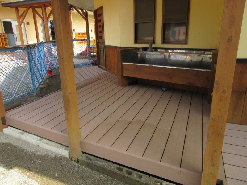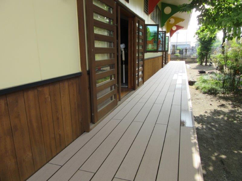 園内のウッドデッキを設置。子供たちにも安全な『樹ら楽ステージ』にしました。樹ら楽ステージの特徴は、①腐食、シロアリに強い、②美しい木の色が長持ち ③干割れがでないからお子様にも安心 ④メンテナンスが簡単 ⑤表面温度が熱くなりにくい などなど…子供たちは大喜び。たくさんの笑顔に囲まれて設置されています。