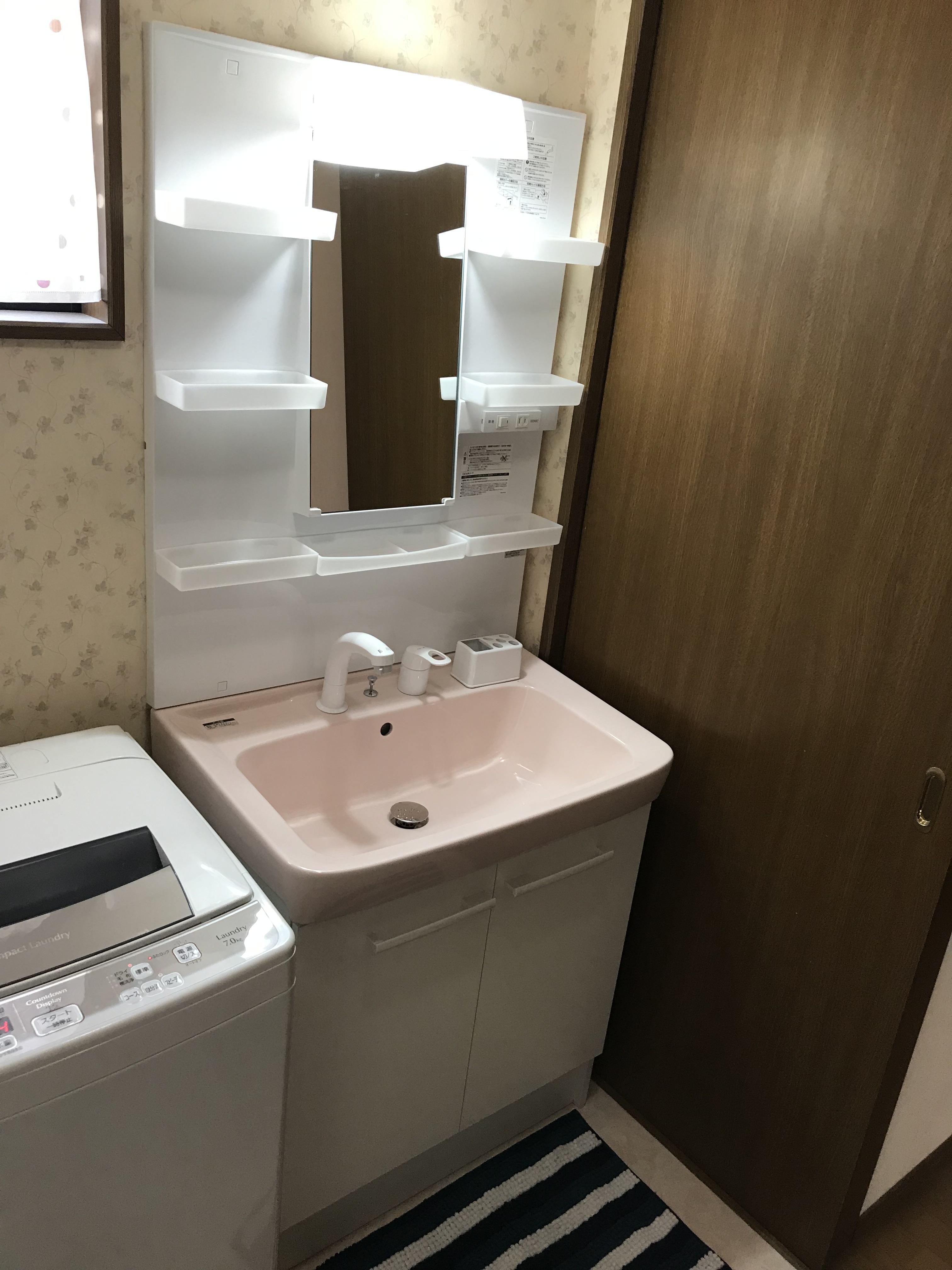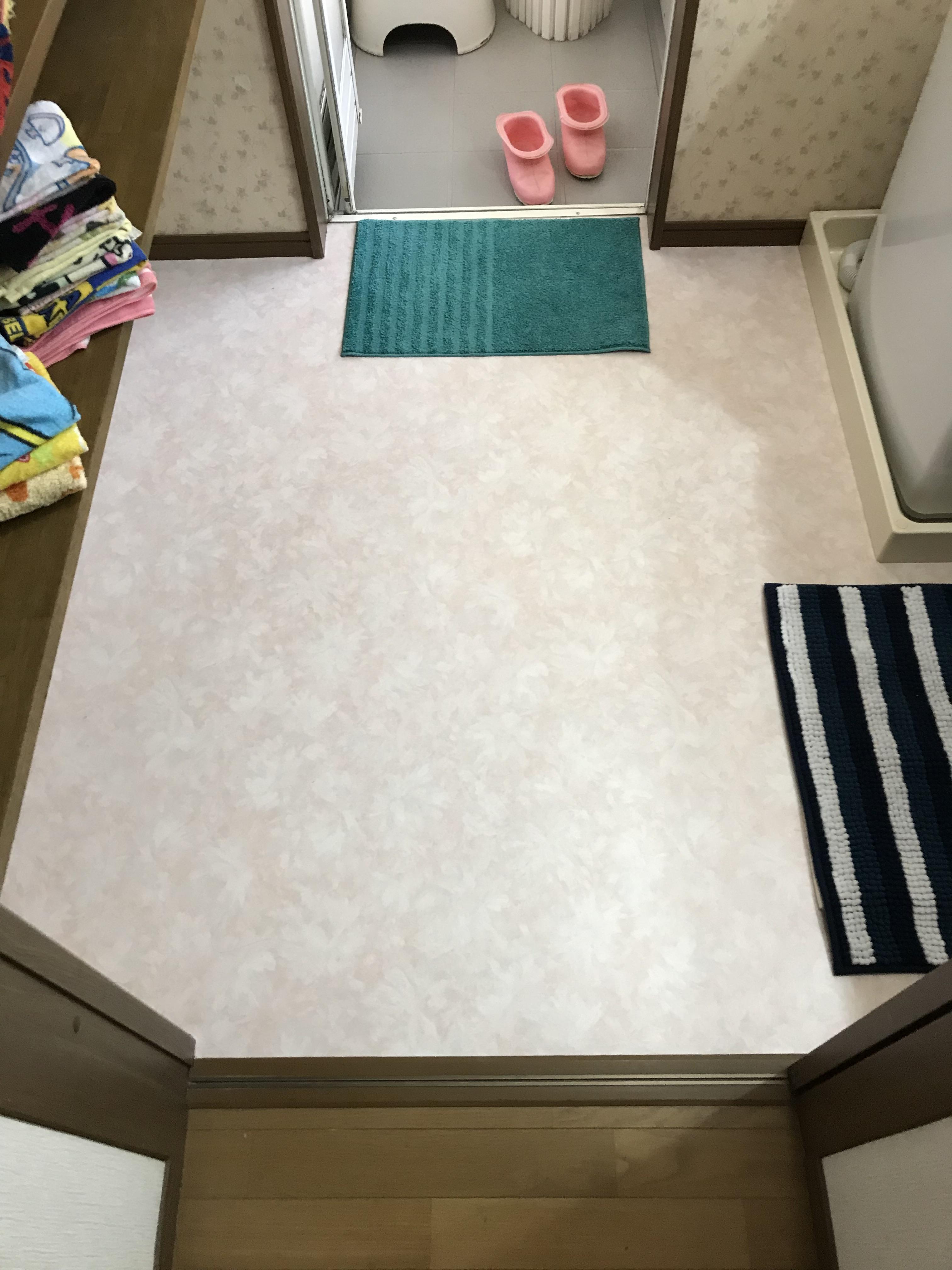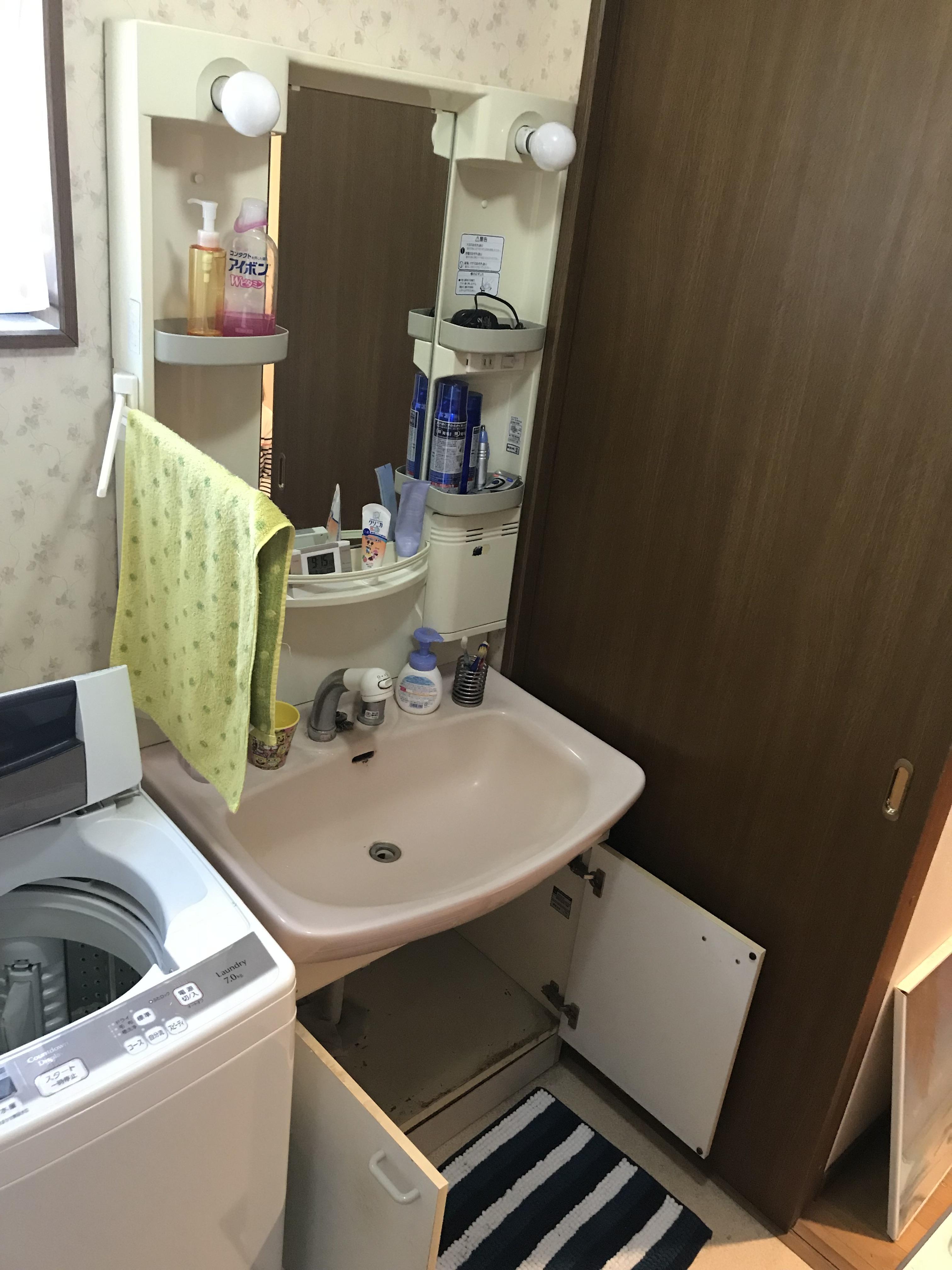 片づけるつもりで下部収納の扉を開けたらビックリ!この間は気づかなかったけど、収納の中が水びだしに…!驚いて石島建設にお電話くださった奥様も大変慌てた様子。そして、洗面化粧台と洗面脱衣室の床を張り替えました。安心しました、とご満足いただく工事となりました。