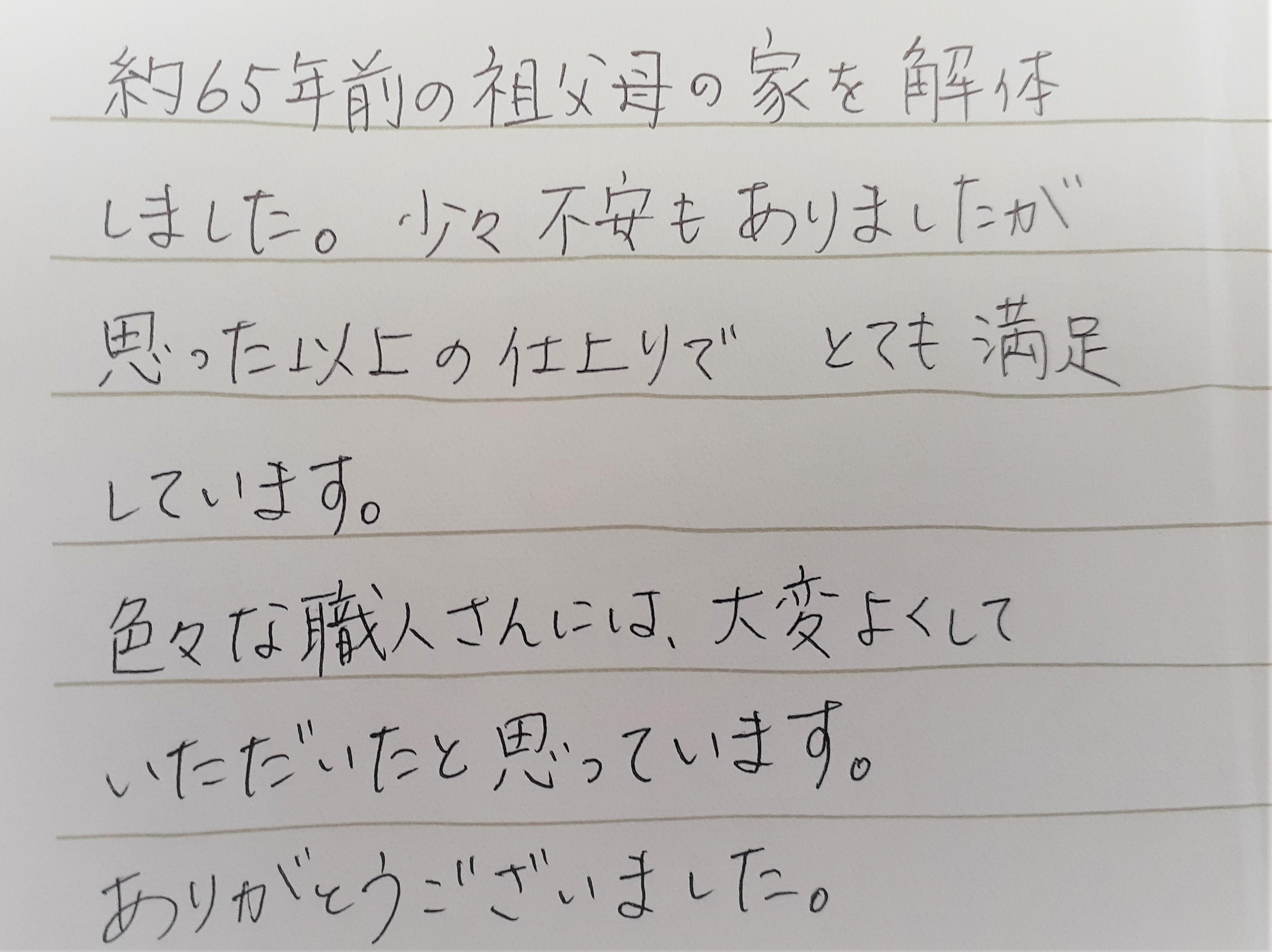 お施主様直筆のコメントをいただきました。 ↓↓↓ご覧ください。
