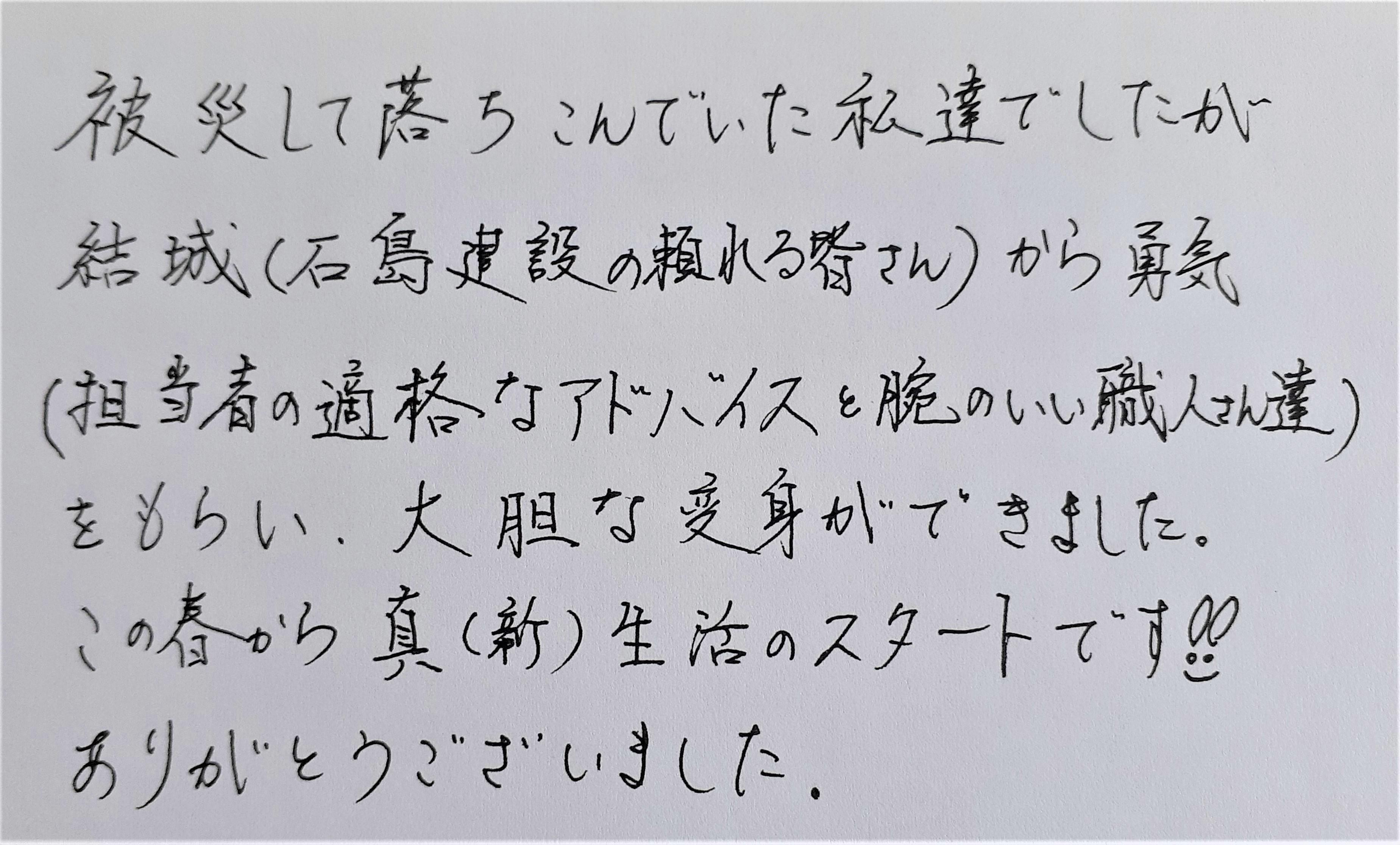 リフォームのきっかけは、被災という大変な出来事でしたが、気持ちを一新していただけて、私たちも嬉しいです。 これからの快適な生活を心から願って、お手伝いをさせていただきました。 この度は、弊社に工事を任せていただき、誠にありがとうございました。 今後は、お住まいのことでしたら何でもご相談ください。よろしくお願い致します。